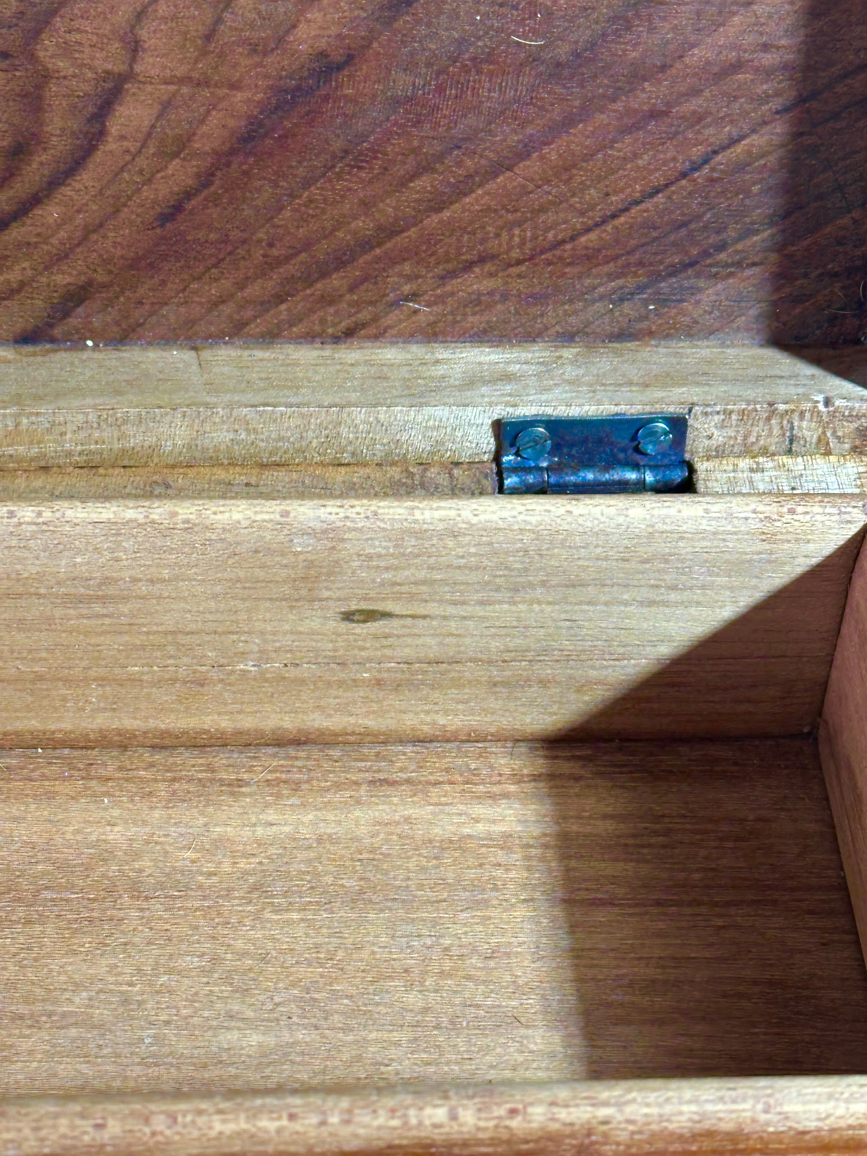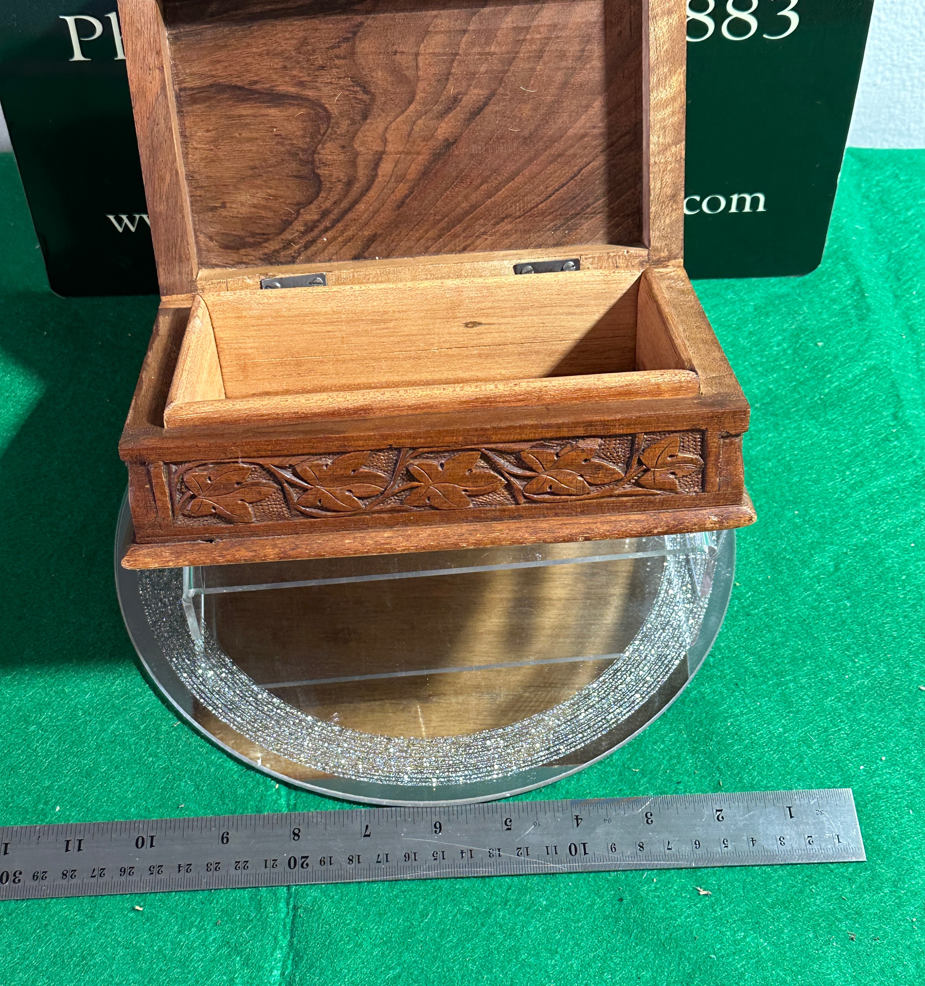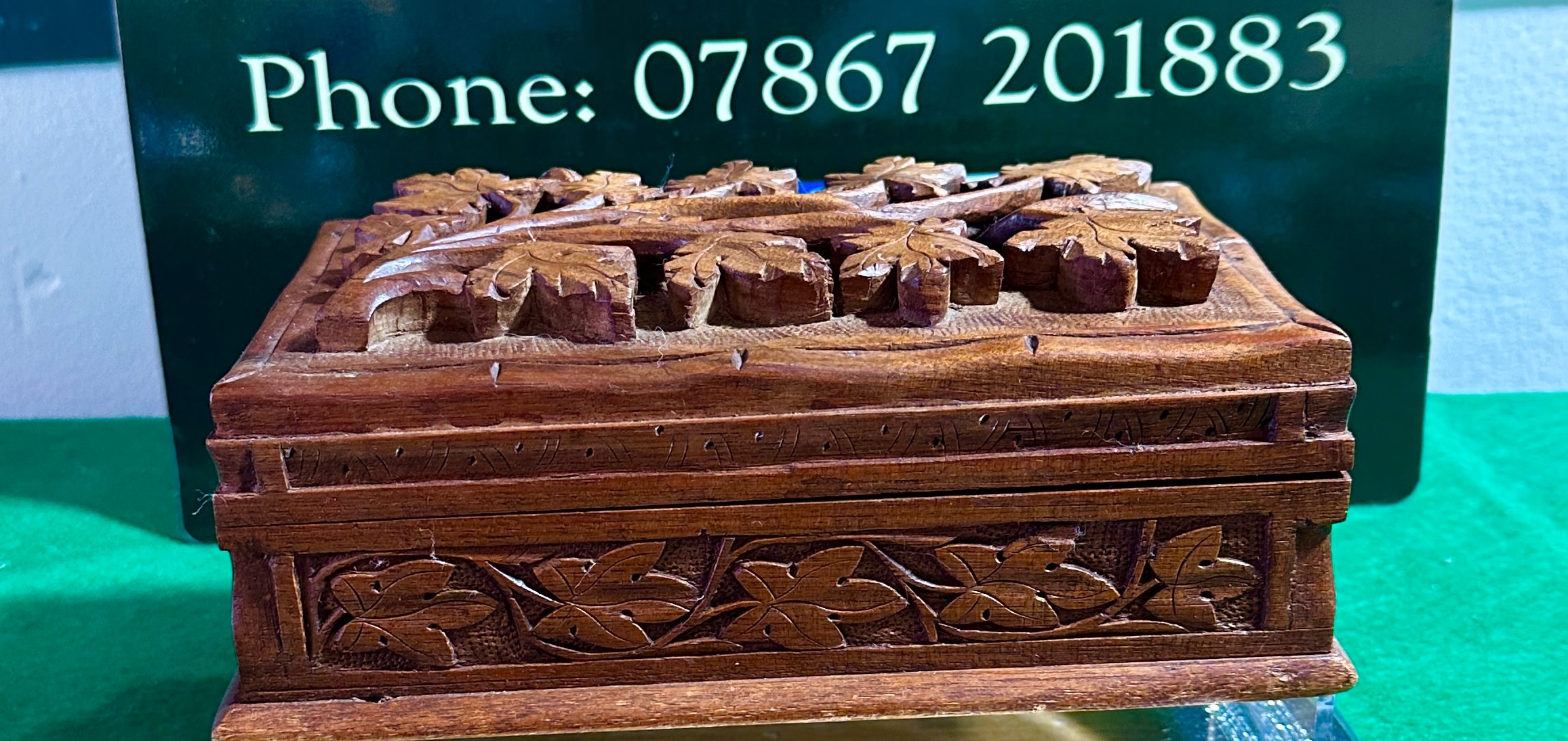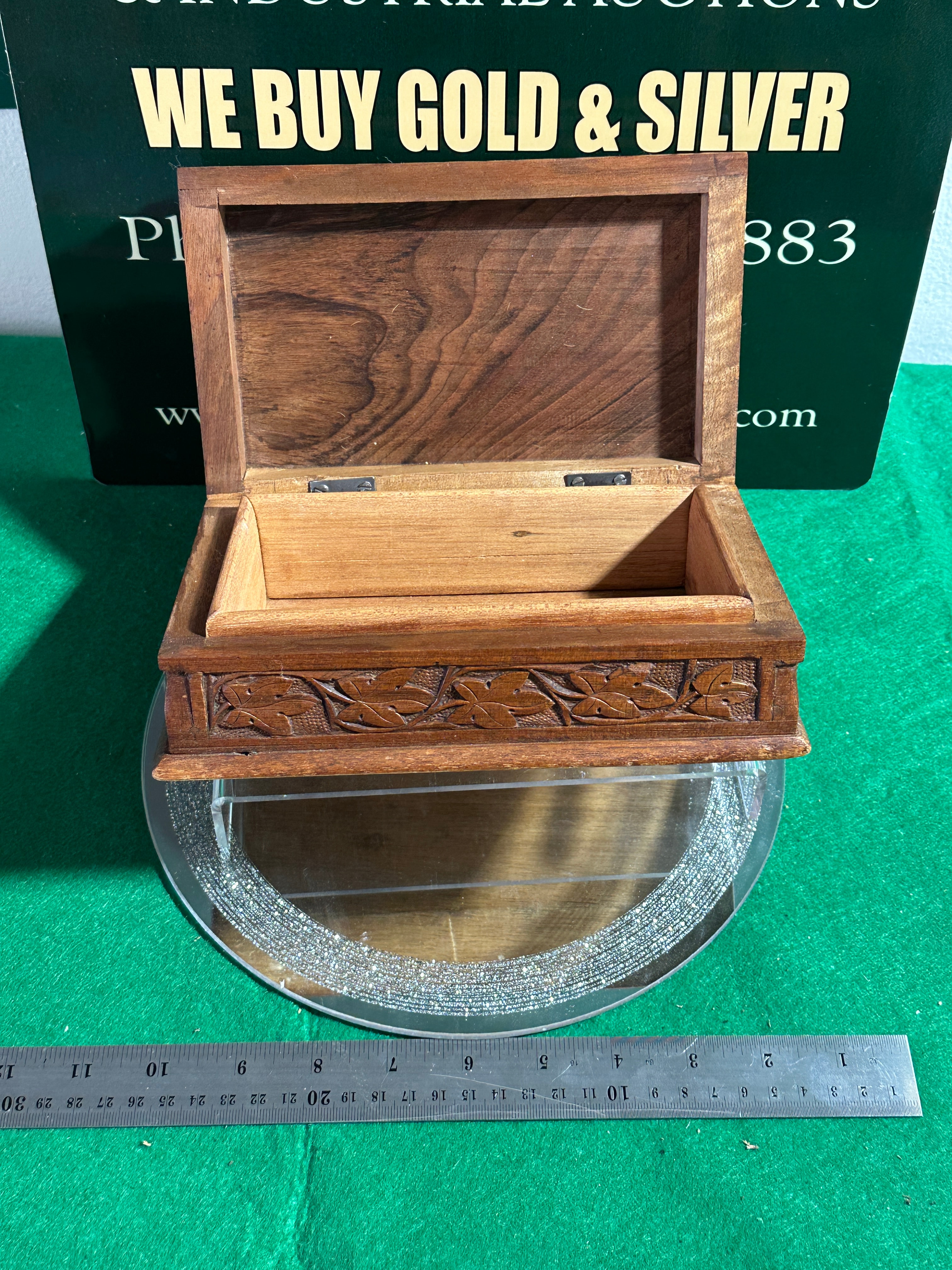 A vintage hand carved walnut jewellery box, crafted from light to medium brown wood with a visible grain. The hinged lid features deep relief carving depicting a branch with multiple lobed leaves, consistent with a Chinar leaf motif. The sides are adorned with a shallower carved repeating pattern of stylized foliage. The interior is unlined, and the box is fitted with two external metal hinges.