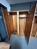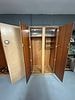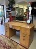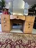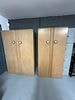 This three-piece bedroom suite, dating from the Art Deco or Mid-century Modern period (circa 1930s-1950s), comprises a pair of matching wardrobes and a dressing table with an integrated tri-fold mirror. The furniture is constructed from wood with a light-toned veneer, possibly birch or a similar figured wood, characterized by streamlined forms, curved corners, and a clean aesthetic. The wardrobes feature double doors with recessed circular metal handles, opening to reveal internal hanging rails and shelving. The dressing table has a shaped top, a central bowed drawer, and two flanking pedestals each containing multiple drawers with spherical wooden knobs, topped by an articulated three-panel mirror with shaped glass.