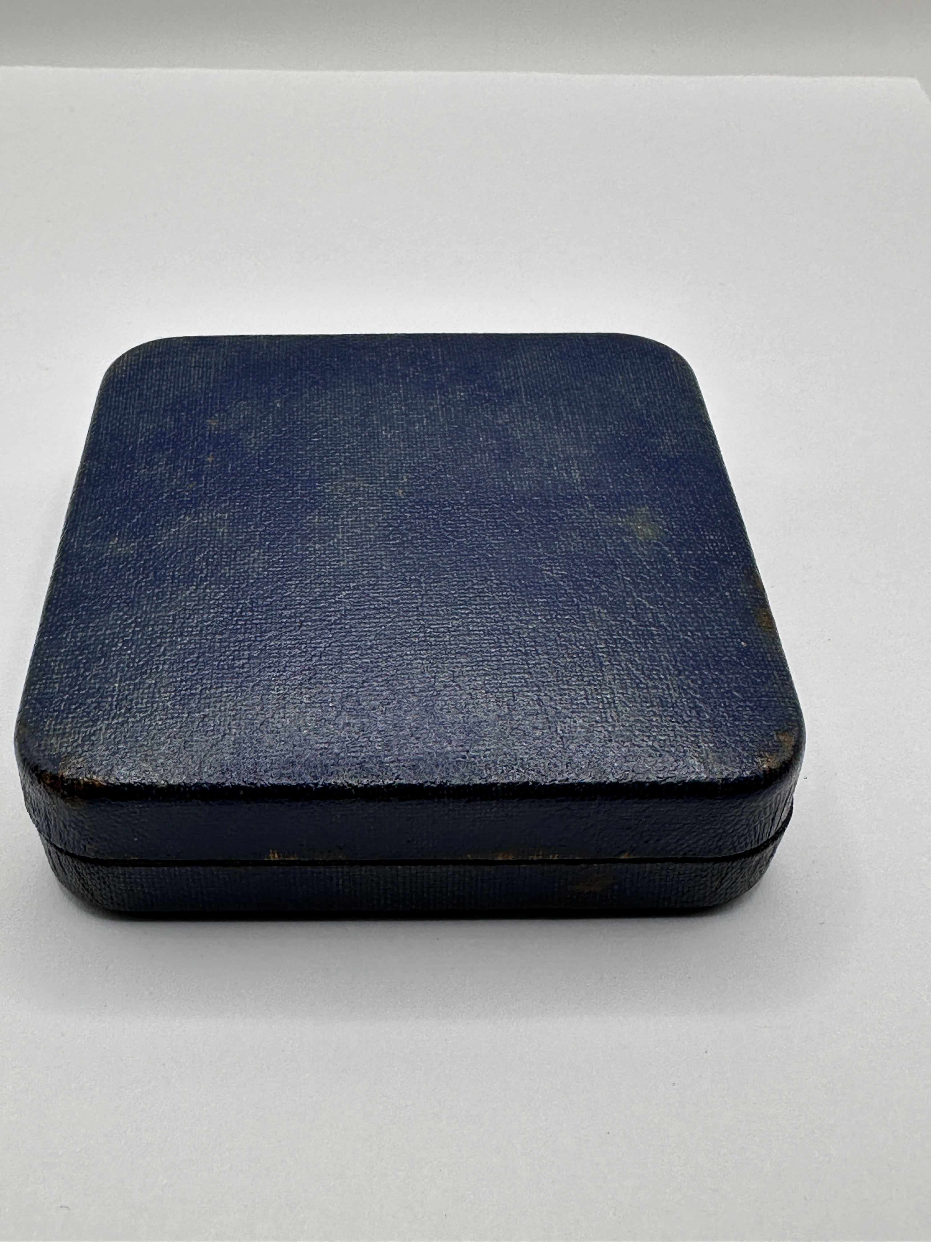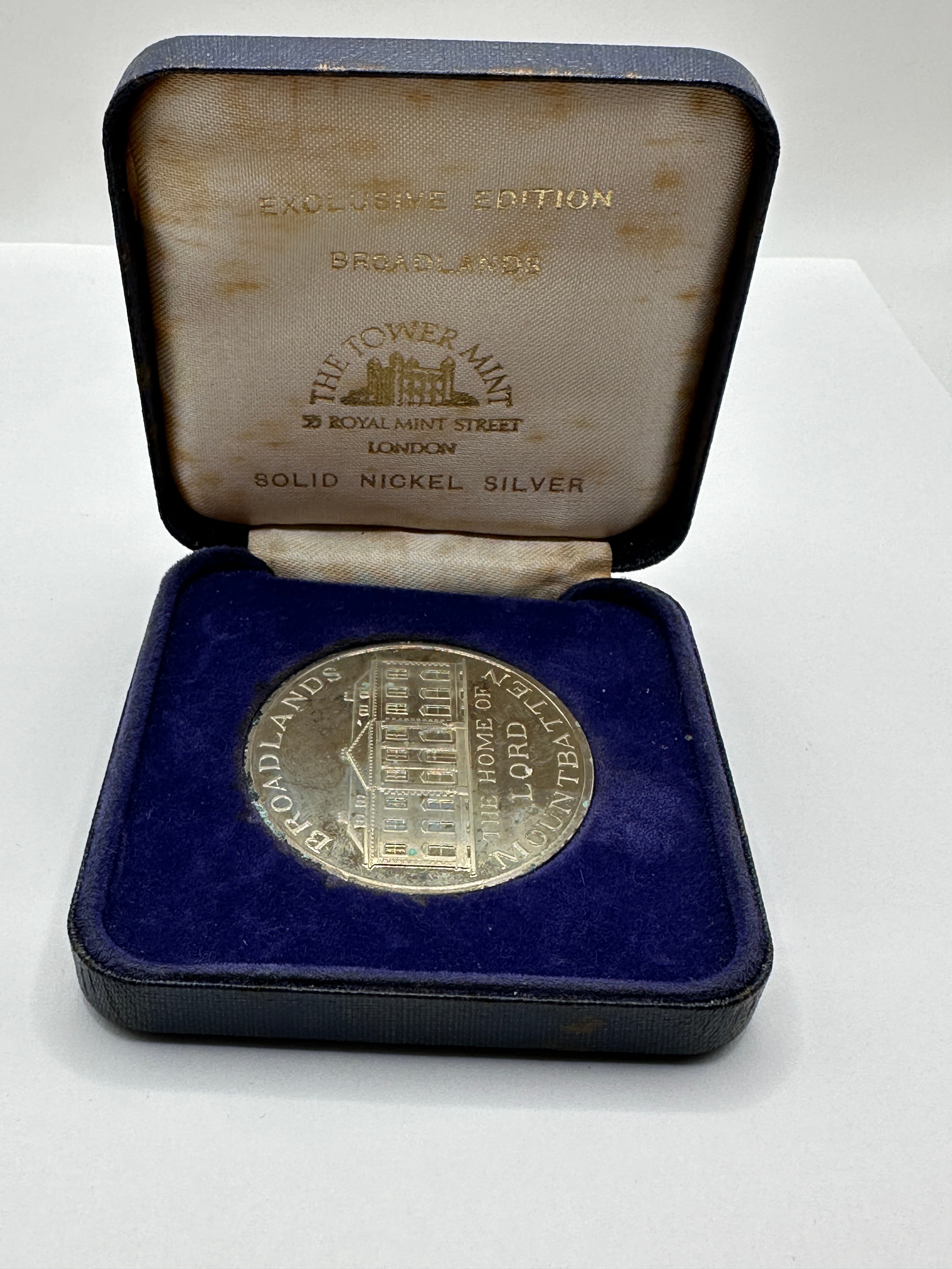 A Tower Mint Broadlands The Home of Lord Mountbatten Solid Nickel Silver Medallion. This circular medallion depicts an architectural rendering of Broadlands, inscribed with “BROADLANDS THE HOME OF LORD MOUNTBATTEN”. It is presented in its original dark blue textured presentation box, which features a dark blue velvet interior. The cream-colored silk-lined lid is gold-embossed with “EXCLUSIVE EDITION”, “BROADLANDS”, “THE TOWER MINT” logo, “33 ROYAL MINT STREET LONDON”, and “SOLID NICKEL SILVER”.