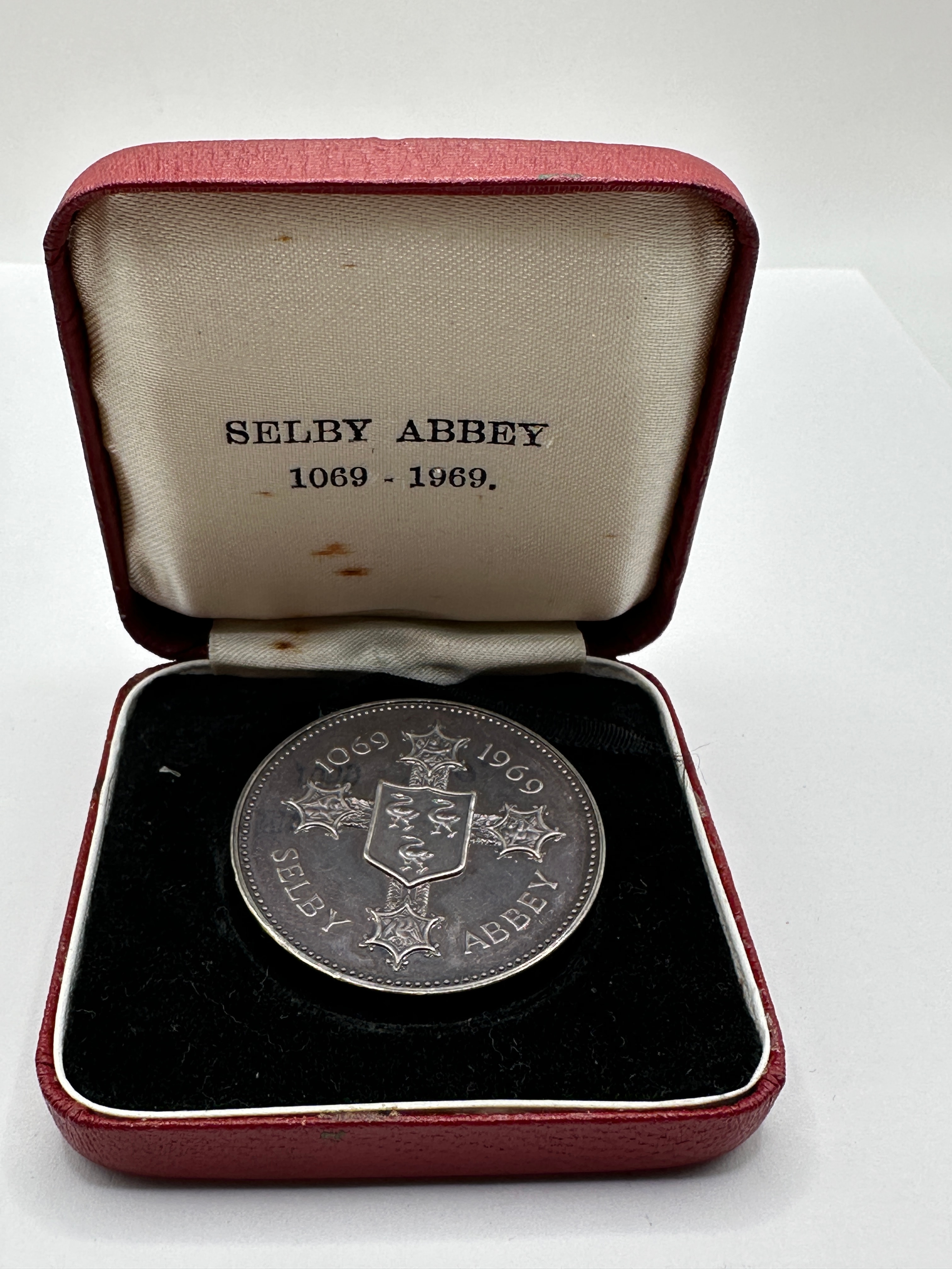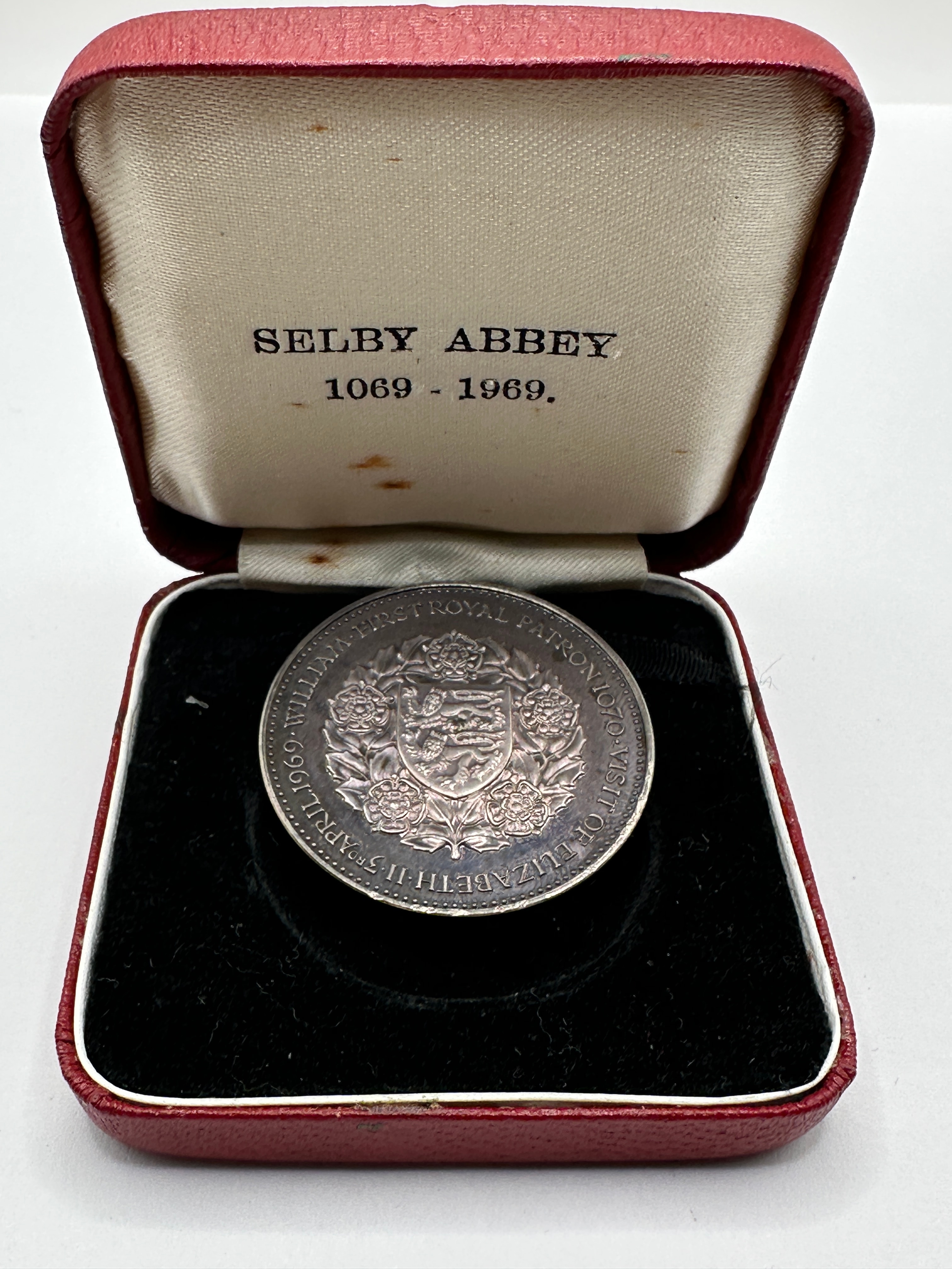 A 1969 Selby Abbey 900th Anniversary Silver Proof Medal, produced by John Pinches Medallist Ltd, London. This commemorative circular medal is crafted from silver. The obverse features a central heraldic shield design within a cross, encircled by the text "SELBY ABBEY" and the dates "1069" and "1969." The reverse displays the Royal Coat of Arms of the United Kingdom, surrounded by the inscription "ELIZABETH II DEI GRATIA REGINA F.D. FIRST ROYAL PERSON TO VISIT SELBY ABBEY 693 YEARS APRIL 29. 1969. WILLIAM." The Latin phrase "Dei Gratia Regina F.D." translates to "By the Grace of God, Queen, Defender of the Faith." It is presented within its original rectangular, red textured hinged case lined with cream satin and black velvet. The inside lid of the case is printed with "SELBY ABBEY" and "1069 – 1969.", indicating its purpose as a 1969 centenary commemoration.
