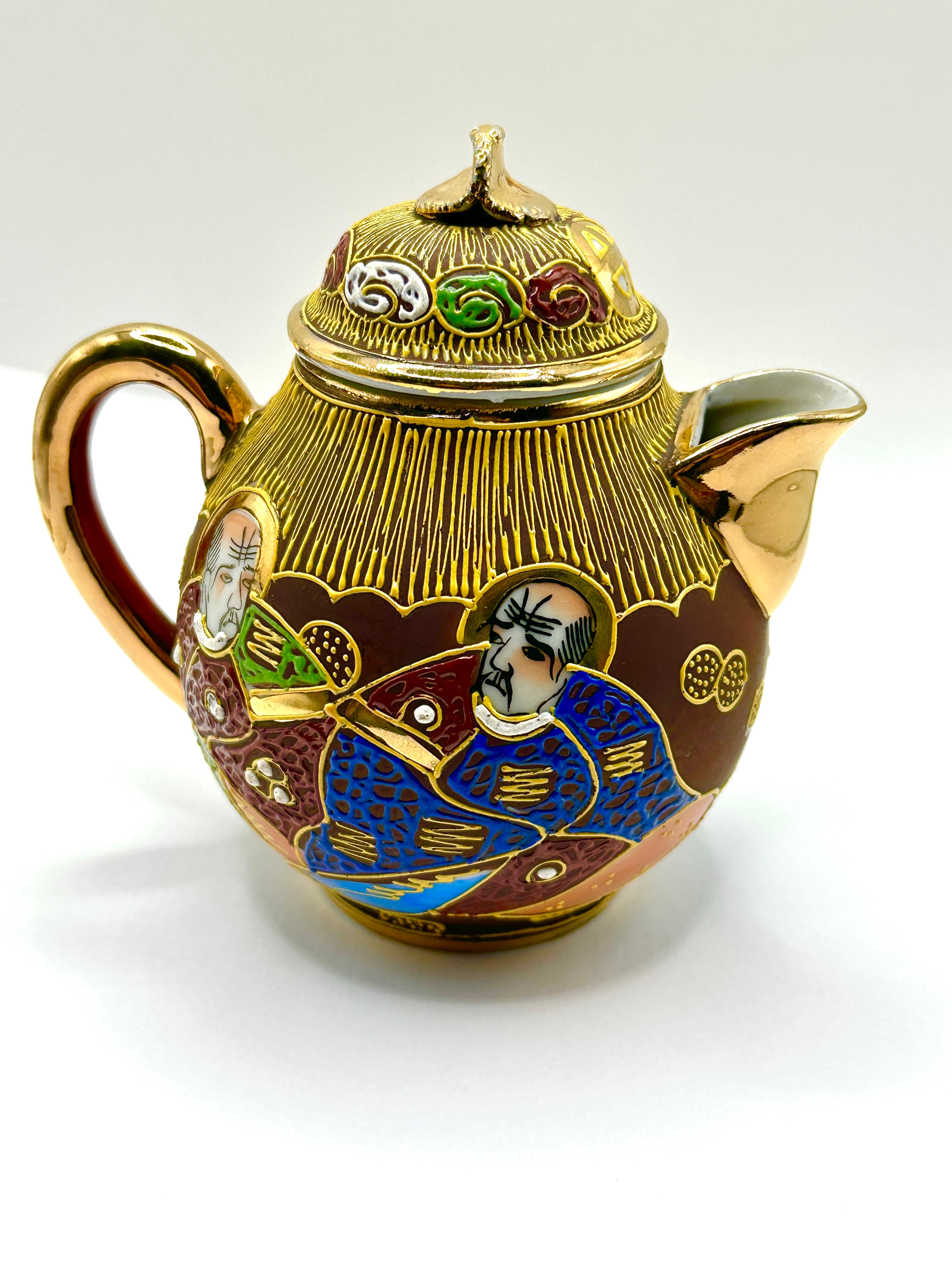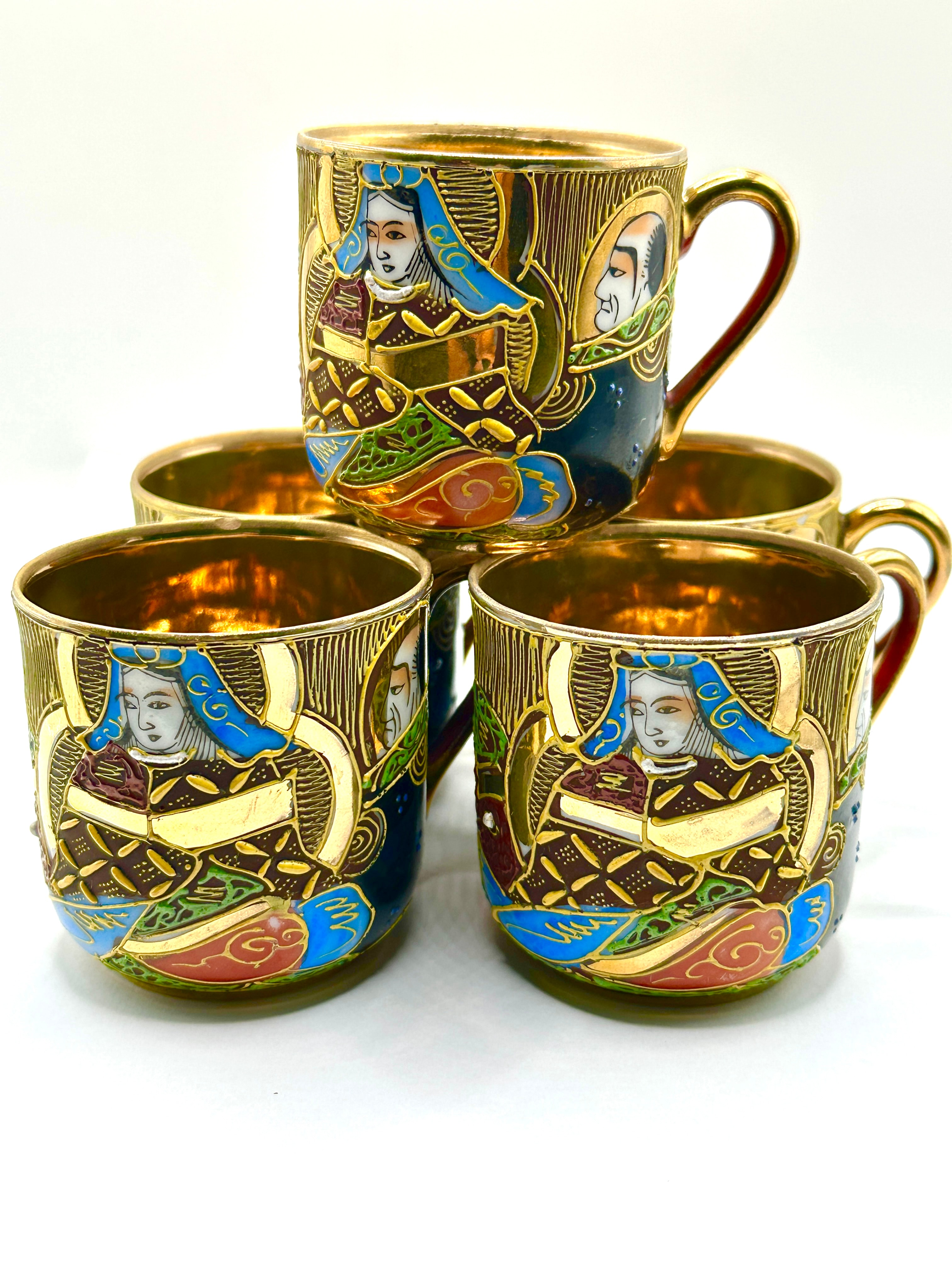 A Japanese ‘Mikado Samurai’ Moriage Tea Set, consistent with late Meiji or early Taisho period (late 19th to early 20th century) Japanese export ware. This ornate, multi-piece ceramic set comprises a lidded teapot, a lidded sugar bowl, a creamer, and a group of cups with corresponding saucers. The set features a distinctive Satsuma-style aesthetic, characterized by extensive gold gilding forming vertical patterned backgrounds and intricate frames around polychrome enamel (moriage) depictions of Japanese sages or deities in traditional attire. The figures are rendered in a palette of dark brown, blue, green, red, and white, often with golden halos. The underlying material appears to be fine earthenware or porcelain. No discernible text or manufacturer’s markings are visible on the exterior surfaces.