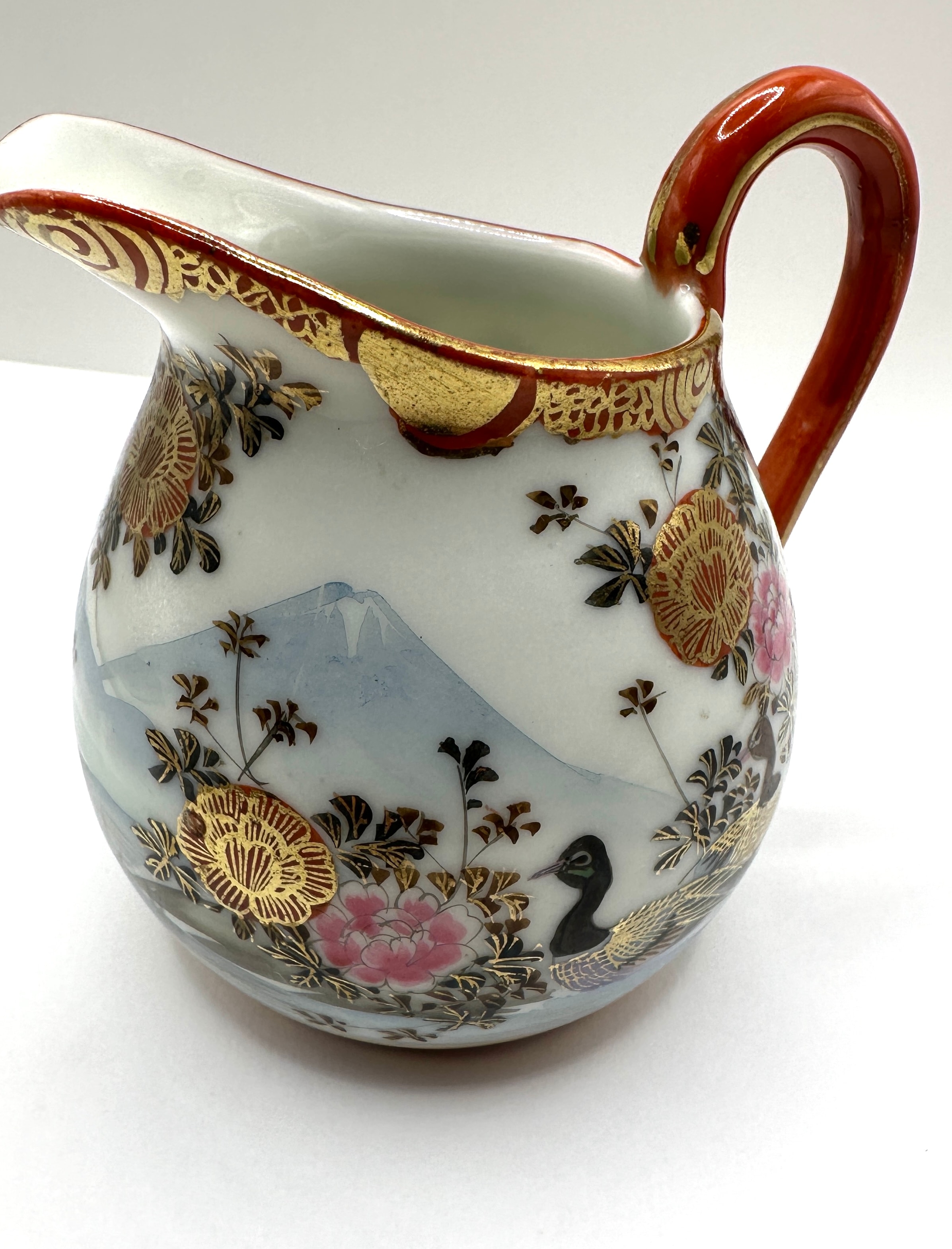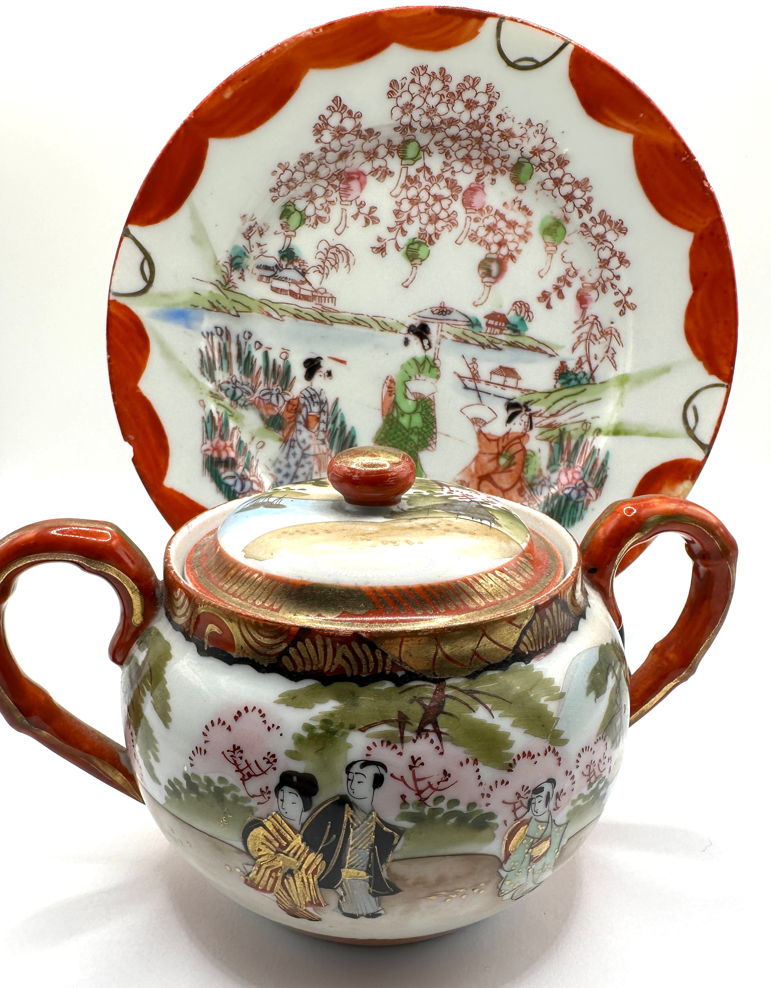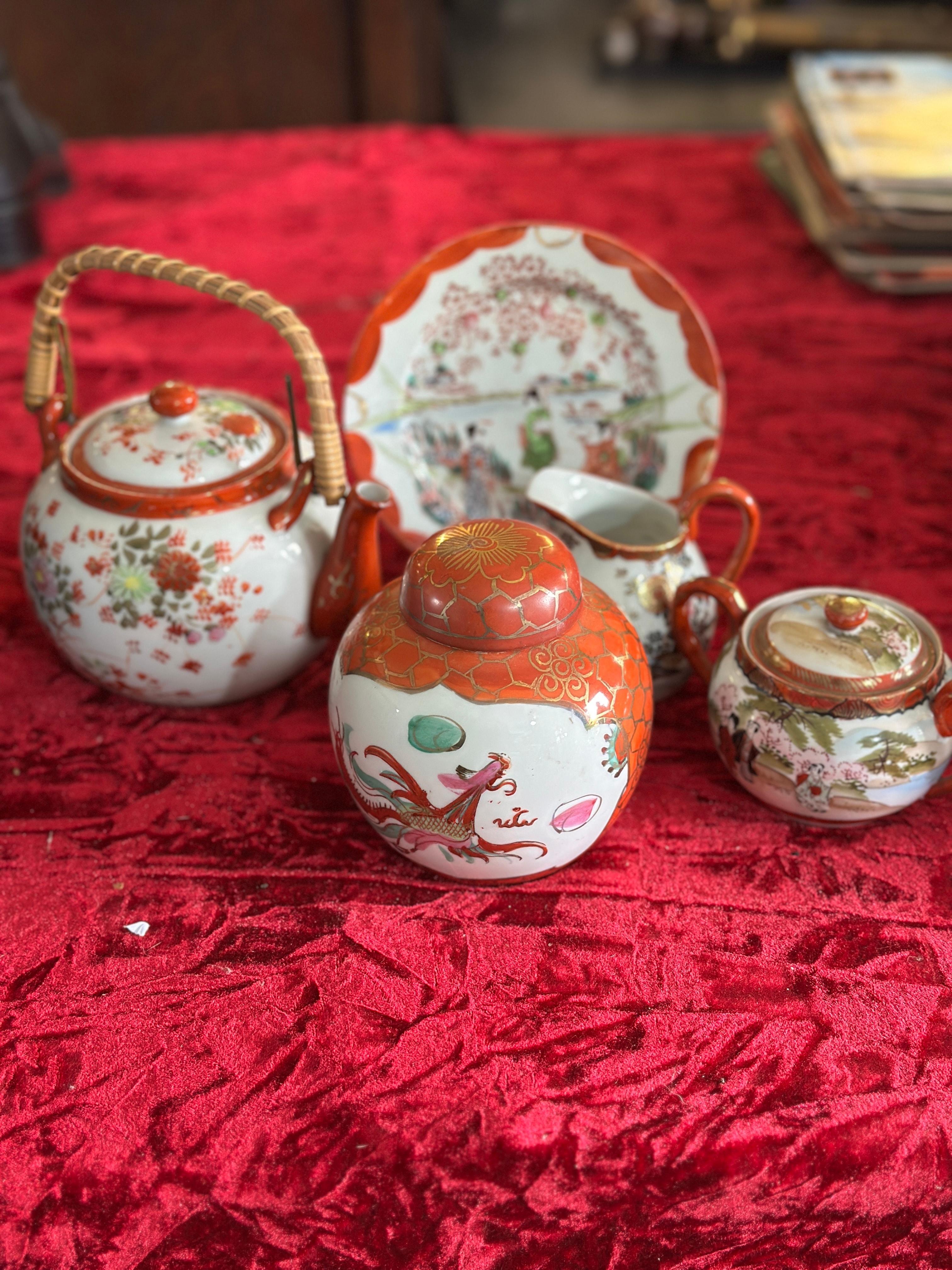 A five-piece Japanese Kutani Ware Geisha Girl tea set, likely porcelain, decorated in a traditional Japanese-inspired style with extensive polychrome enamels and gilt accents. The set consists of a decorative plate, a lidded sugar bowl, a lidded ginger jar or tea caddy, a creamer, and a teapot with a natural cane-wrapped handle. Decorative motifs include detailed scenes of figures in traditional dress, cherry blossoms, diverse floral patterns, mountainous landscapes (including a depiction resembling Mount Fuji), and a mythological phoenix-like bird. A prominent burnt orange-red color, often embellished with gilt, is used on rims, handles, spouts, and lids. Red character markings are visible on the side of the ginger jar.