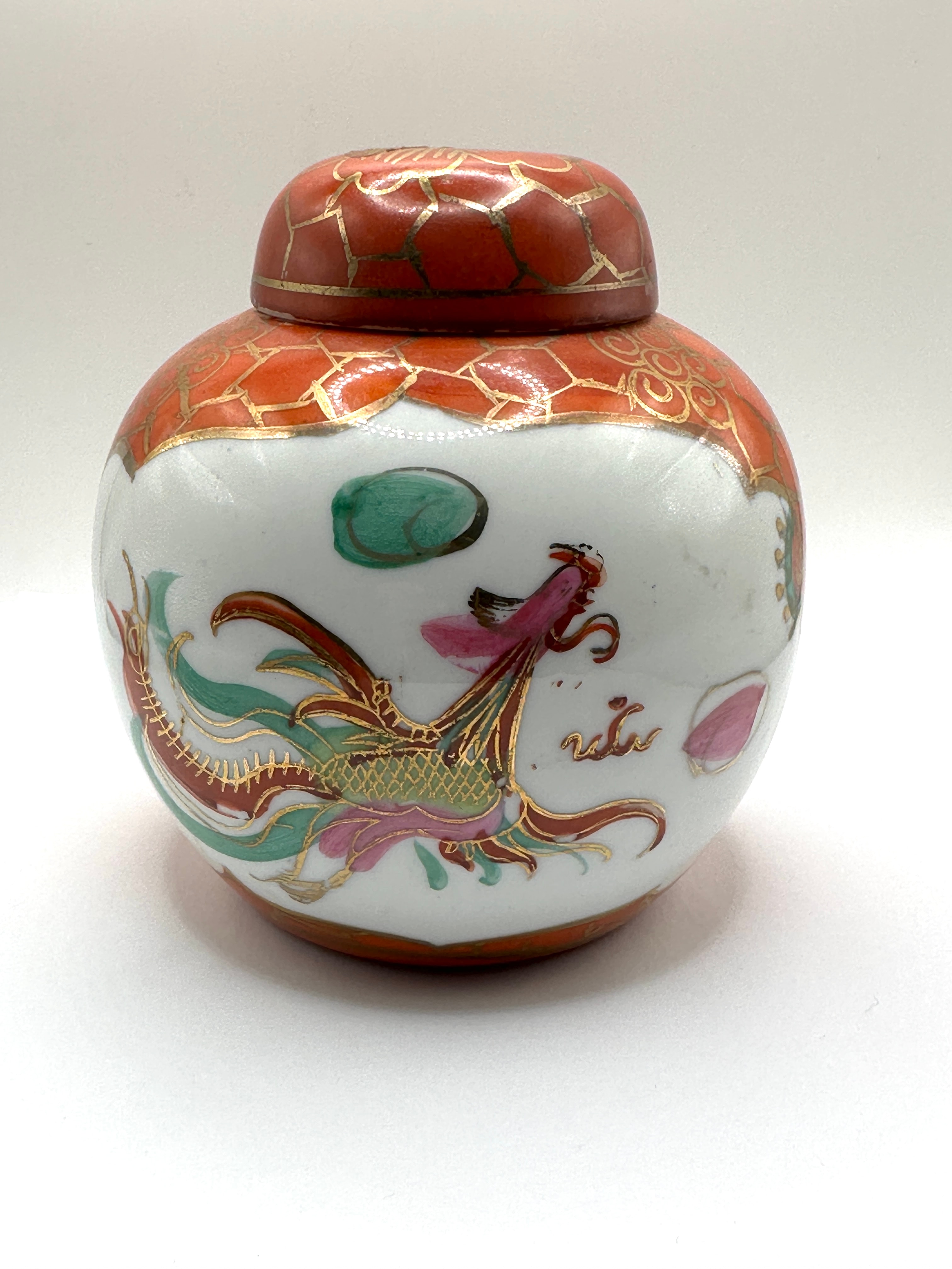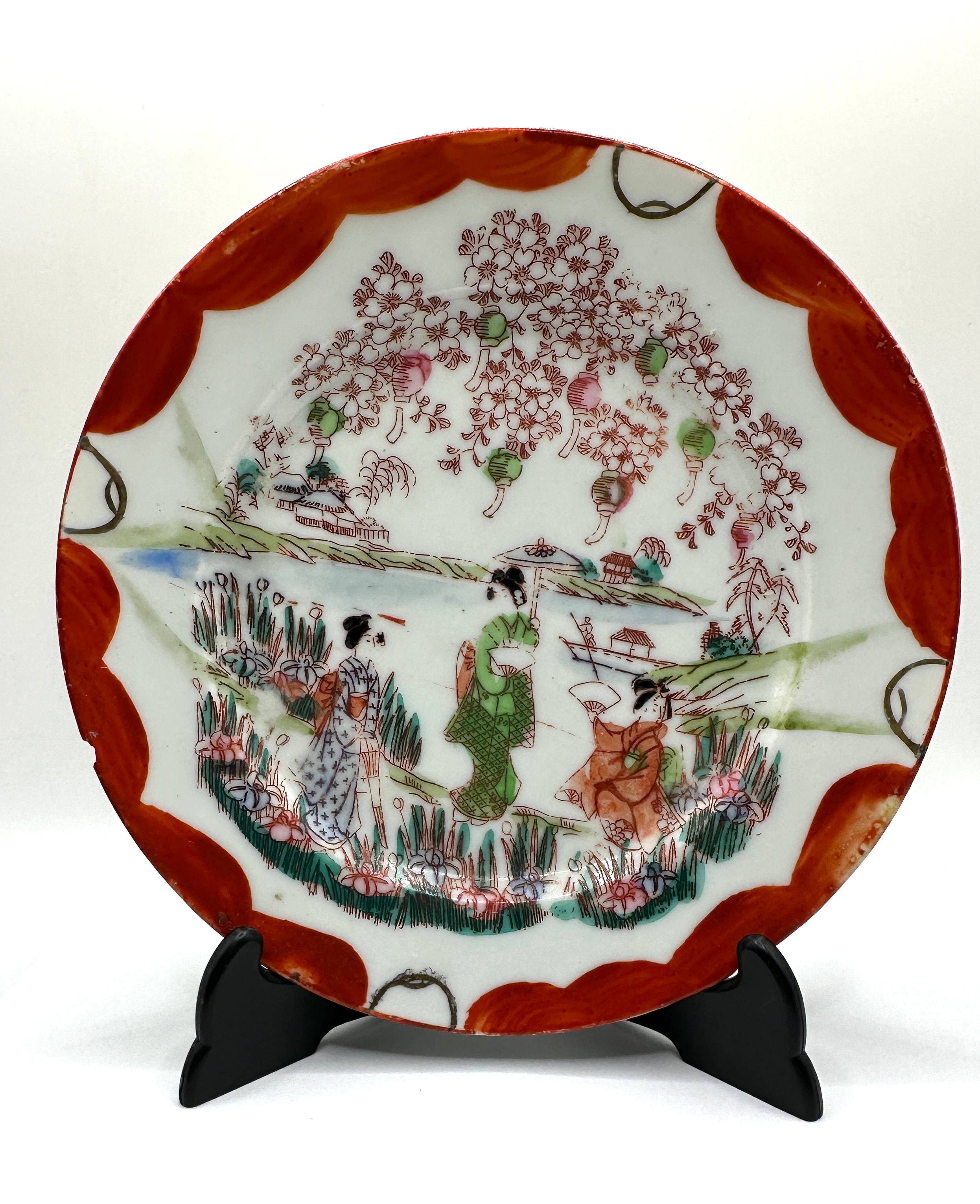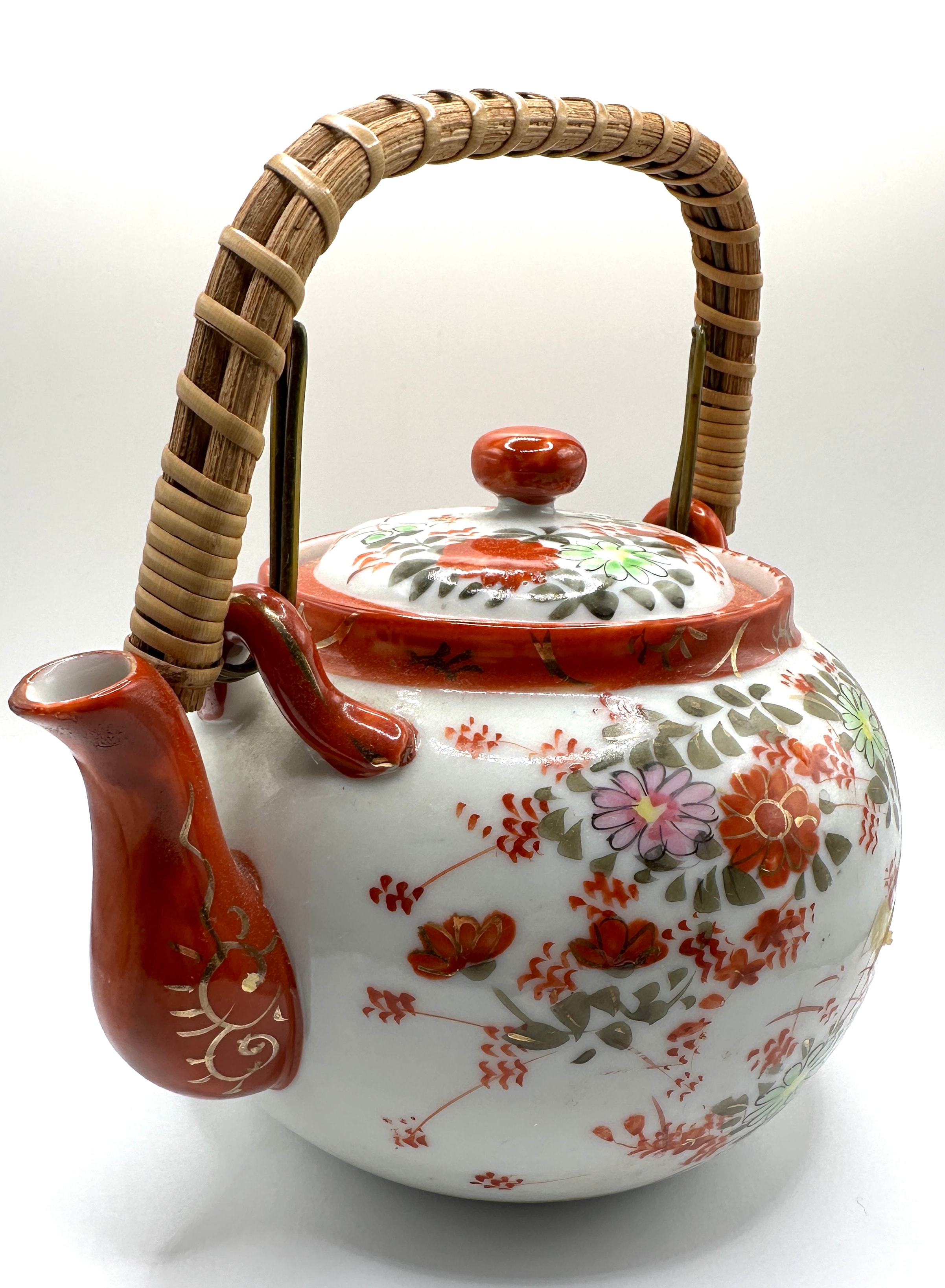 A five-piece Japanese Kutani Ware Geisha Girl tea set, likely porcelain, decorated in a traditional Japanese-inspired style with extensive polychrome enamels and gilt accents. The set consists of a decorative plate, a lidded sugar bowl, a lidded ginger jar or tea caddy, a creamer, and a teapot with a natural cane-wrapped handle. Decorative motifs include detailed scenes of figures in traditional dress, cherry blossoms, diverse floral patterns, mountainous landscapes (including a depiction resembling Mount Fuji), and a mythological phoenix-like bird. A prominent burnt orange-red color, often embellished with gilt, is used on rims, handles, spouts, and lids. Red character markings are visible on the side of the ginger jar.