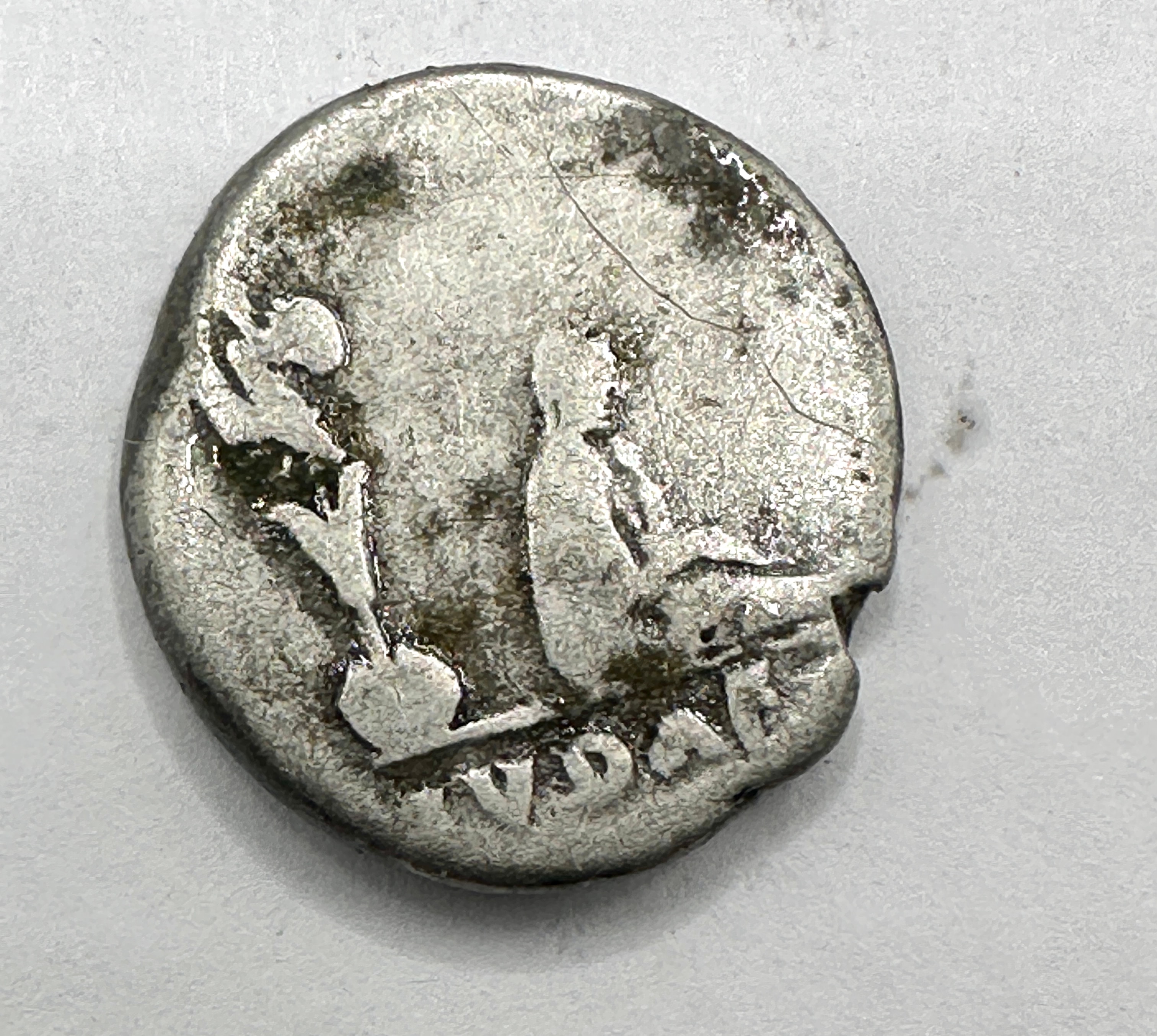 An ancient Roman Imperial silver denarius, Vespasian, ‘IVDAEA’ type. The obverse features a right-facing, laureate and draped bust of a male figure, presumably Emperor Vespasian, surrounded by a partially legible Latin inscription. The reverse depicts two figures: one standing beside what appears to be a palm tree or trophy, and another seated figure, possibly a captive, with the clear Latin inscription “IVDAE” at the bottom. The coin is composed of silver or a silver alloy.