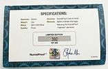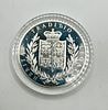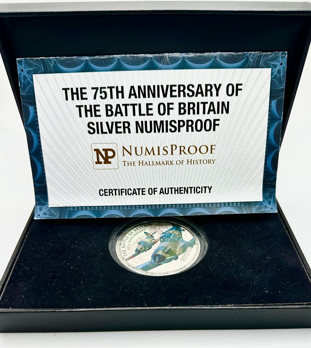 A NumisProof 75th Anniversary of The Battle of Britain silver commemorative proof coin. This modern commemorative proof coin is part of a limited edition NumisProof series, numbered 302 of 499. It is crafted from 1oz of .999 fine silver. The colorized obverse depicts two aircraft in flight, inscribed "THE BATTLE OF BRITAIN 75TH ANNIVERSARY" and "AUG 1940". The reverse displays a crowned coat of arms within laurel wreaths, inscribed "NUMISPROOF", "TRADISIO" (Latin for tradition), and "VERITAS" (Latin for truth). The coin is presented in a clear protective capsule within its original black presentation box, accompanied by its certificate of authenticity detailing its specifications and limited edition status.