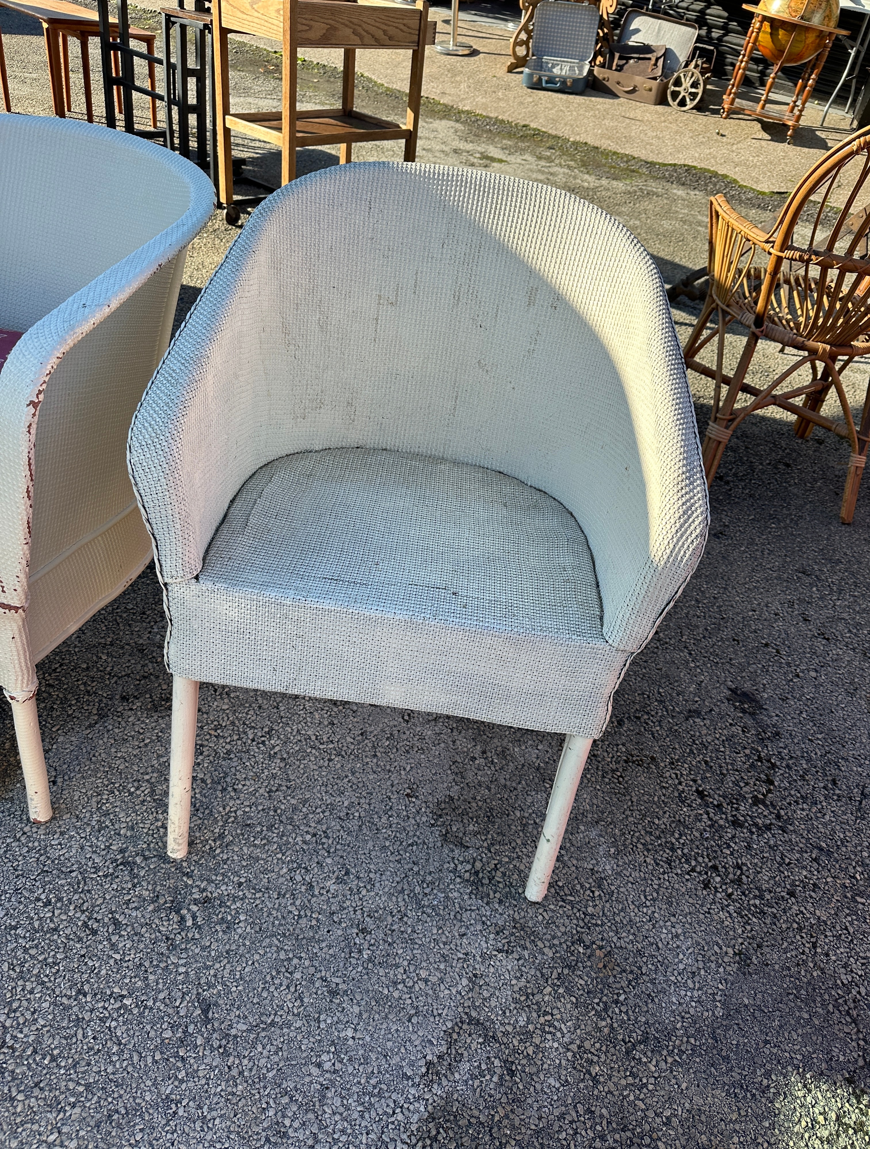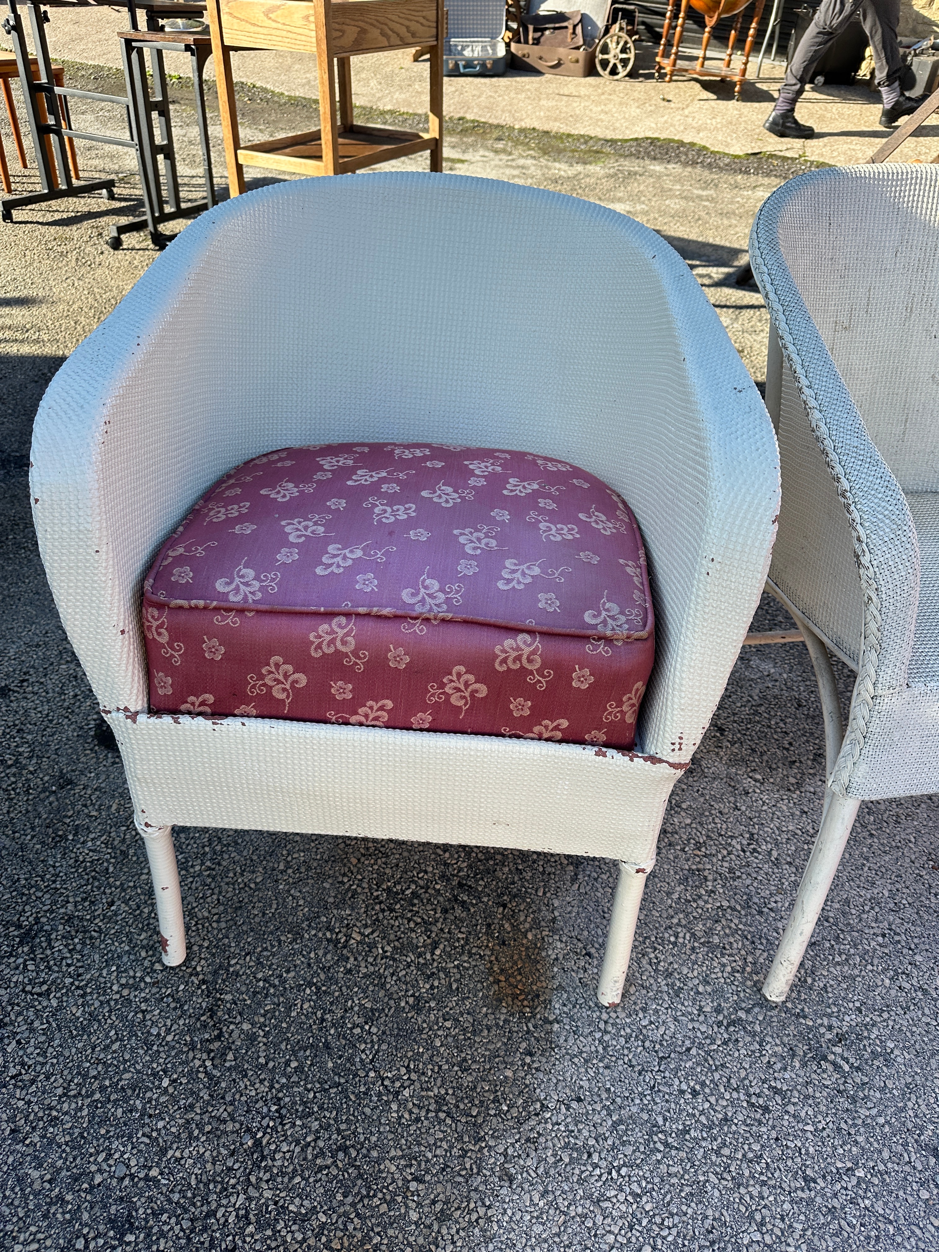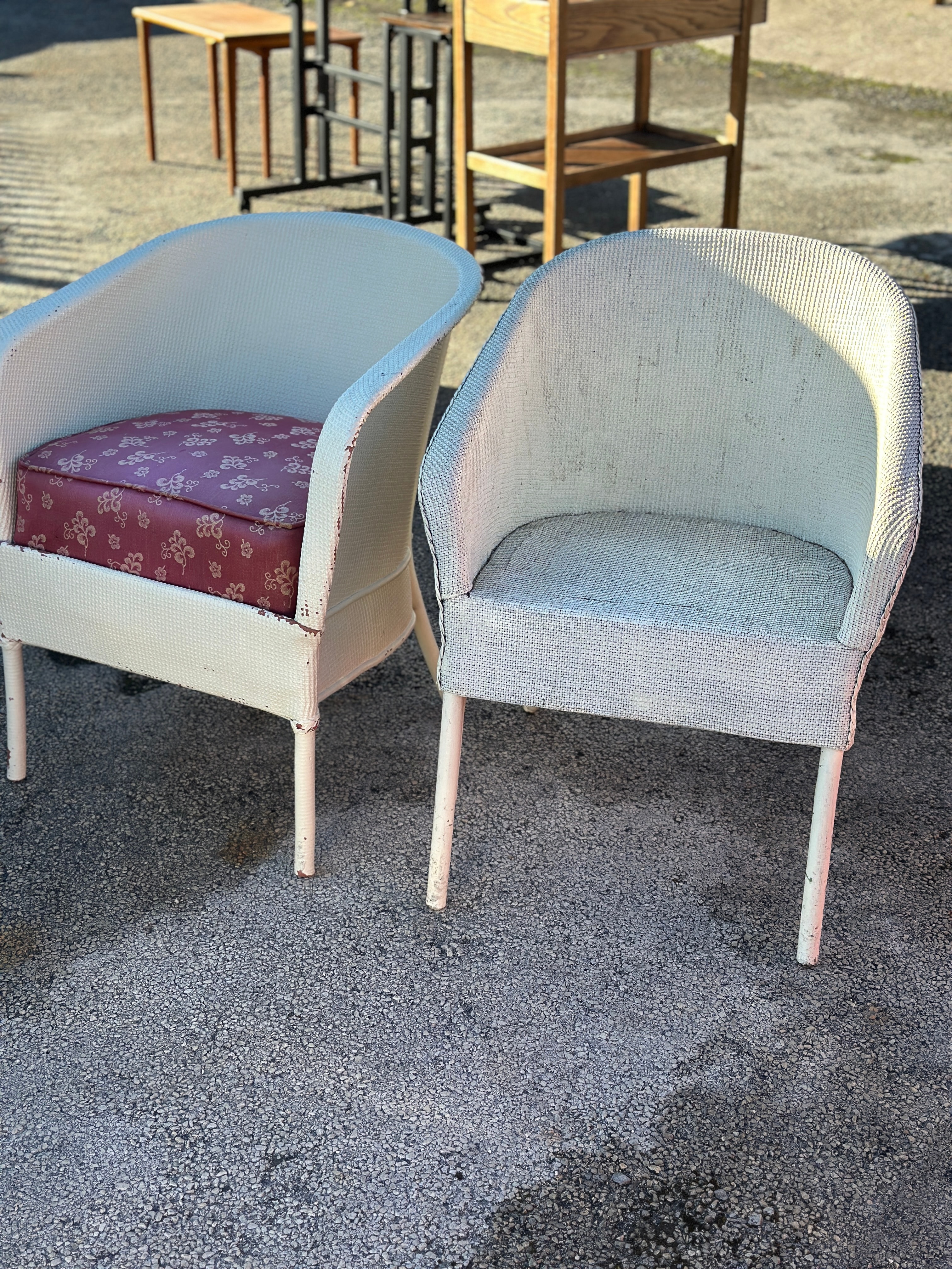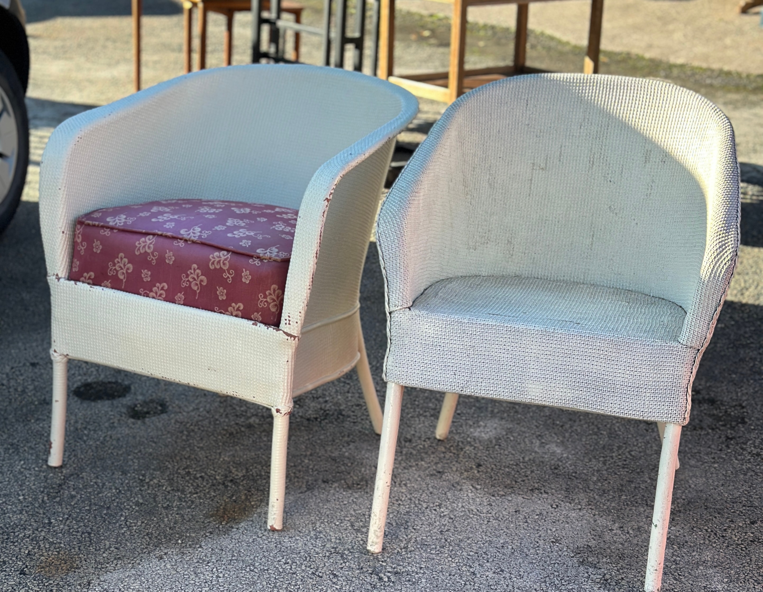 A pair of Mid-Century cream-painted woven armchairs, each featuring a bucket-style seat and back. The chairs are crafted from what appears to be synthetic resin wicker or painted natural wicker, set over a metal frame. One chair retains a loose, patterned cushion upholstered in pink fabric with a repeating white floral motif. There are no visible text or maker’s markings.