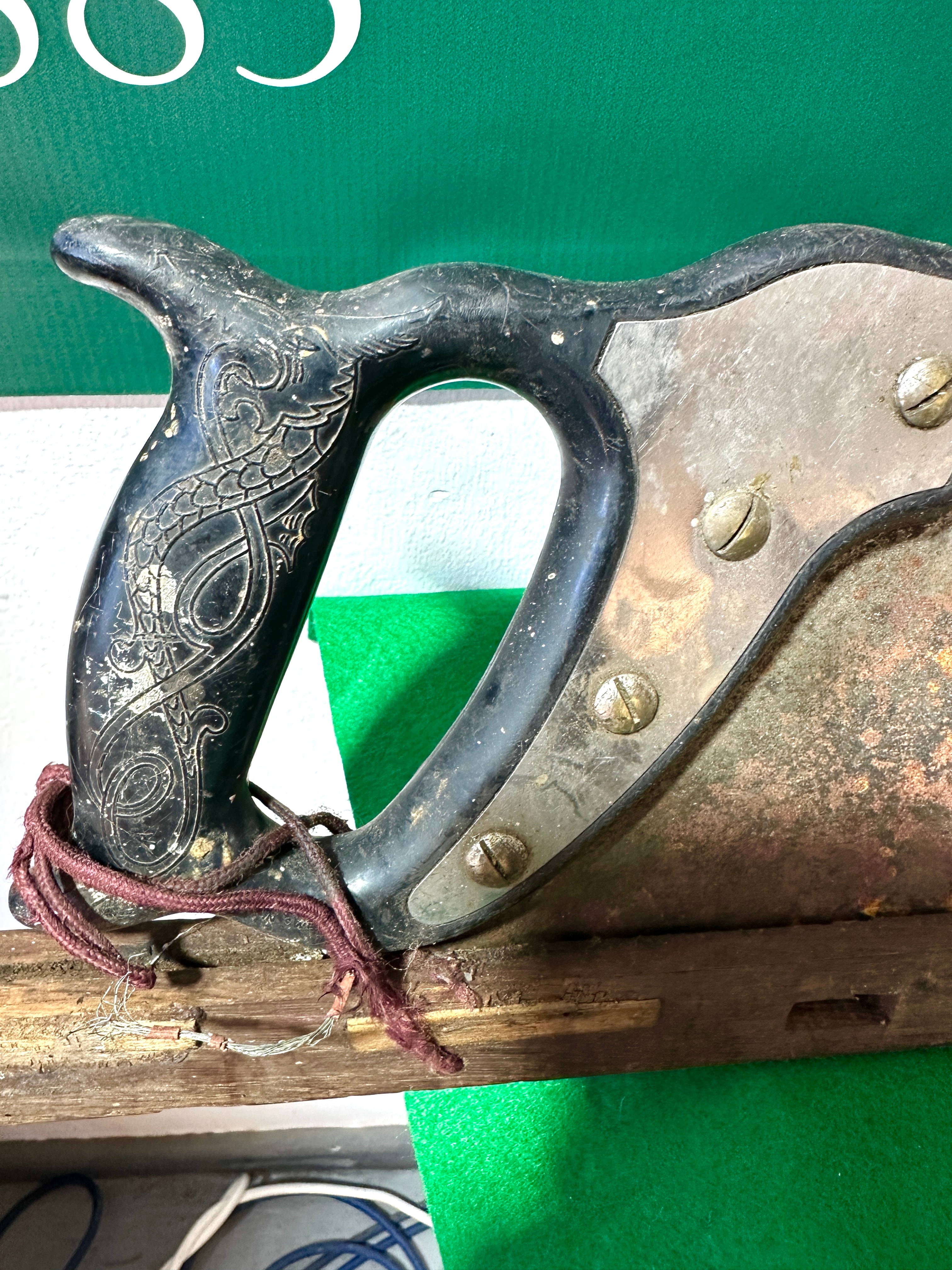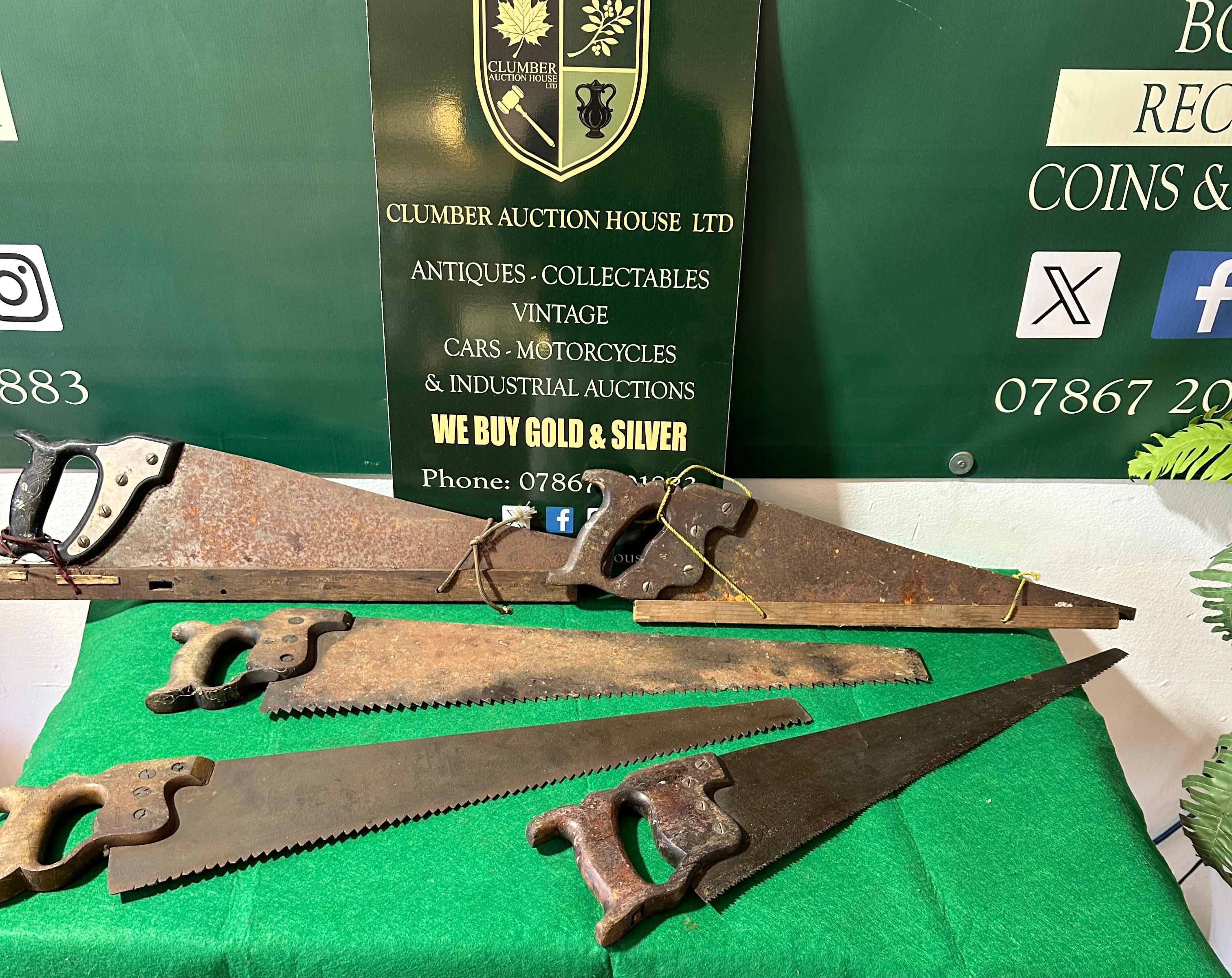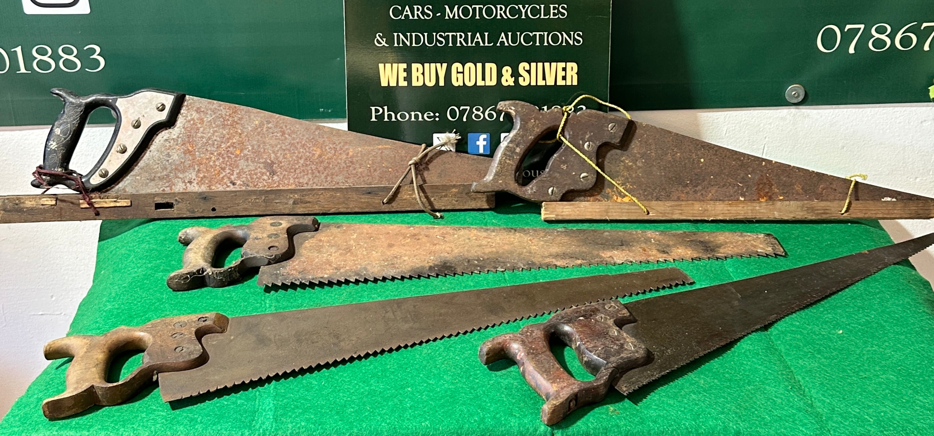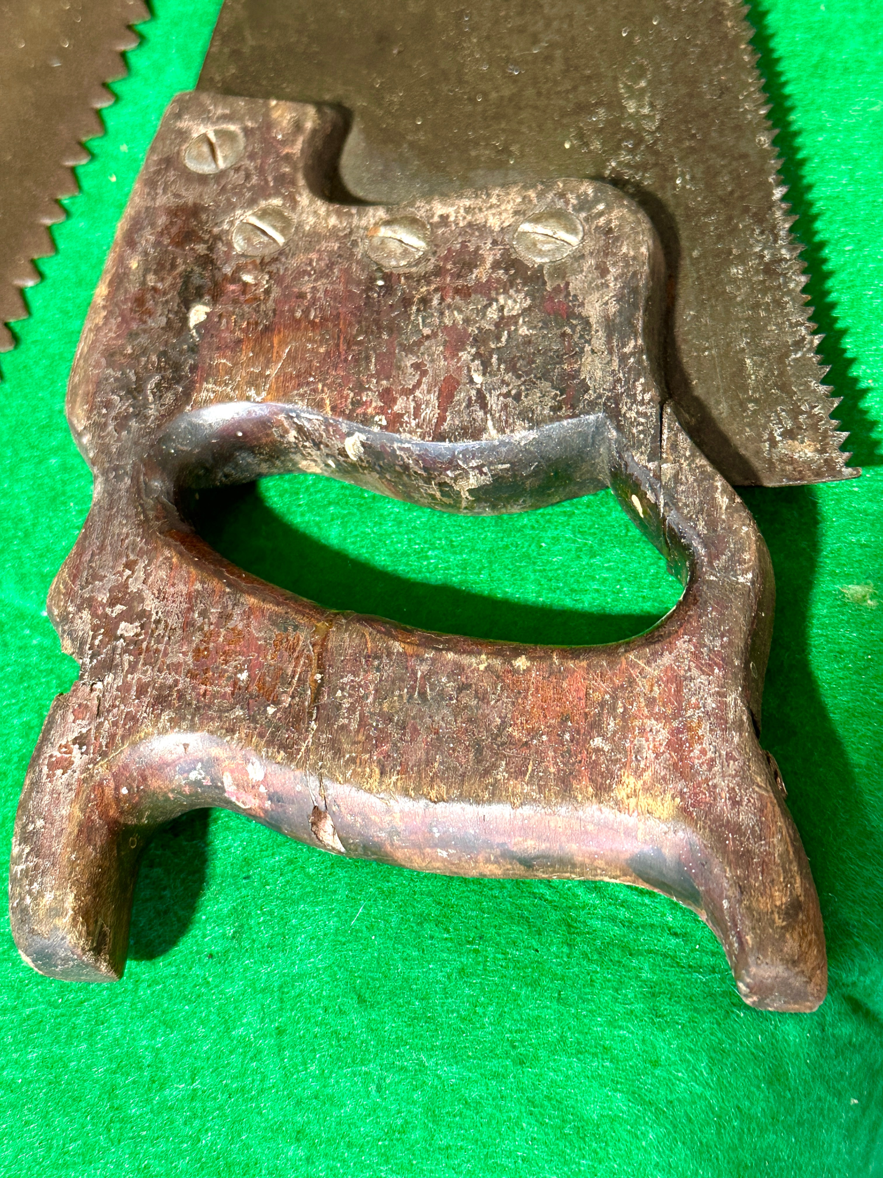 A collection of 5 vintage and antique hand saws, including examples by Disston and other makers, primarily featuring steel blades and various wooden handles. The assortment comprises a large frame or buck saw with a distinctive wooden support frame, alongside several smaller panel or rip saws. One black-painted handle notably retains intricate carved decoration, contrasting with the plainer, worn wooden handles of the other saws.