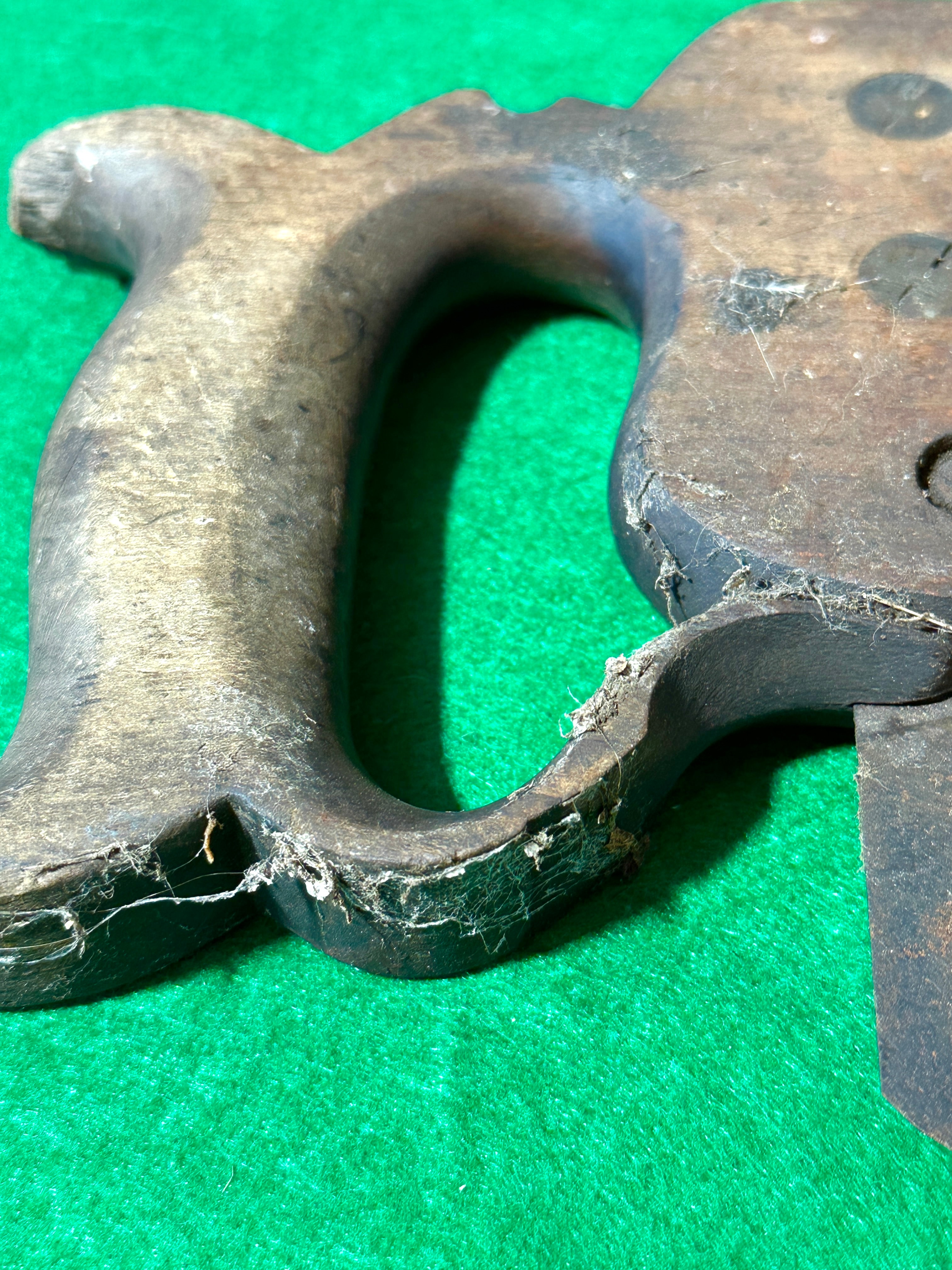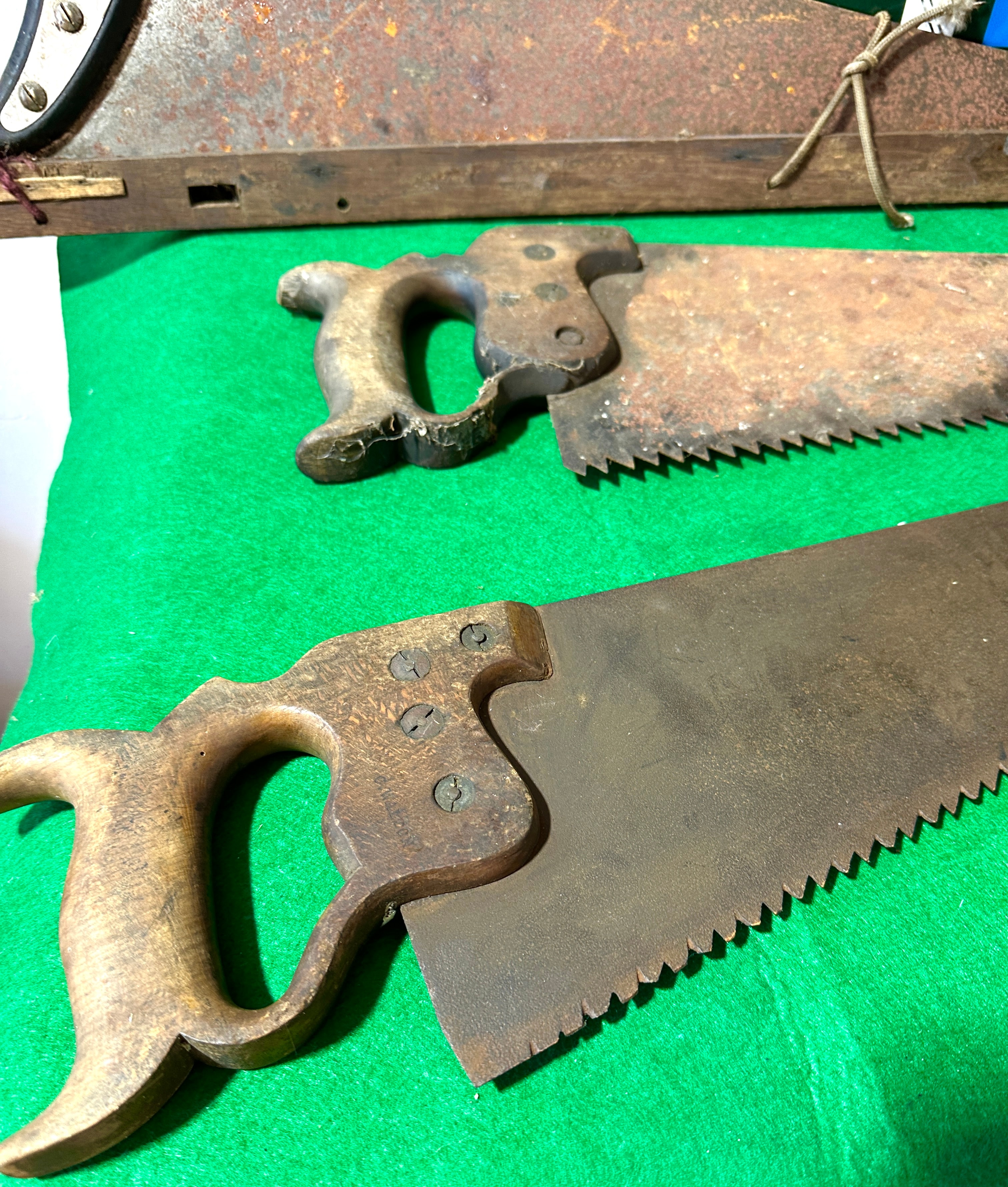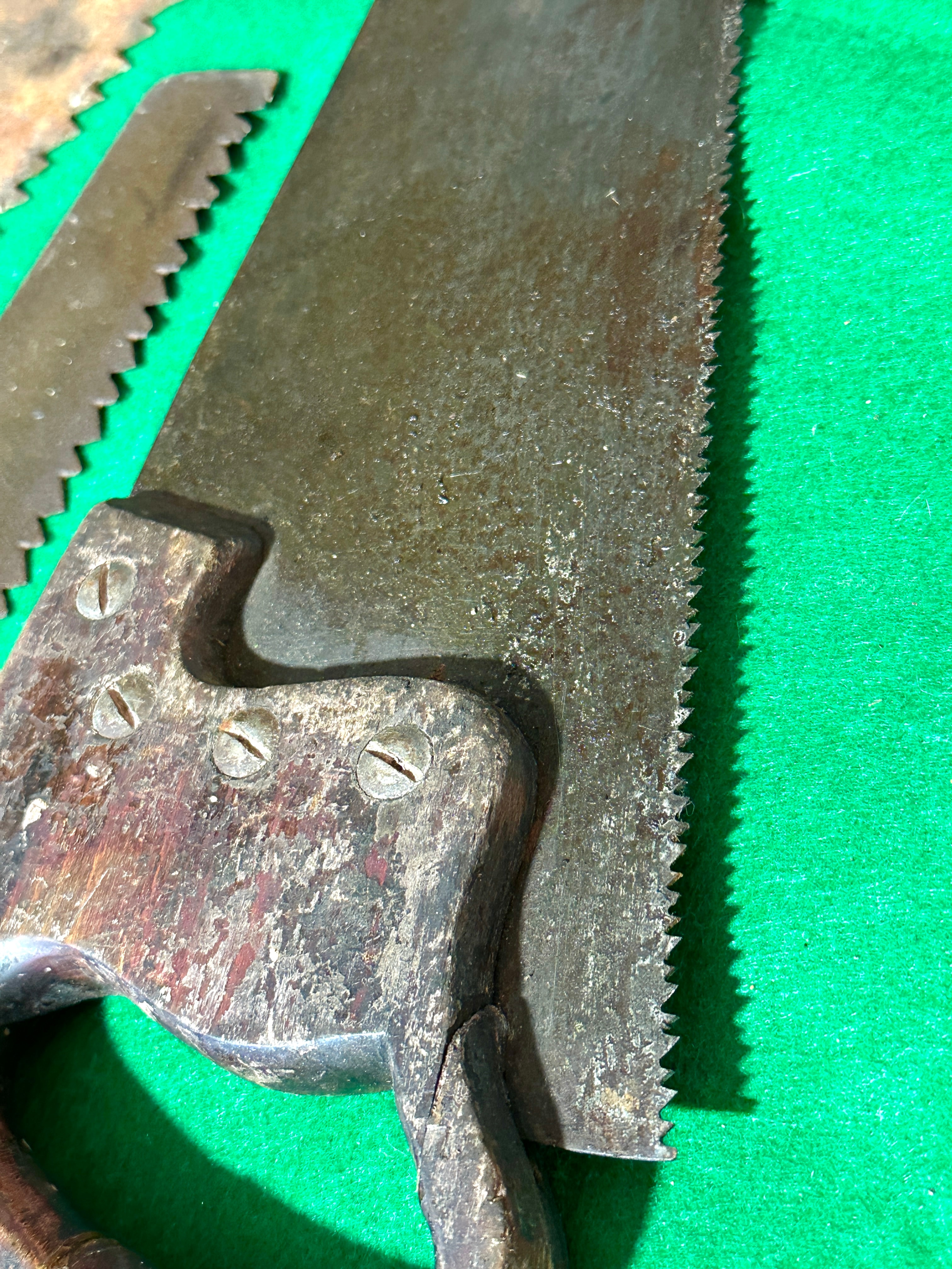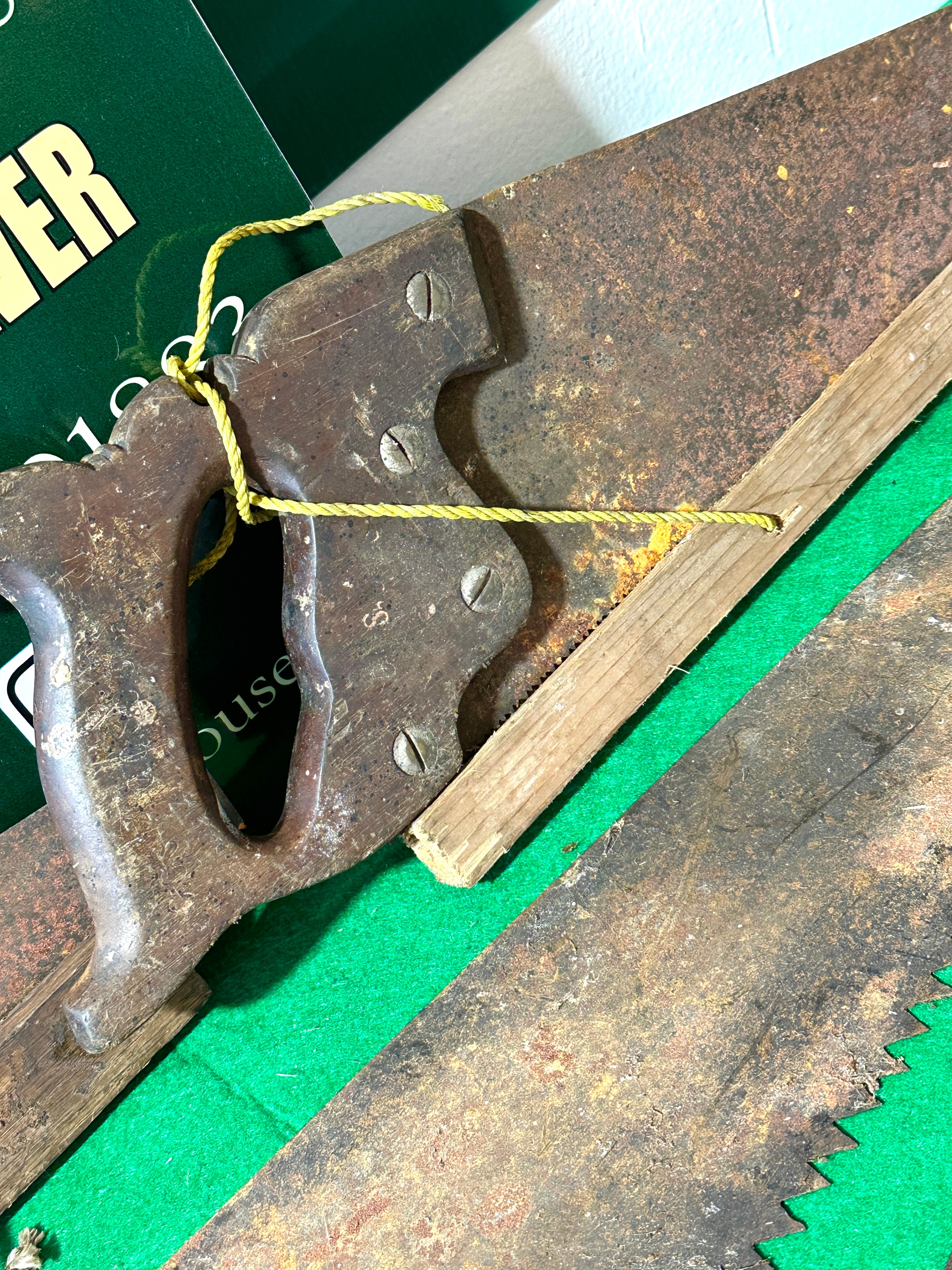 A collection of 5 vintage and antique hand saws, including examples by Disston and other makers, primarily featuring steel blades and various wooden handles. The assortment comprises a large frame or buck saw with a distinctive wooden support frame, alongside several smaller panel or rip saws. One black-painted handle notably retains intricate carved decoration, contrasting with the plainer, worn wooden handles of the other saws.