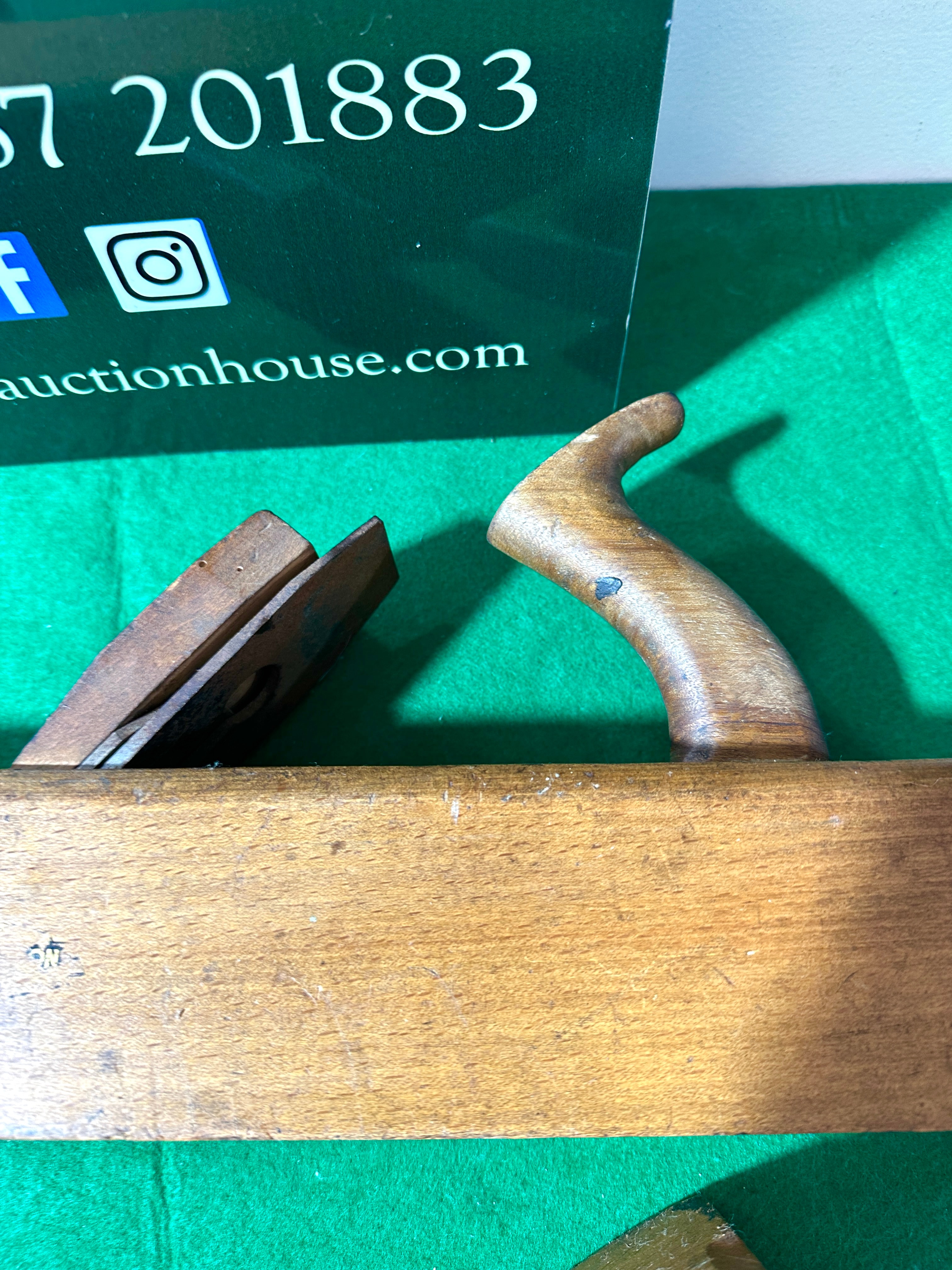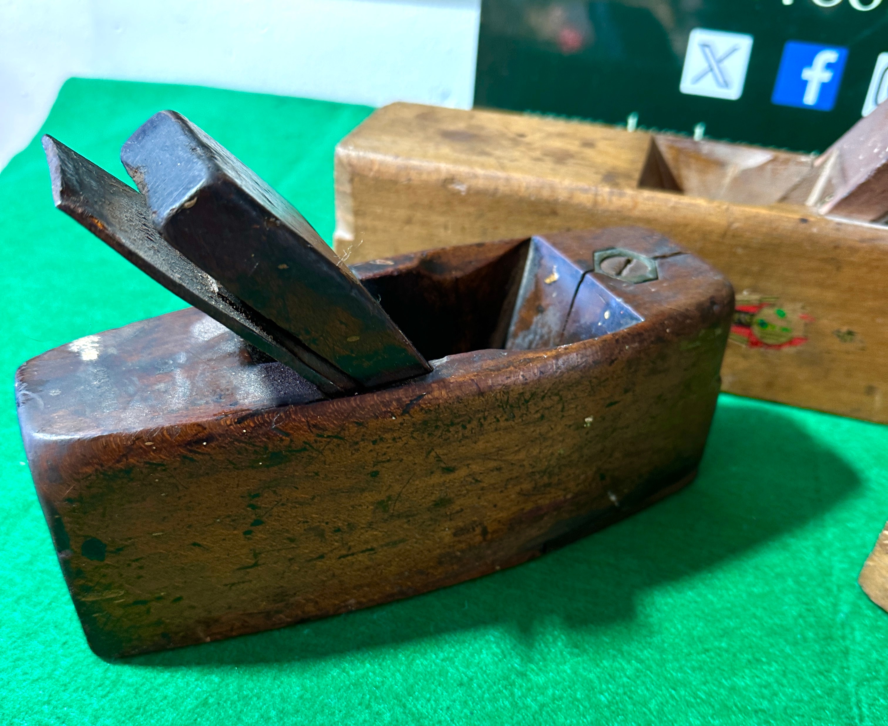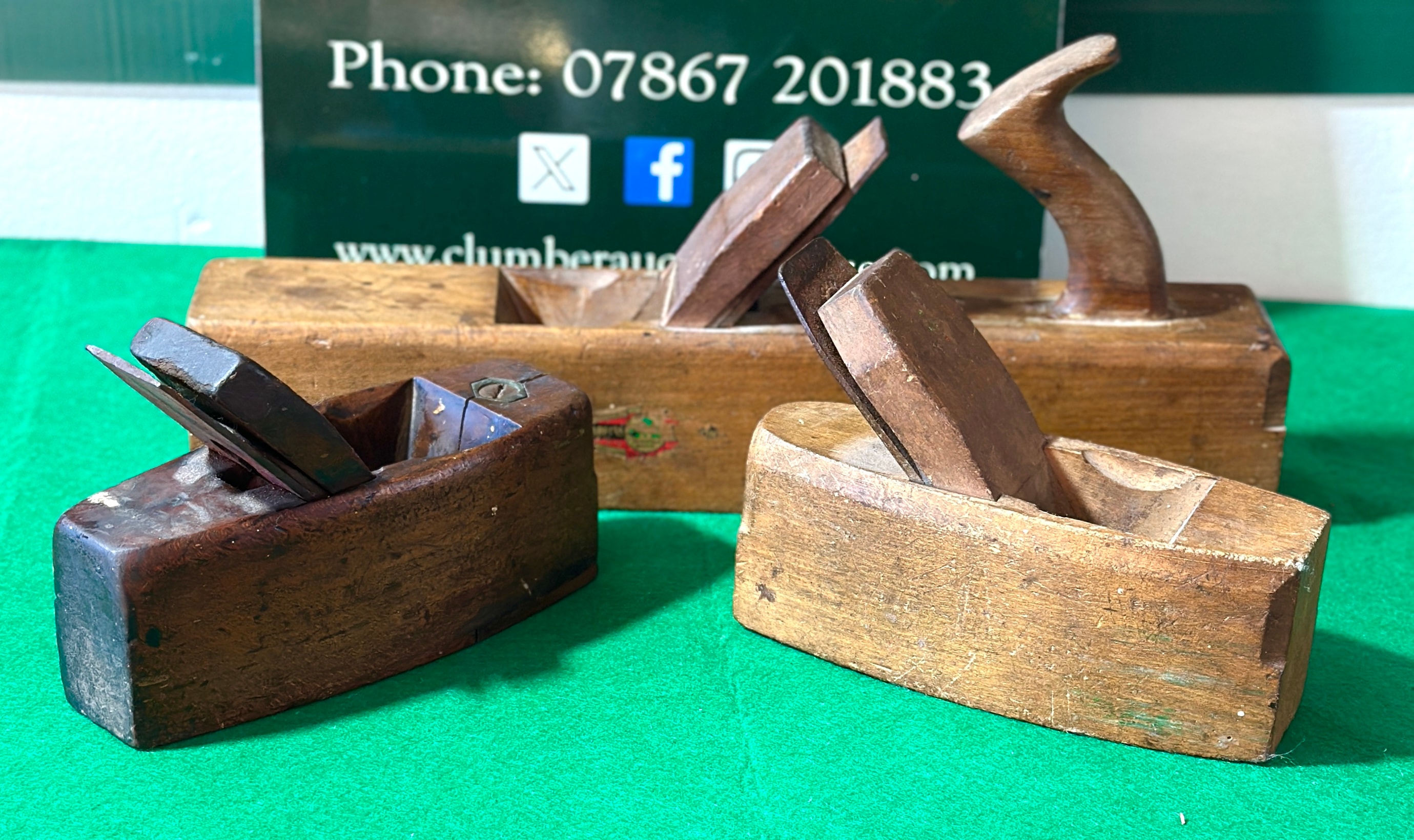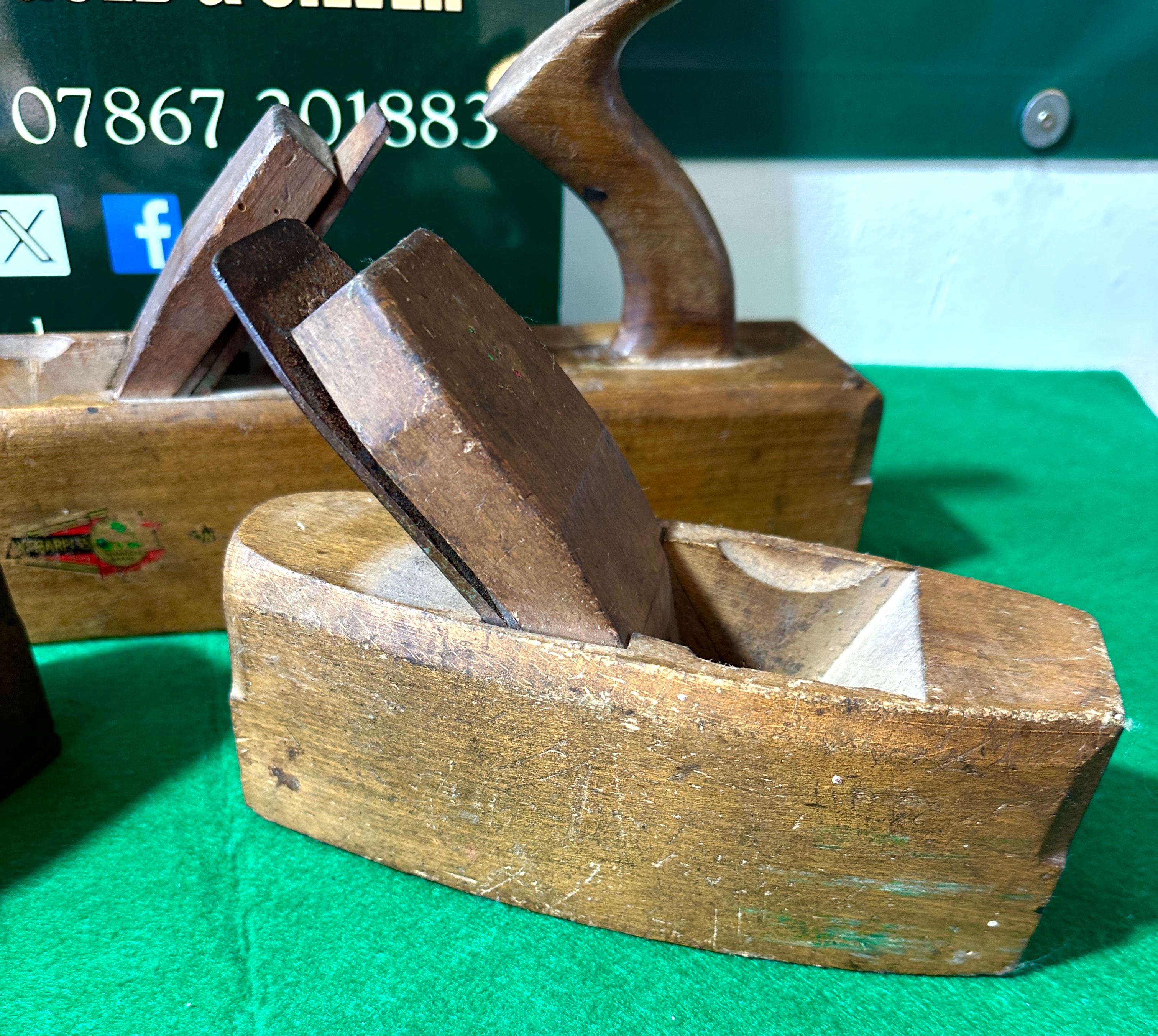 A collection of three antique or vintage wooden-bodied hand planes. This group includes two ‘coffin’ style block planes, consistent with examples attributed to Sargent & Co US in market research. The third, larger plane is a bench-style plane with a distinct shaped handle. It bears a partially legible label on its side, appearing to read “MARPles,” suggesting a possible manufacturer. Each tool is crafted from hardwood, incorporating metal irons secured by wooden wedges.