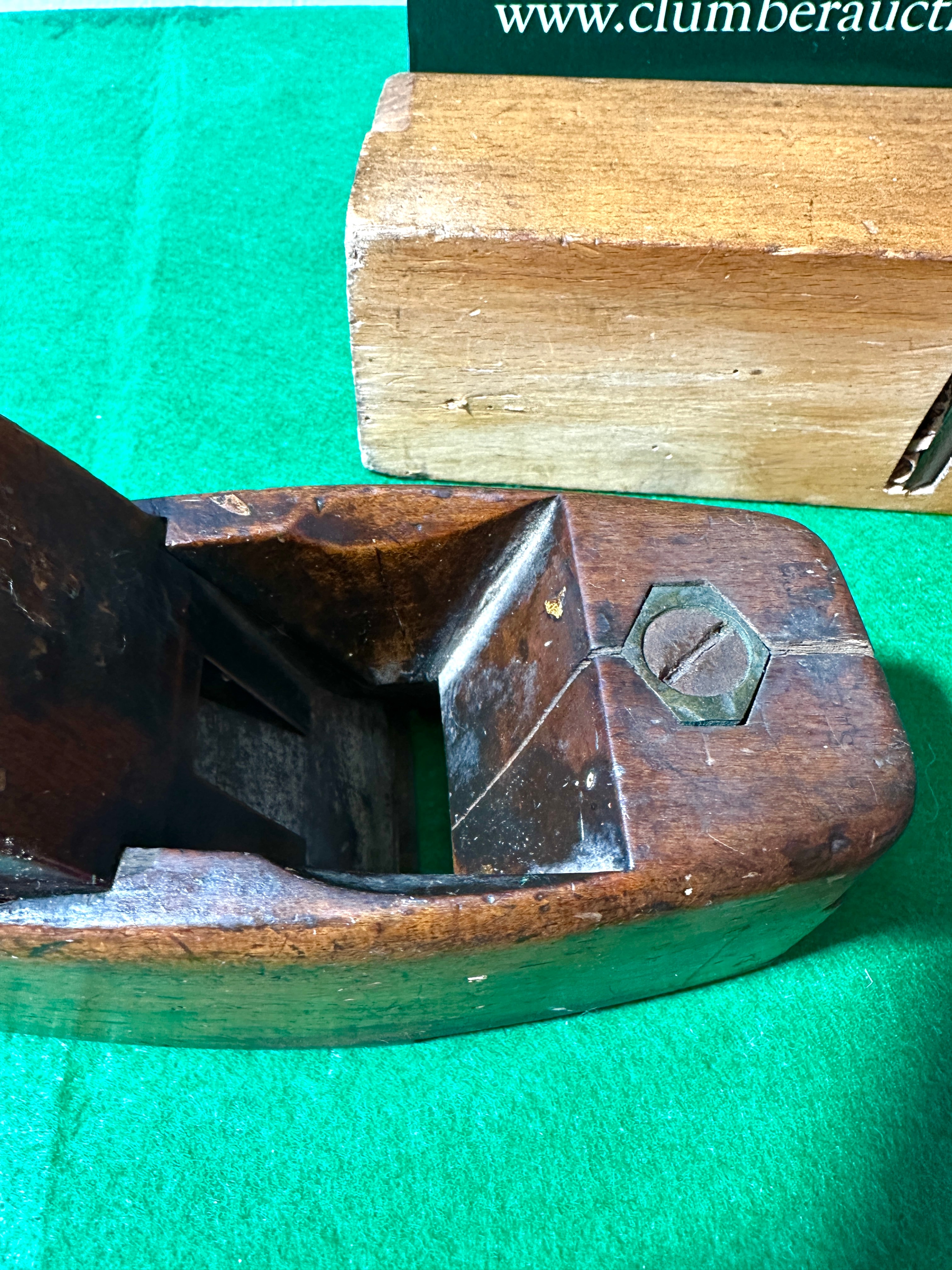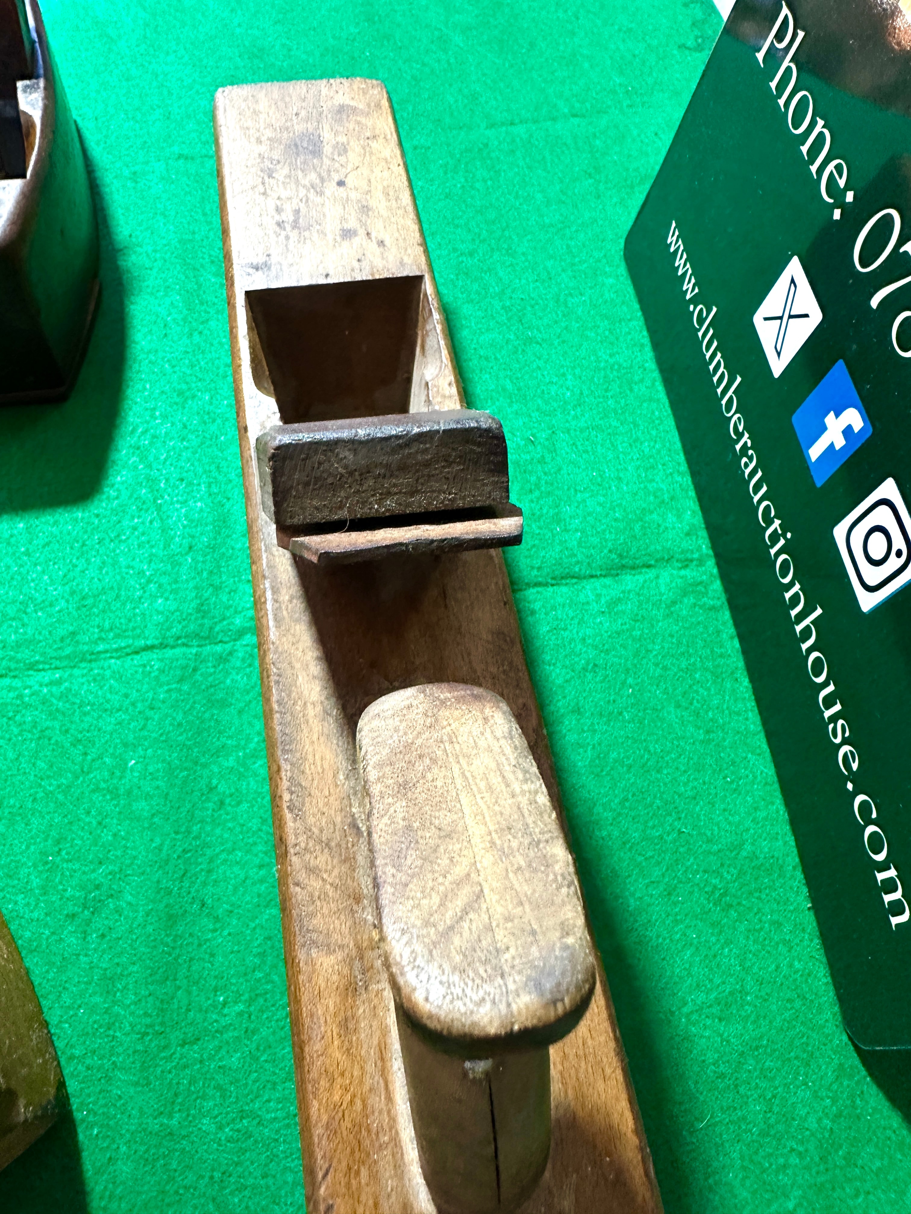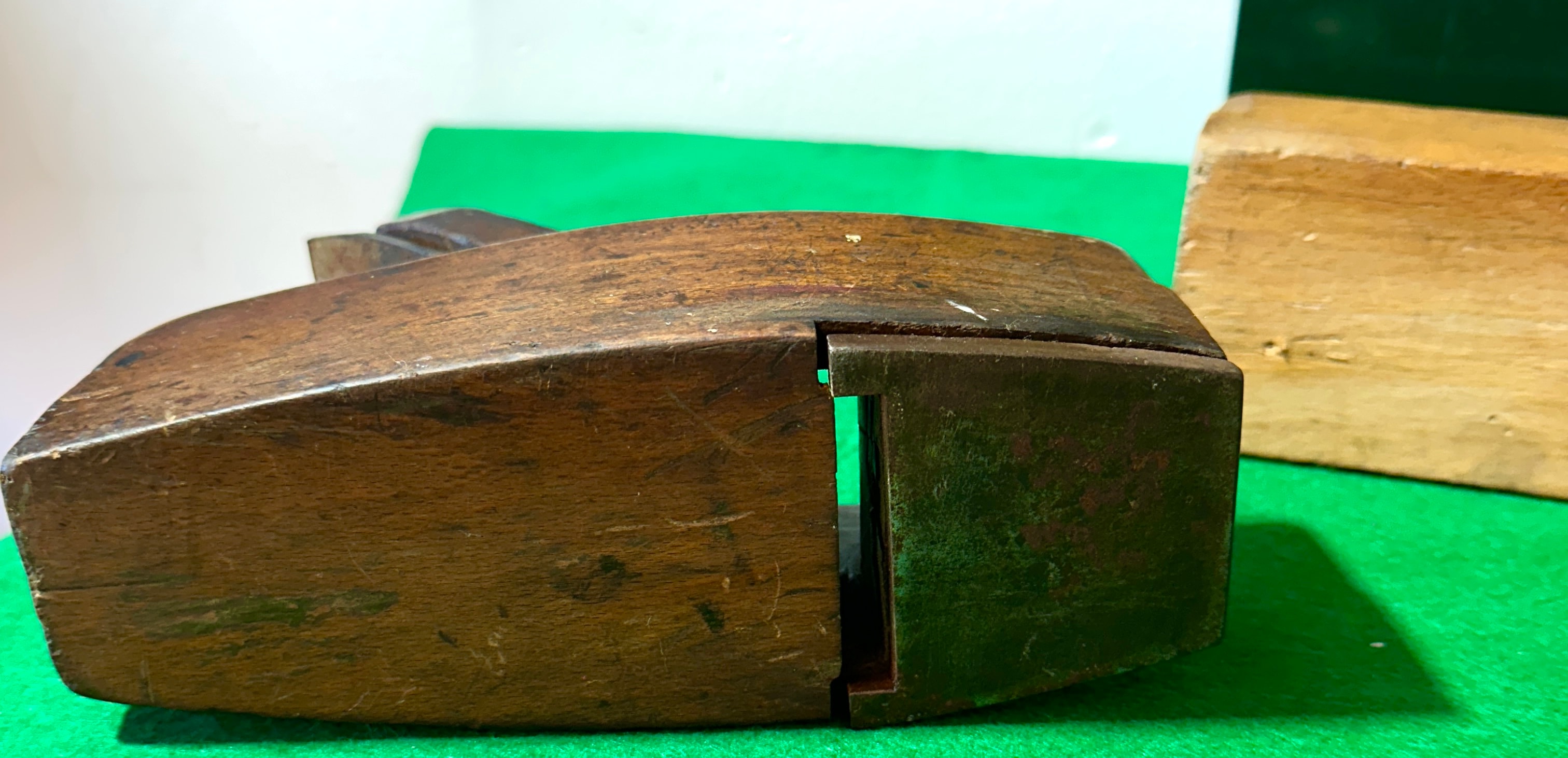 A collection of three antique or vintage wooden-bodied hand planes. This group includes two ‘coffin’ style block planes, consistent with examples attributed to Sargent & Co US in market research. The third, larger plane is a bench-style plane with a distinct shaped handle. It bears a partially legible label on its side, appearing to read “MARPles,” suggesting a possible manufacturer. Each tool is crafted from hardwood, incorporating metal irons secured by wooden wedges.