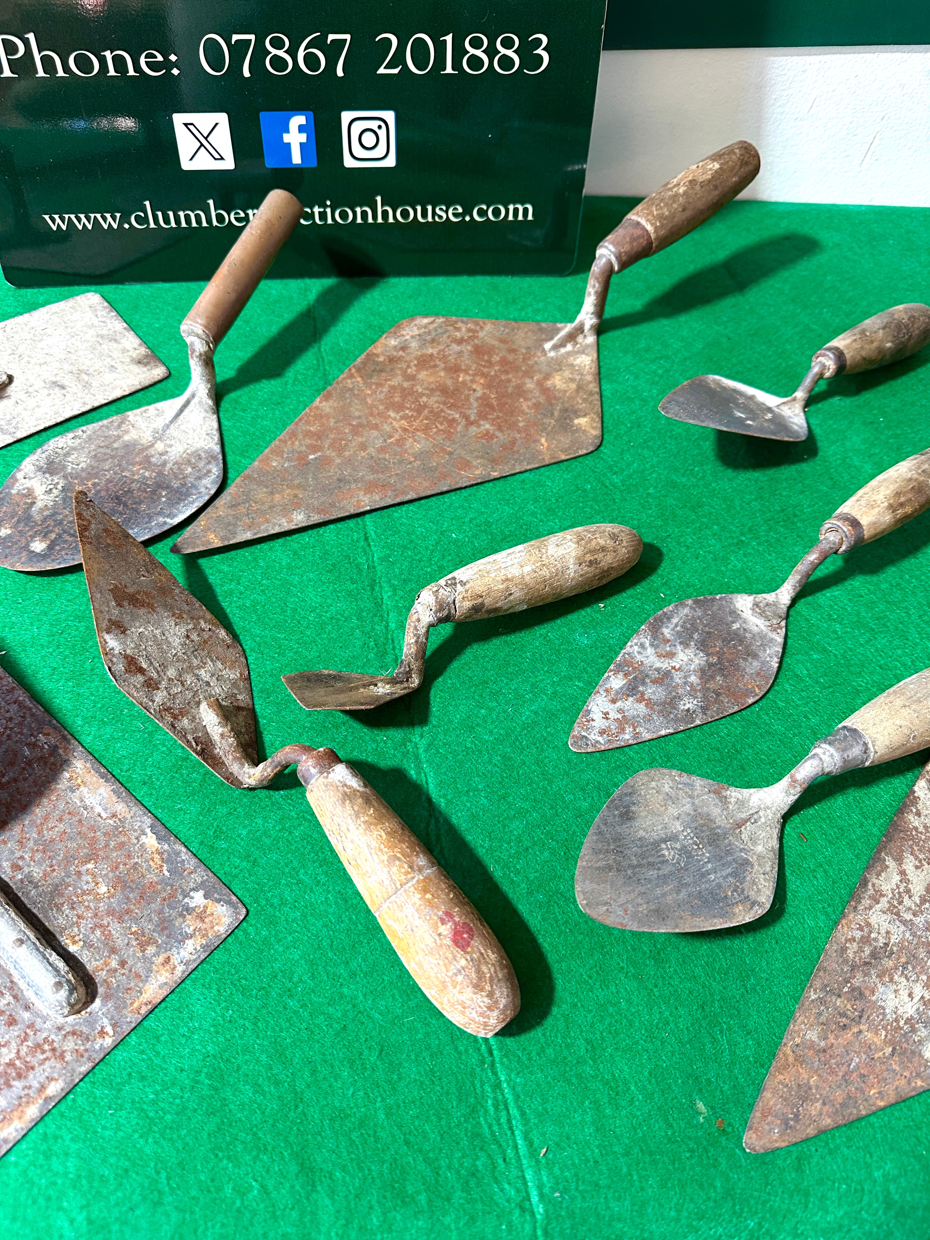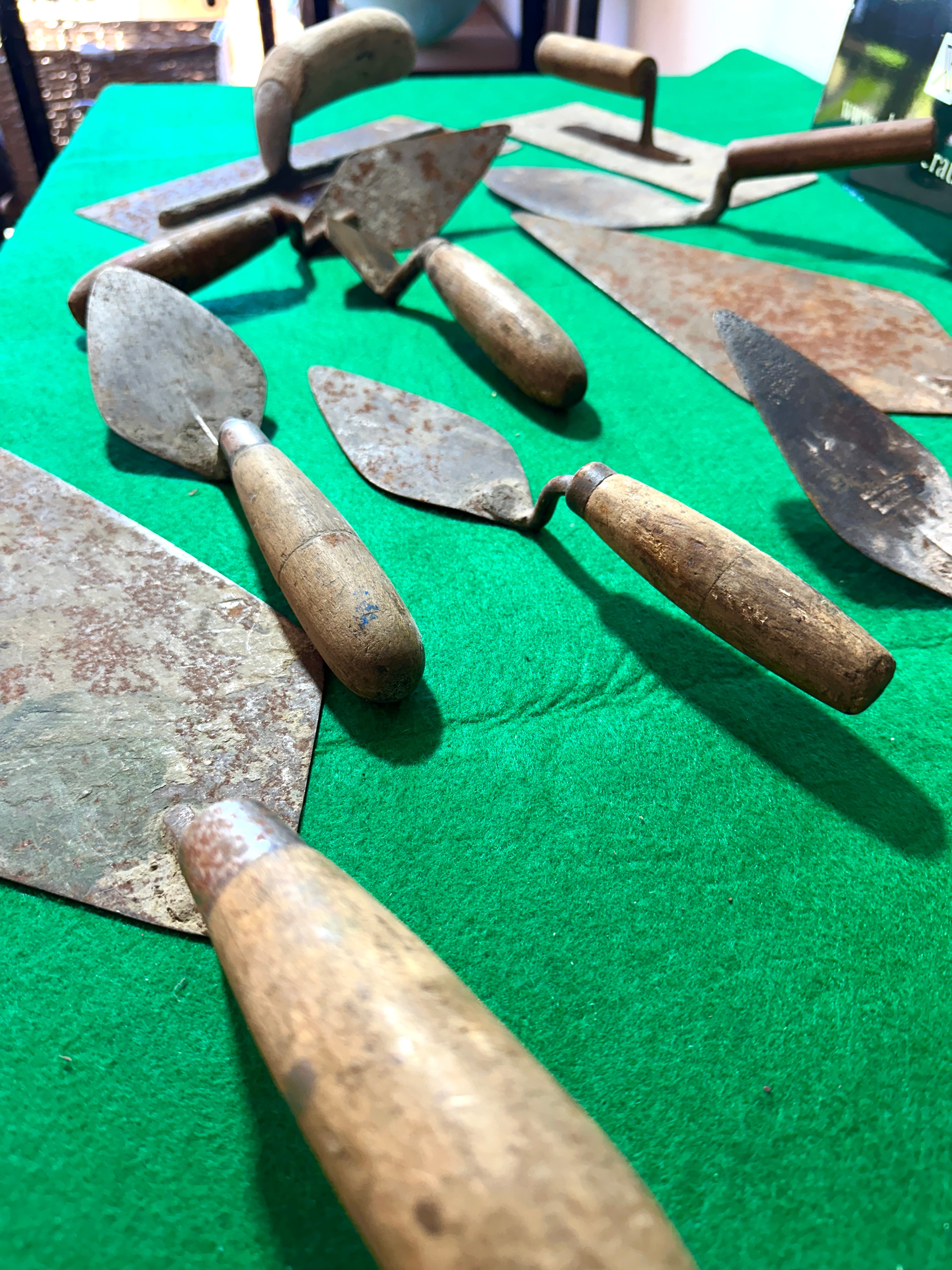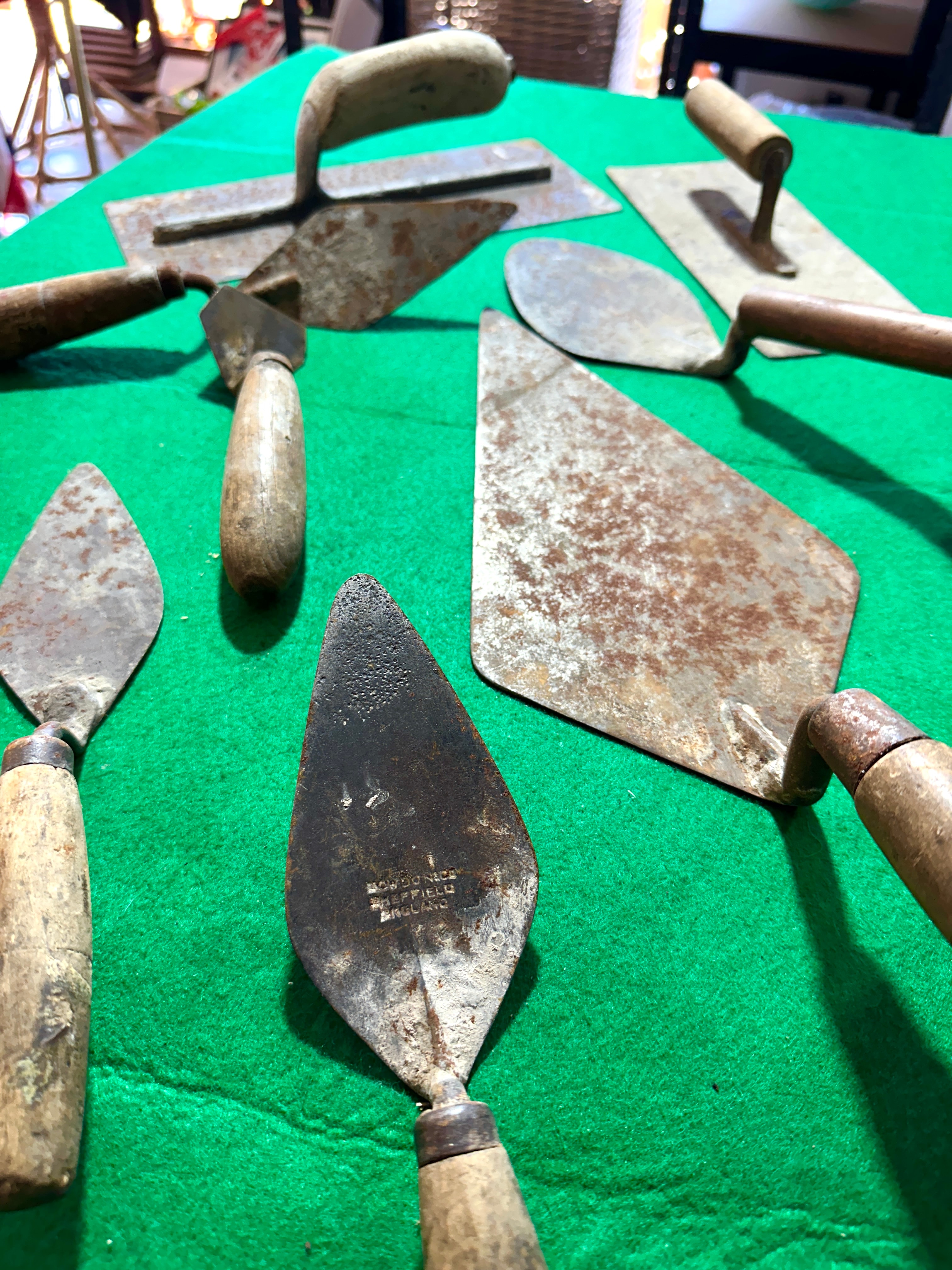 This lot comprises ten assorted vintage hand tools, predominantly various types of masonry and plastering trowels and floats. The tools feature metal blades, likely steel or iron, paired with natural wooden handles. Blade shapes vary, including pointing trowels, brick trowels, and rectangular plastering floats. One diamond-shaped trowel clearly bears the stamped maker’s mark “S. & J. KITCHEN SHEFFIELD ENGLAND” on its blade. Another trowel is stamped “W. TYZACK SHEFFIELD ENGLAND”.