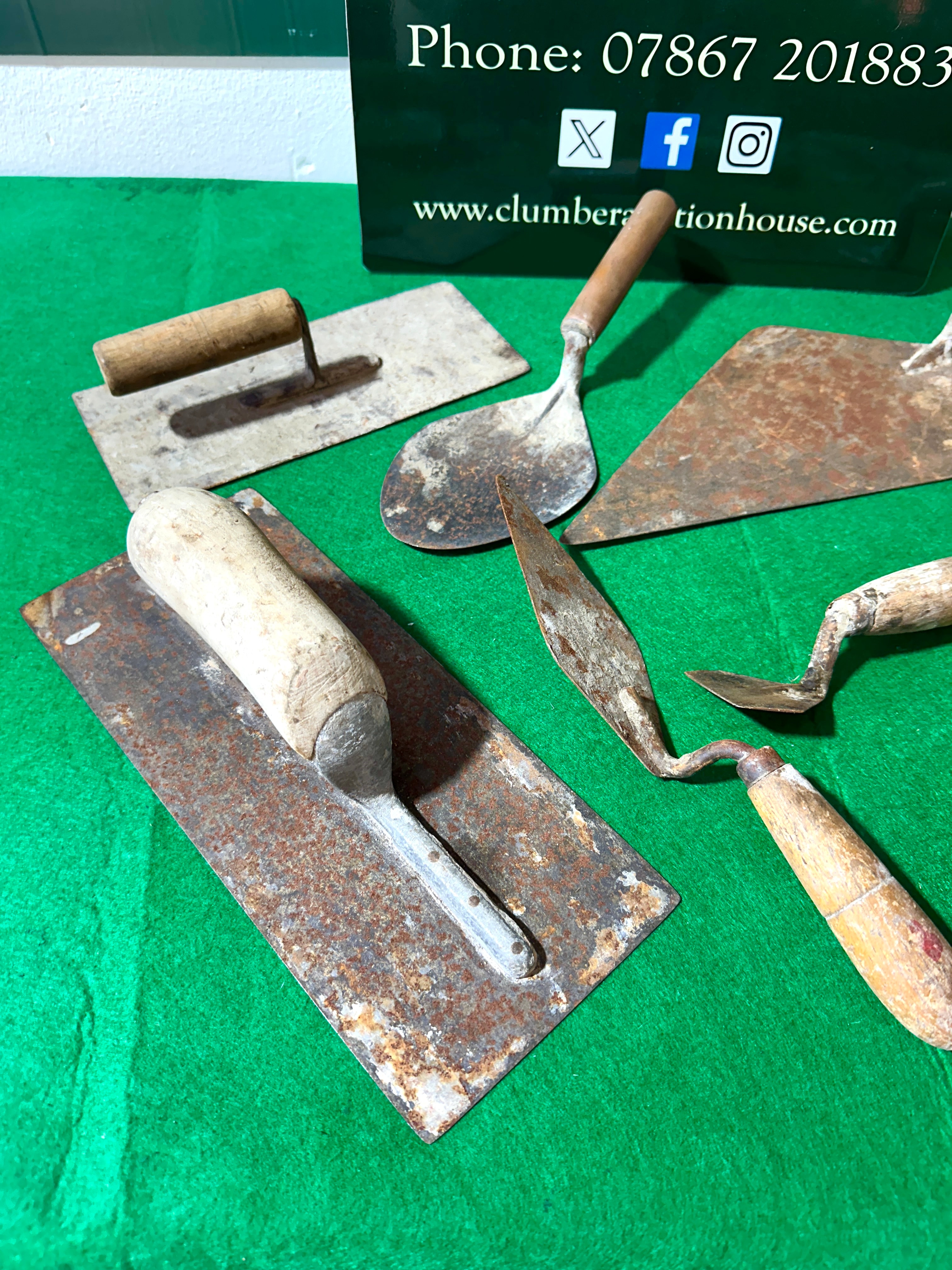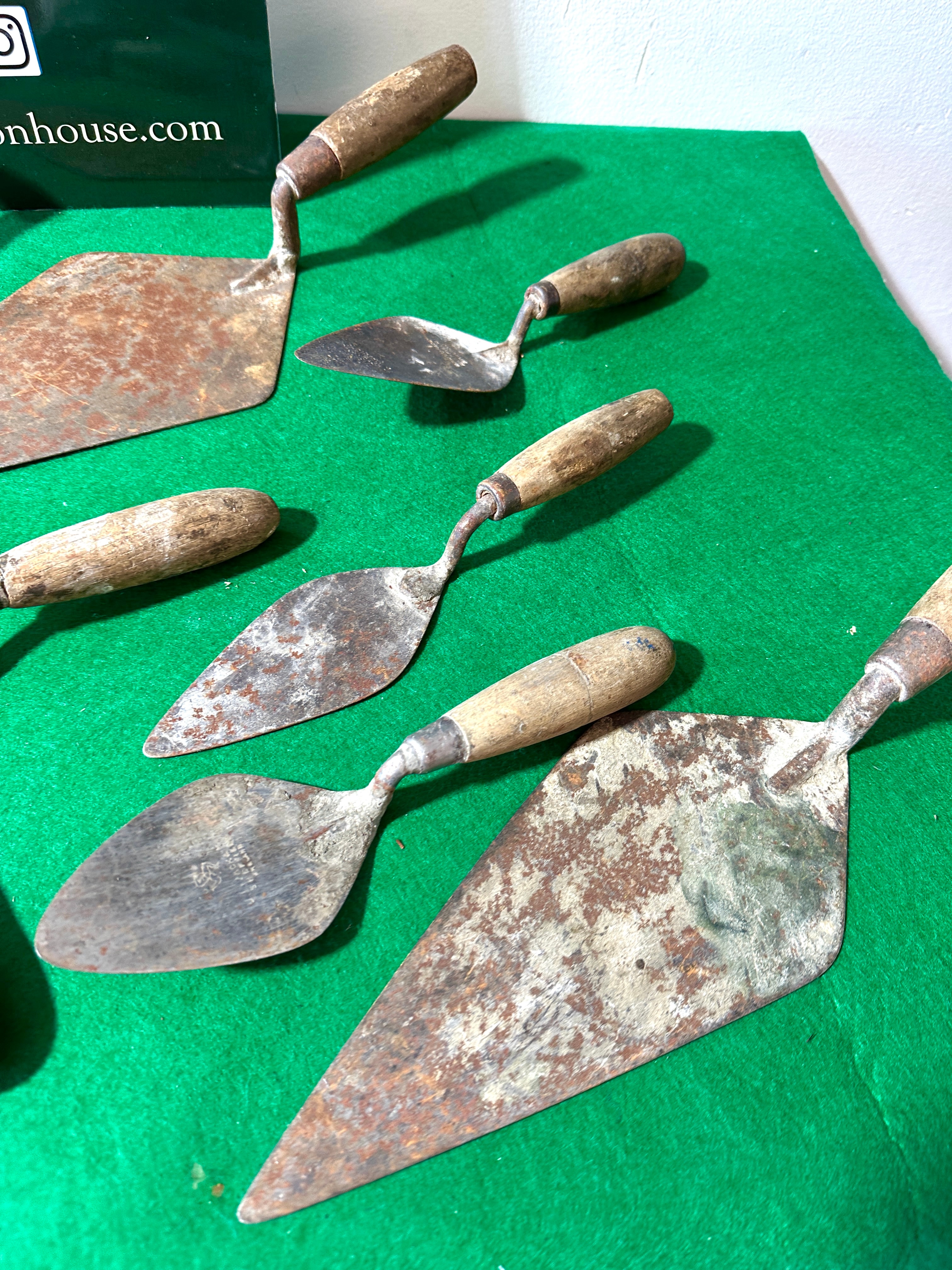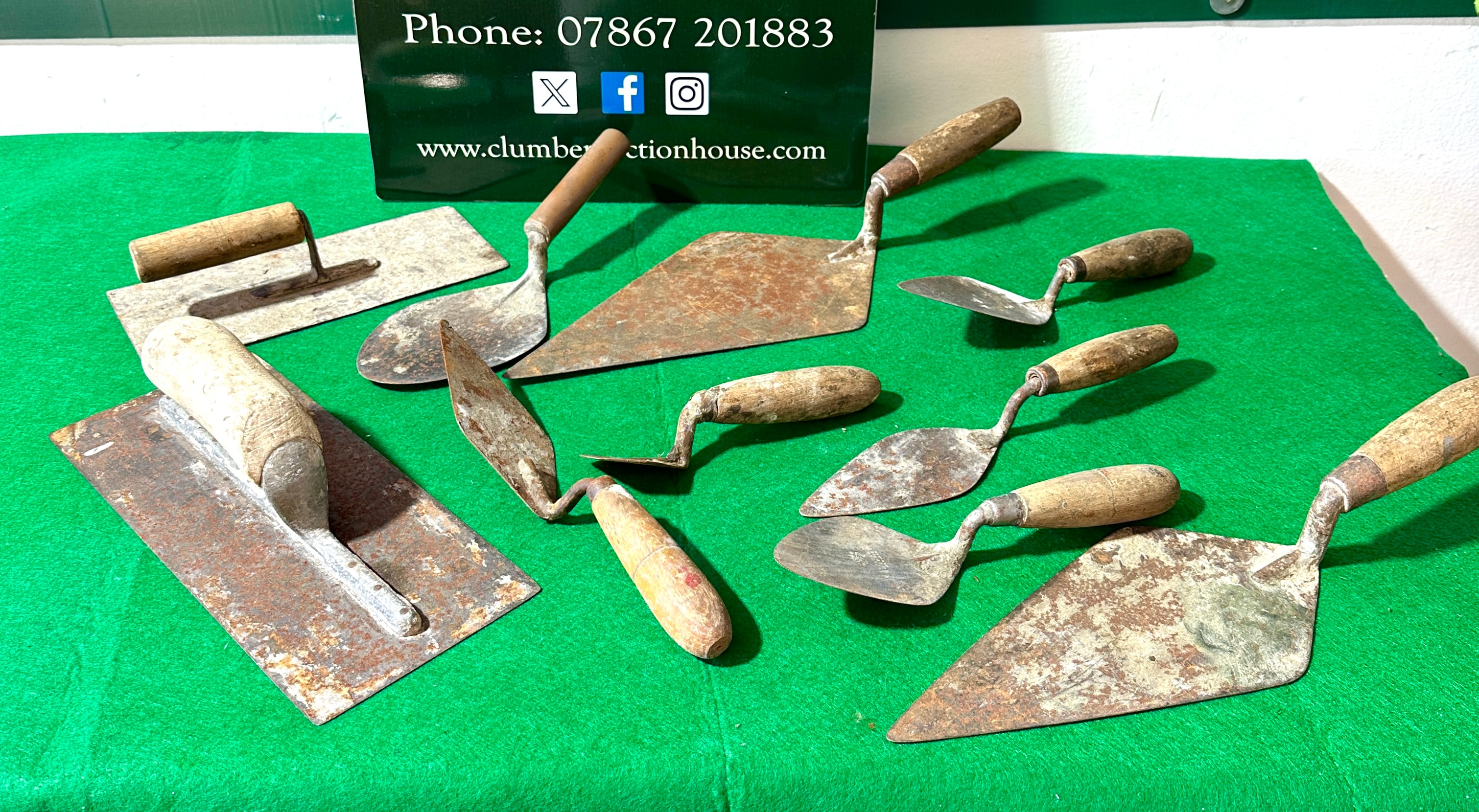 This lot comprises ten assorted vintage hand tools, predominantly various types of masonry and plastering trowels and floats. The tools feature metal blades, likely steel or iron, paired with natural wooden handles. Blade shapes vary, including pointing trowels, brick trowels, and rectangular plastering floats. One diamond-shaped trowel clearly bears the stamped maker’s mark “S. & J. KITCHEN SHEFFIELD ENGLAND” on its blade. Another trowel is stamped “W. TYZACK SHEFFIELD ENGLAND”.