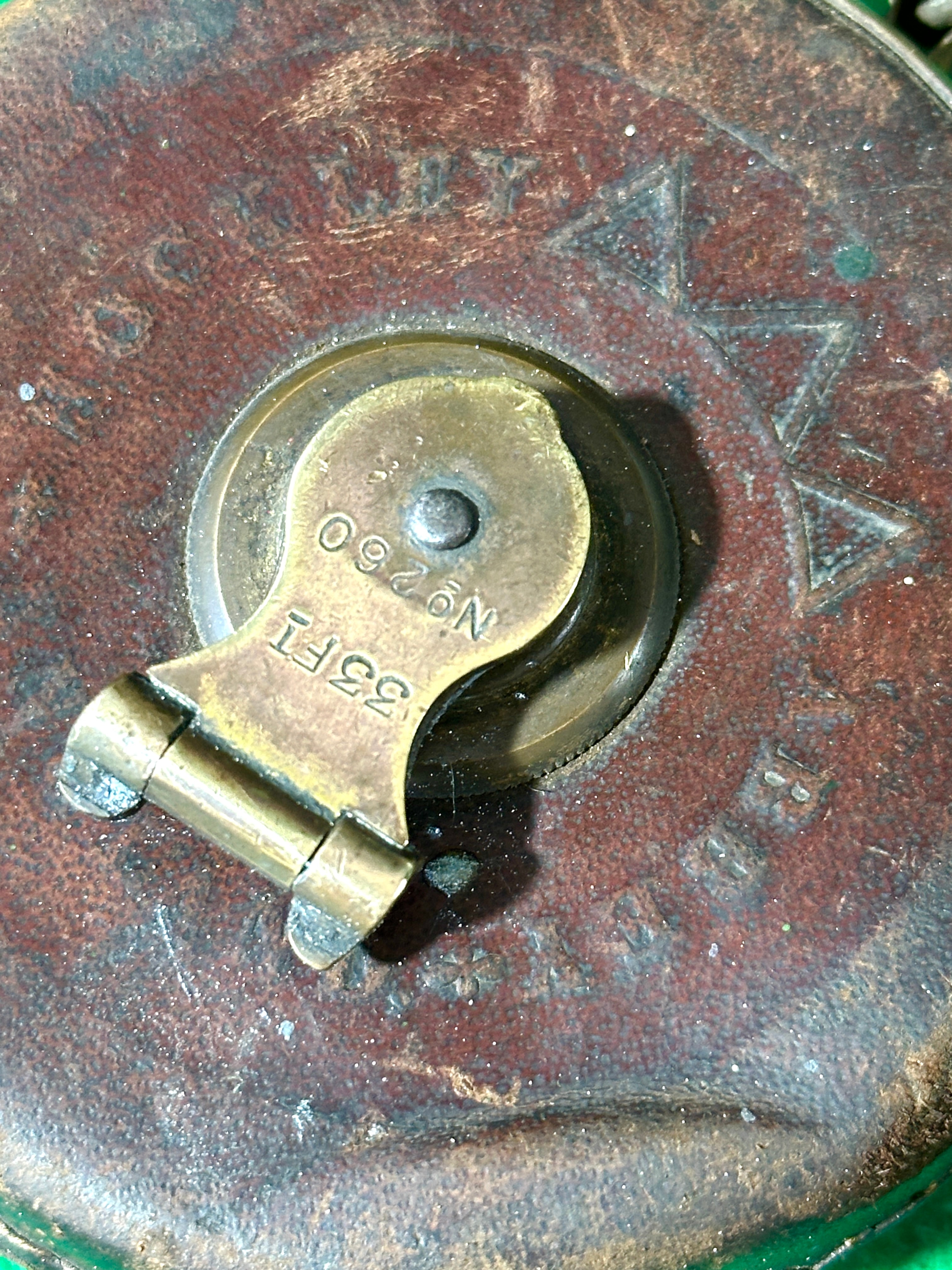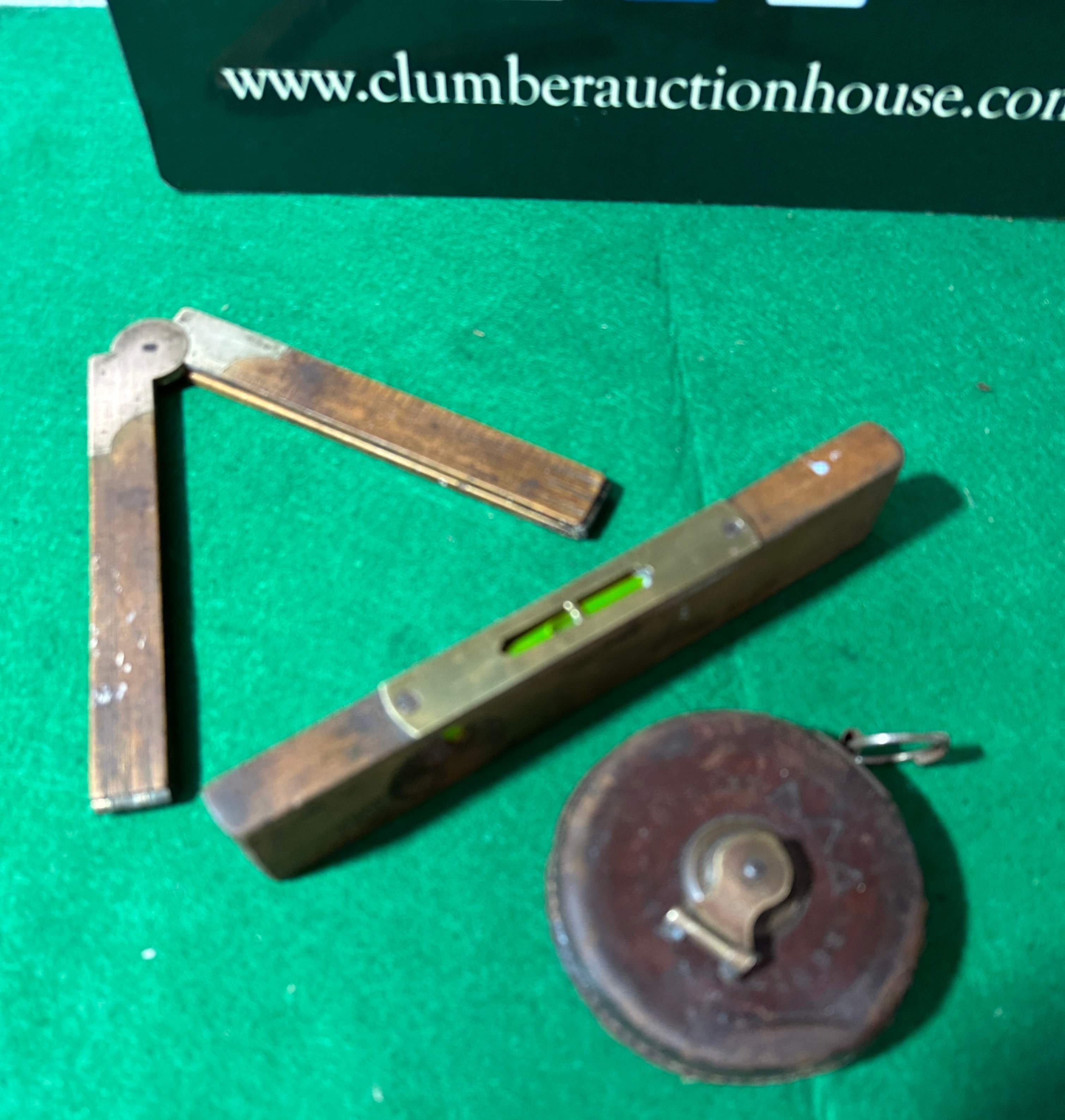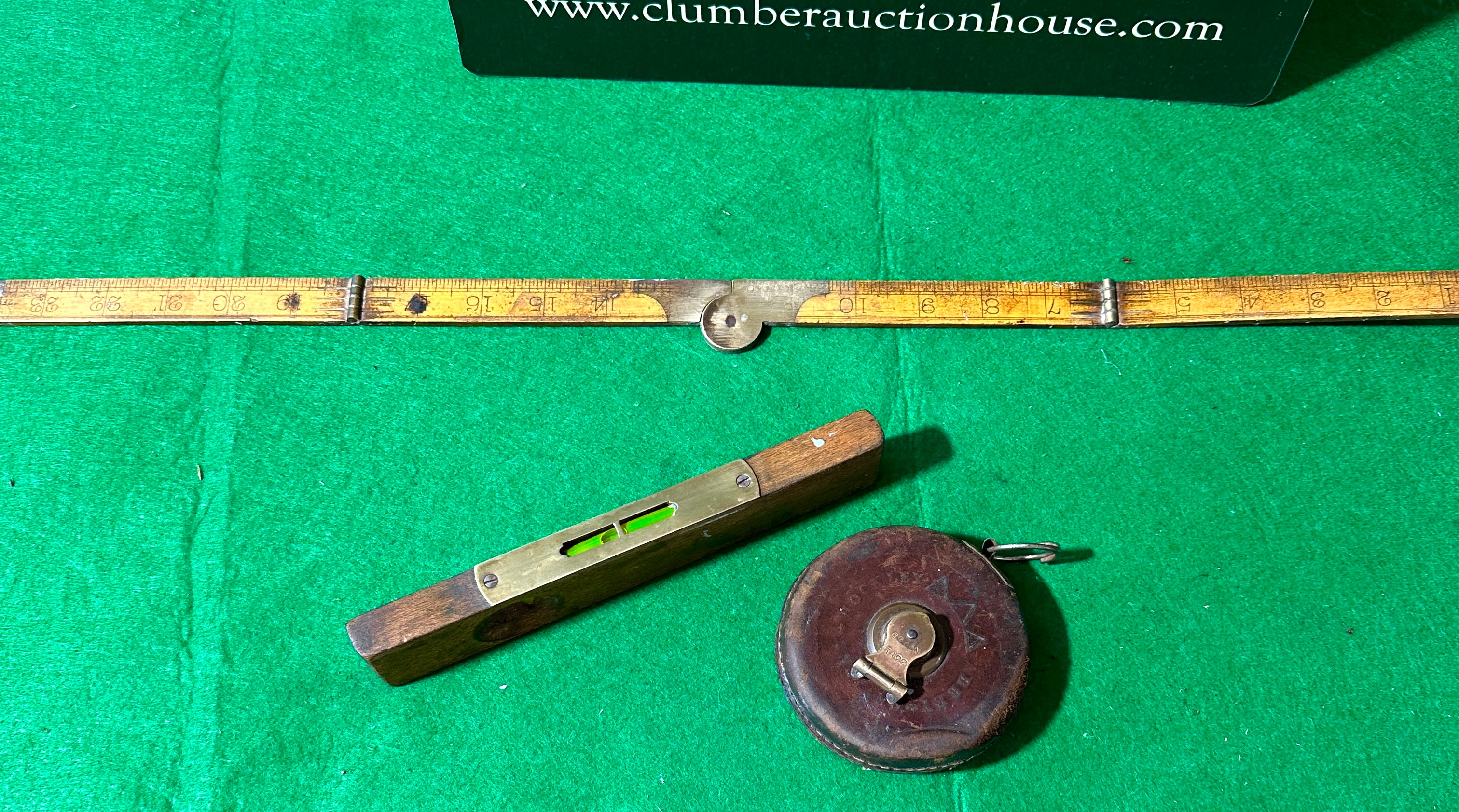 This lot comprises three antique/vintage measuring instruments. The first is a wooden folding rule with brass hinge plates, featuring legible numerical markings up to 24 inches. The second item is a wooden spirit level with a brass top plate encasing an intact green spirit vial. The third is a fabric measuring tape housed within a circular, worn leather case embossed with a star motif and faint text, possibly reading ‘BEST QUALITY’. Its brass winding handle is clearly marked ’33FT’ and ‘Nº 760’, and the fabric tape displays faded numerical scales.