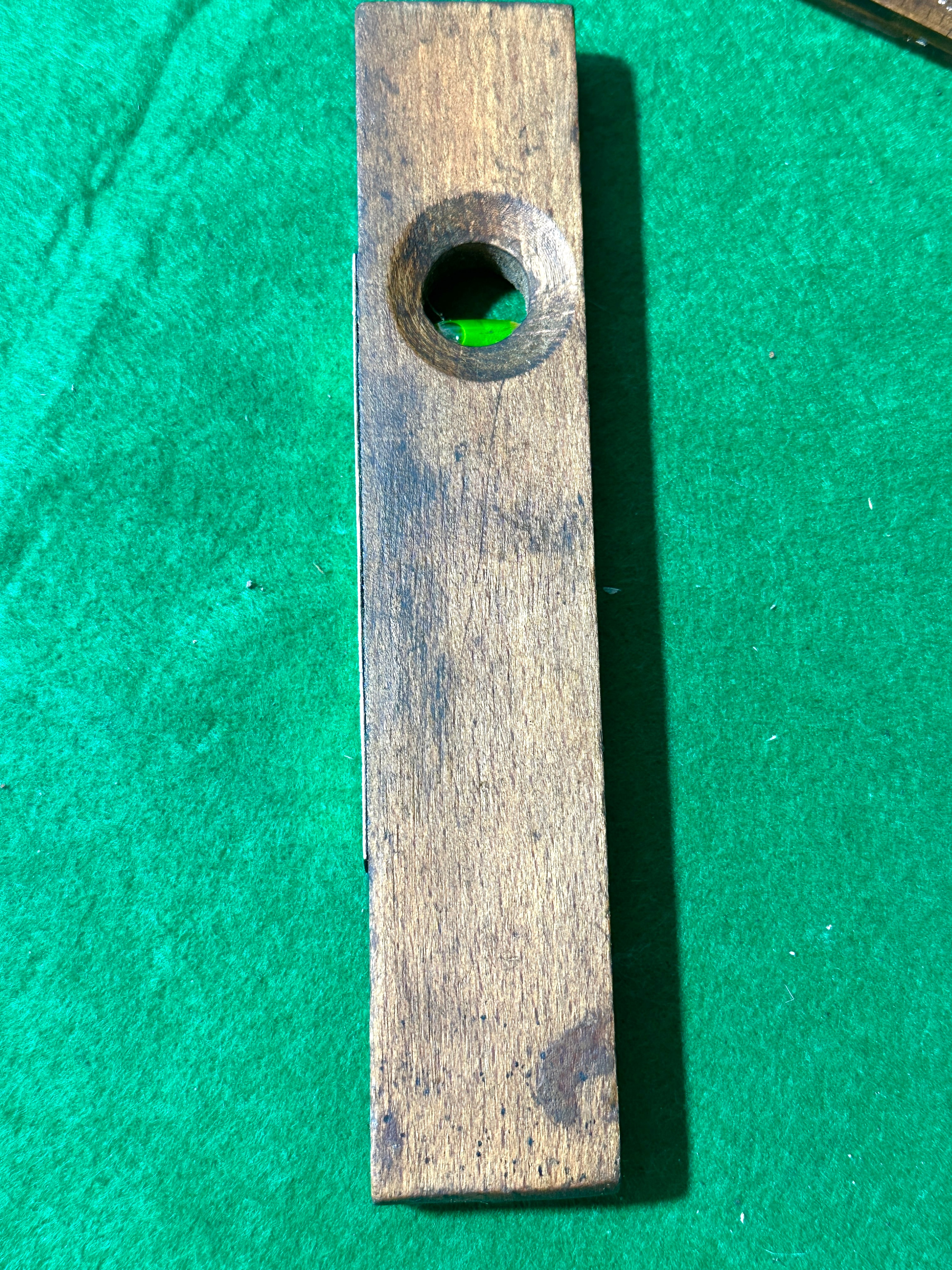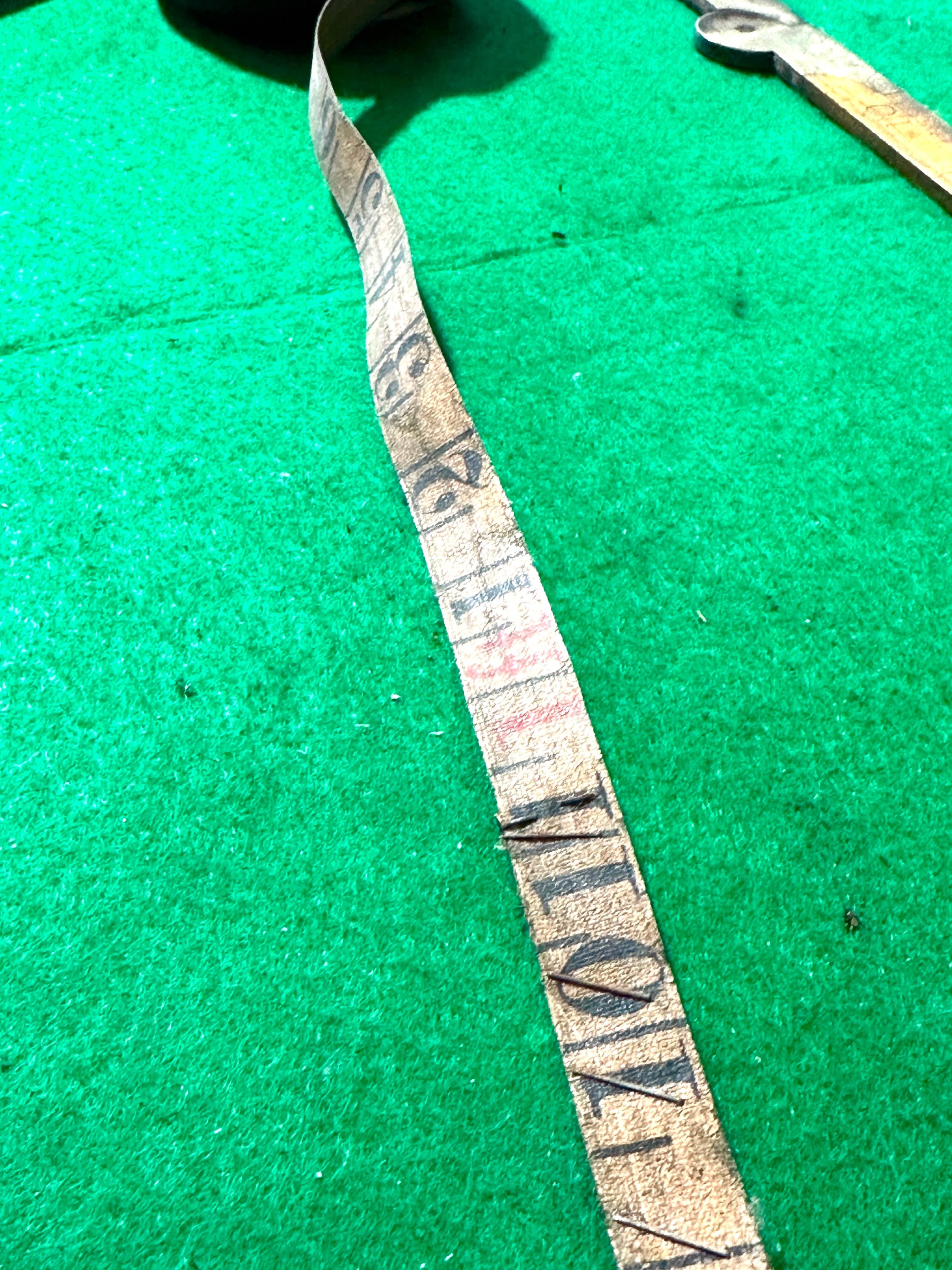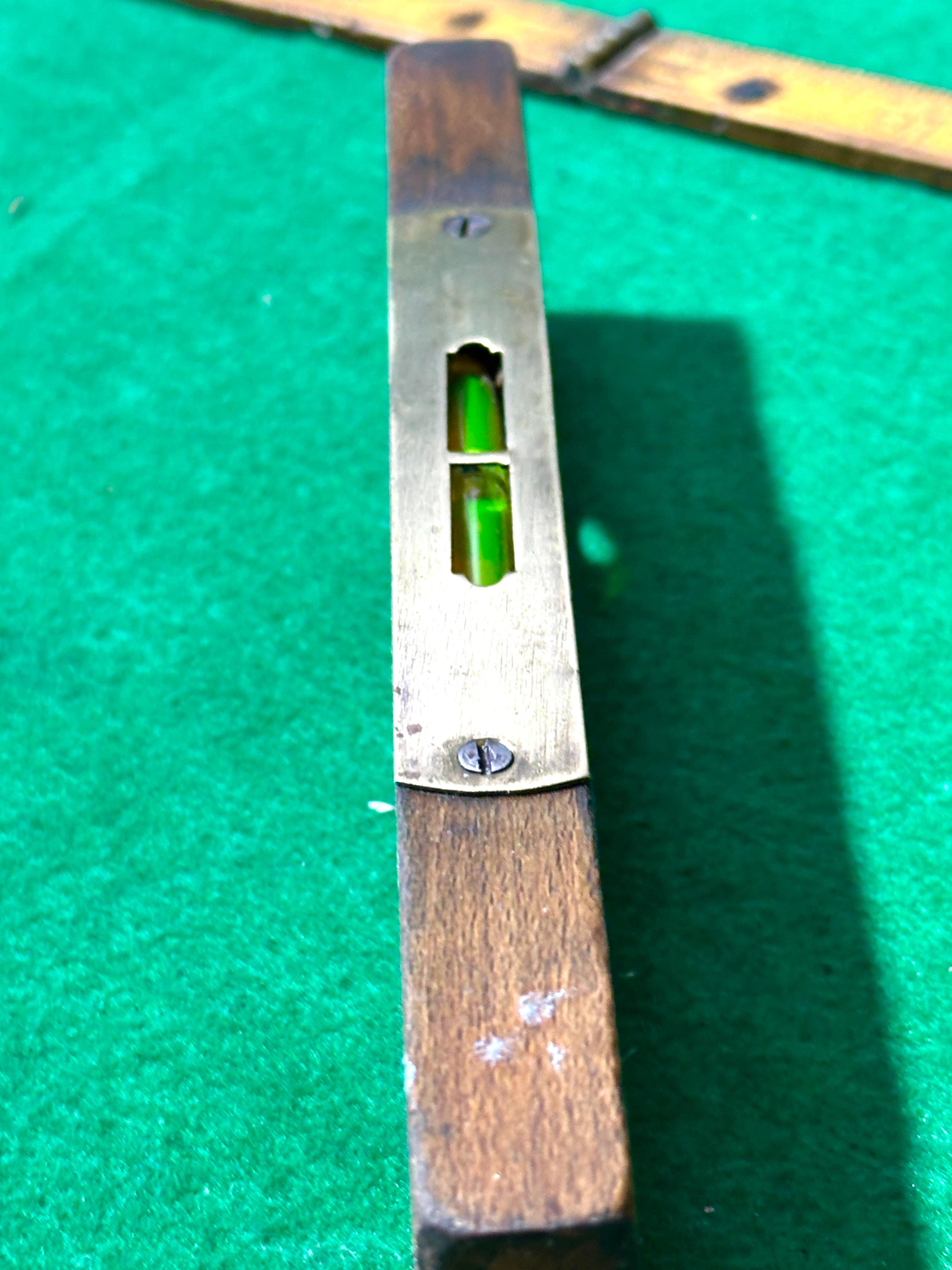 This lot comprises three antique/vintage measuring instruments. The first is a wooden folding rule with brass hinge plates, featuring legible numerical markings up to 24 inches. The second item is a wooden spirit level with a brass top plate encasing an intact green spirit vial. The third is a fabric measuring tape housed within a circular, worn leather case embossed with a star motif and faint text, possibly reading ‘BEST QUALITY’. Its brass winding handle is clearly marked ’33FT’ and ‘Nº 760’, and the fabric tape displays faded numerical scales.