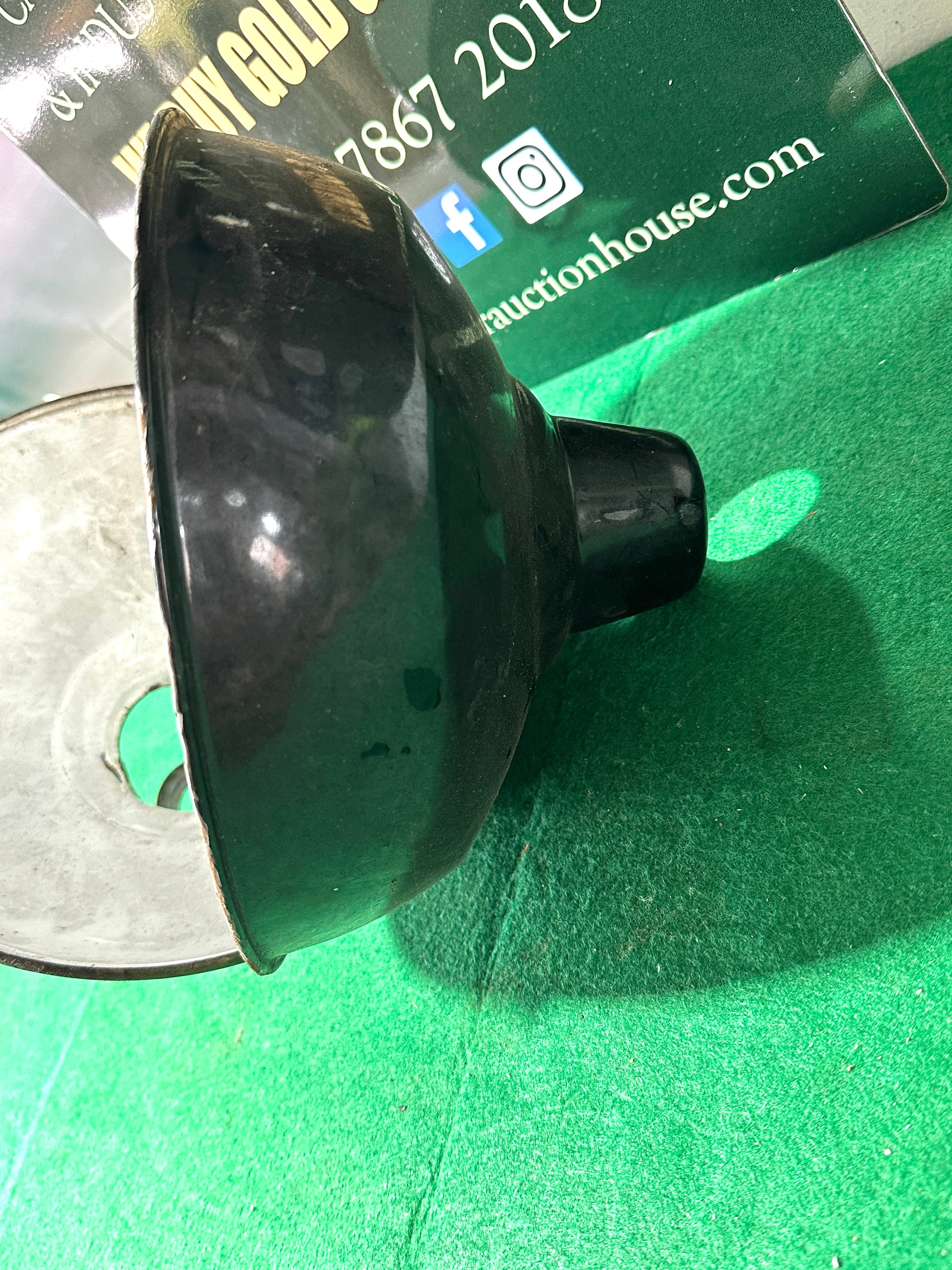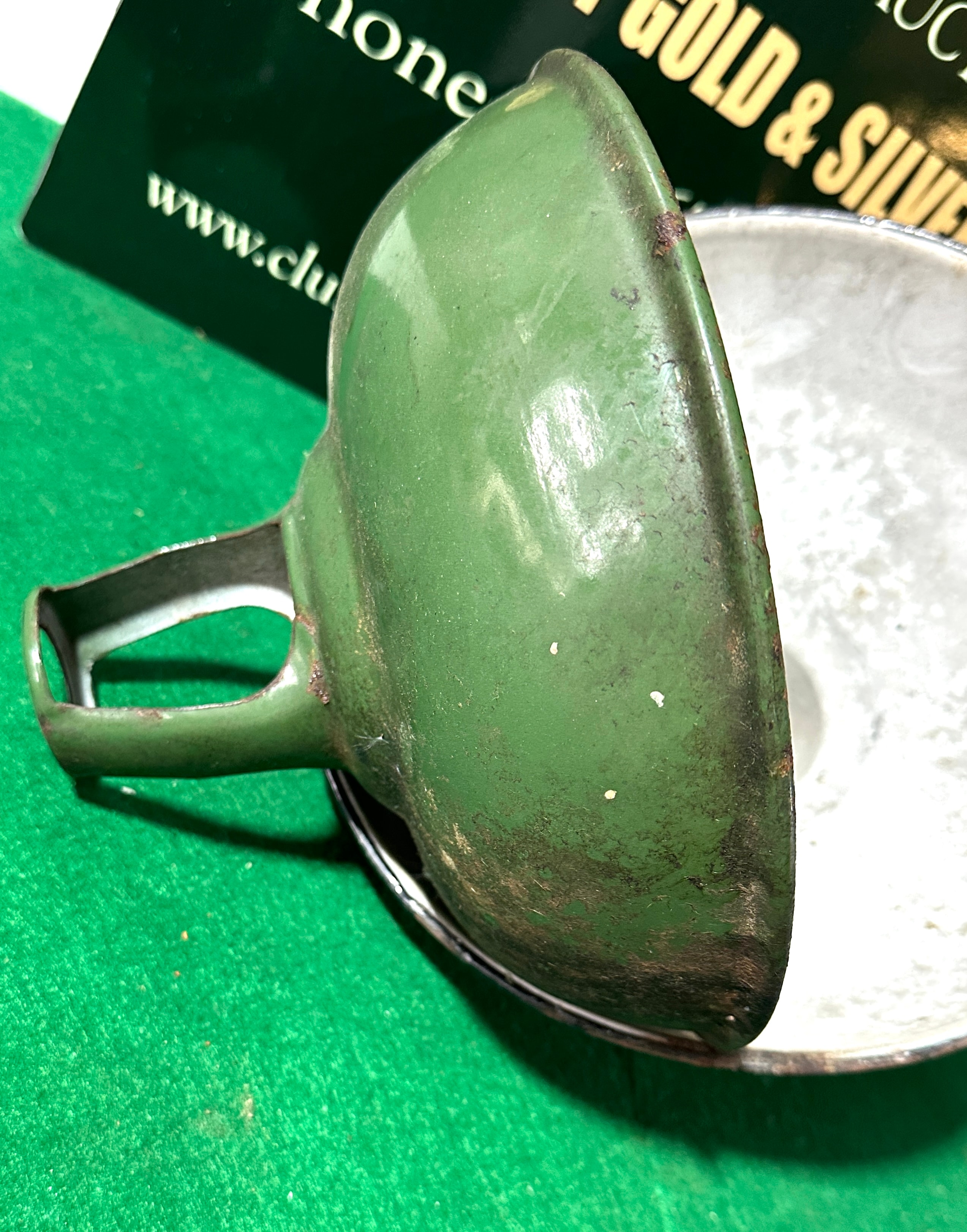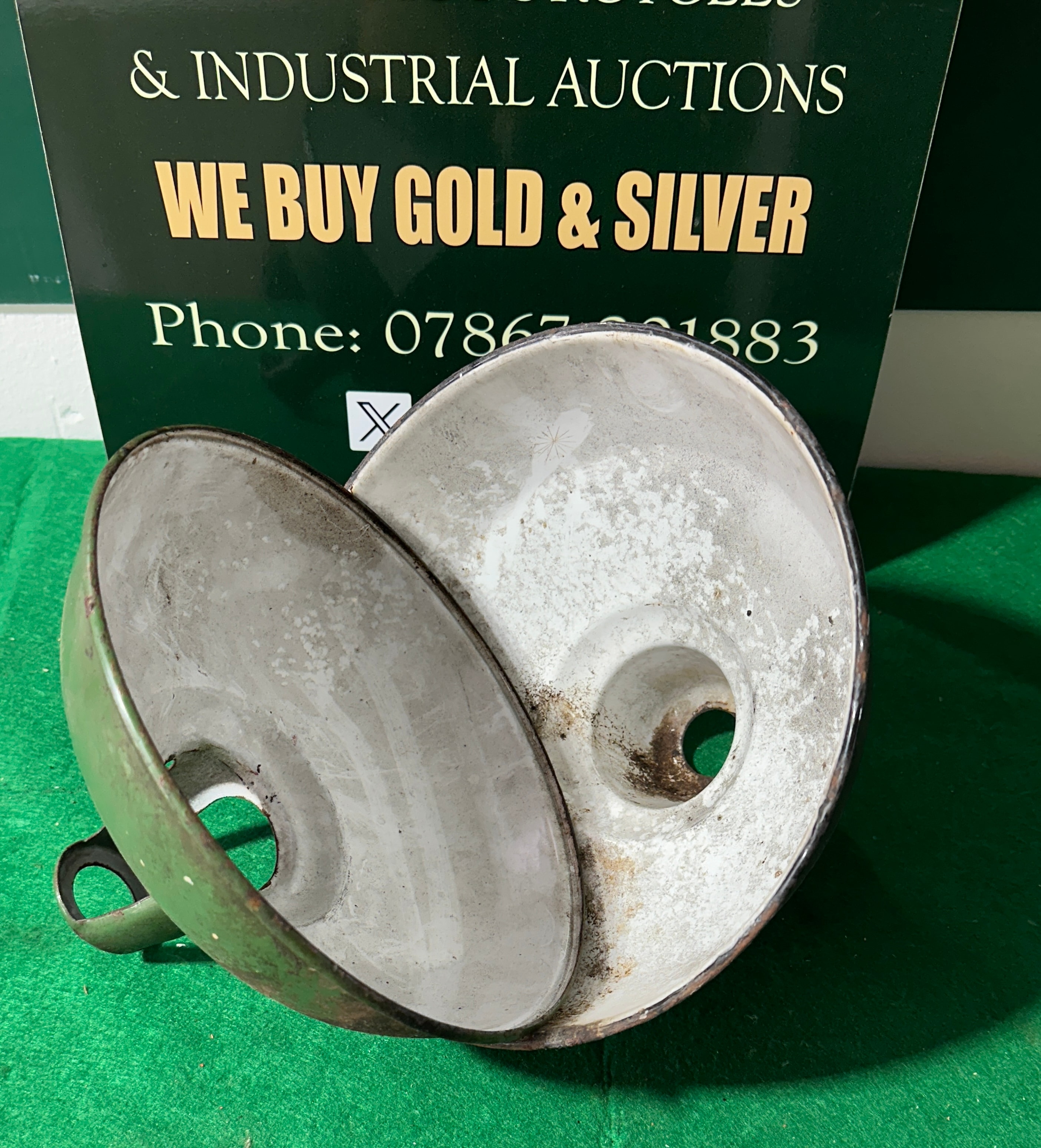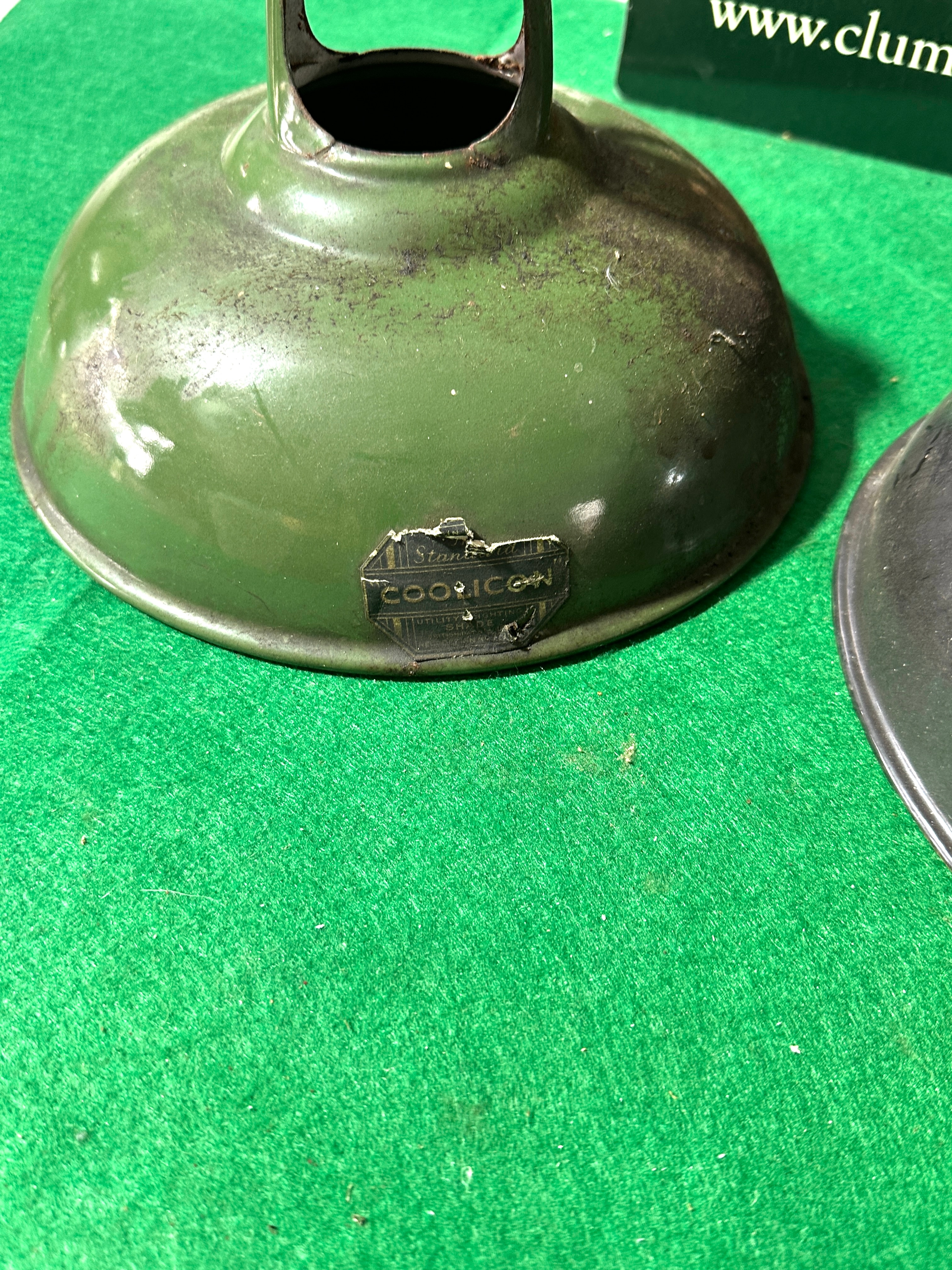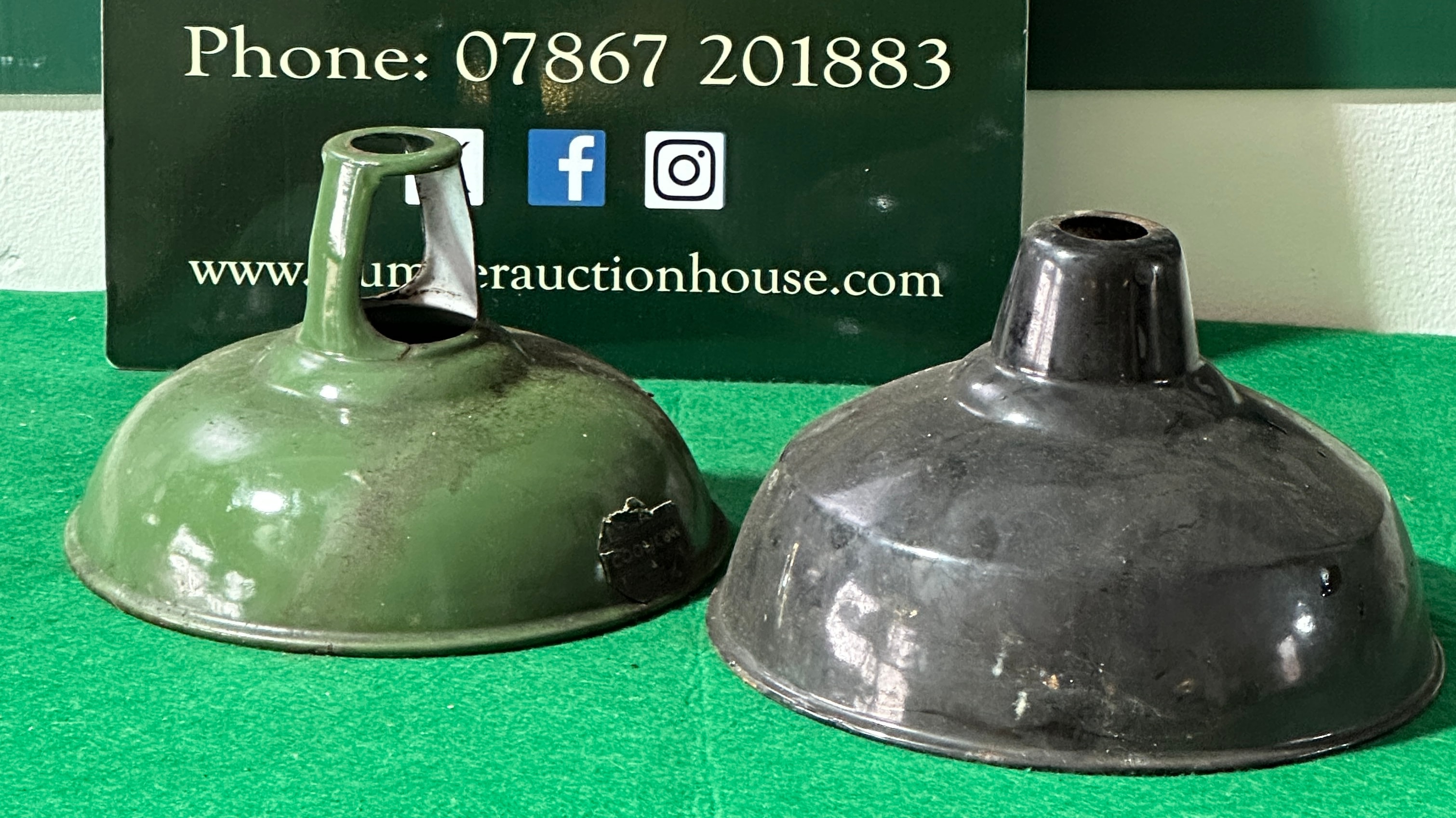 A pair of 1930s industrial Italian pendants, comprising two bell-shaped metal objects, likely light shades, coated in enamel. One object is dark green with a distinct handle-like or mounting bracket at its narrower top, and features a partially legible manufacturer’s mark on its side that appears to begin with ‘COOP’. The second object is solid black. Both items have a contrasting white or off-white enamel interior.