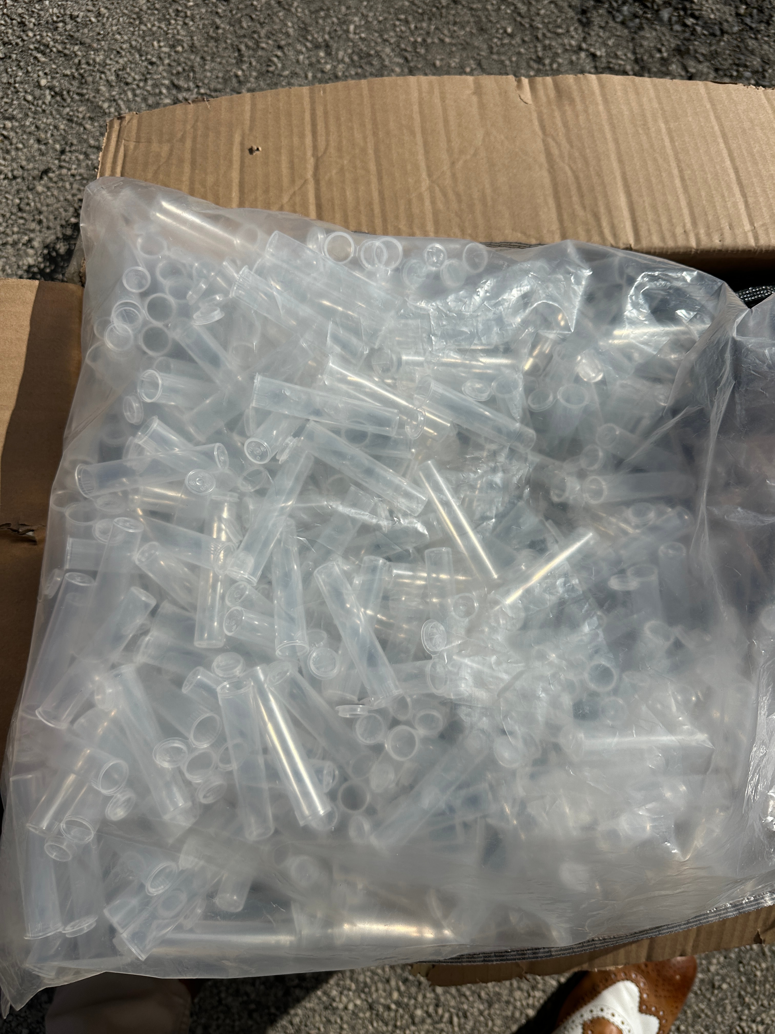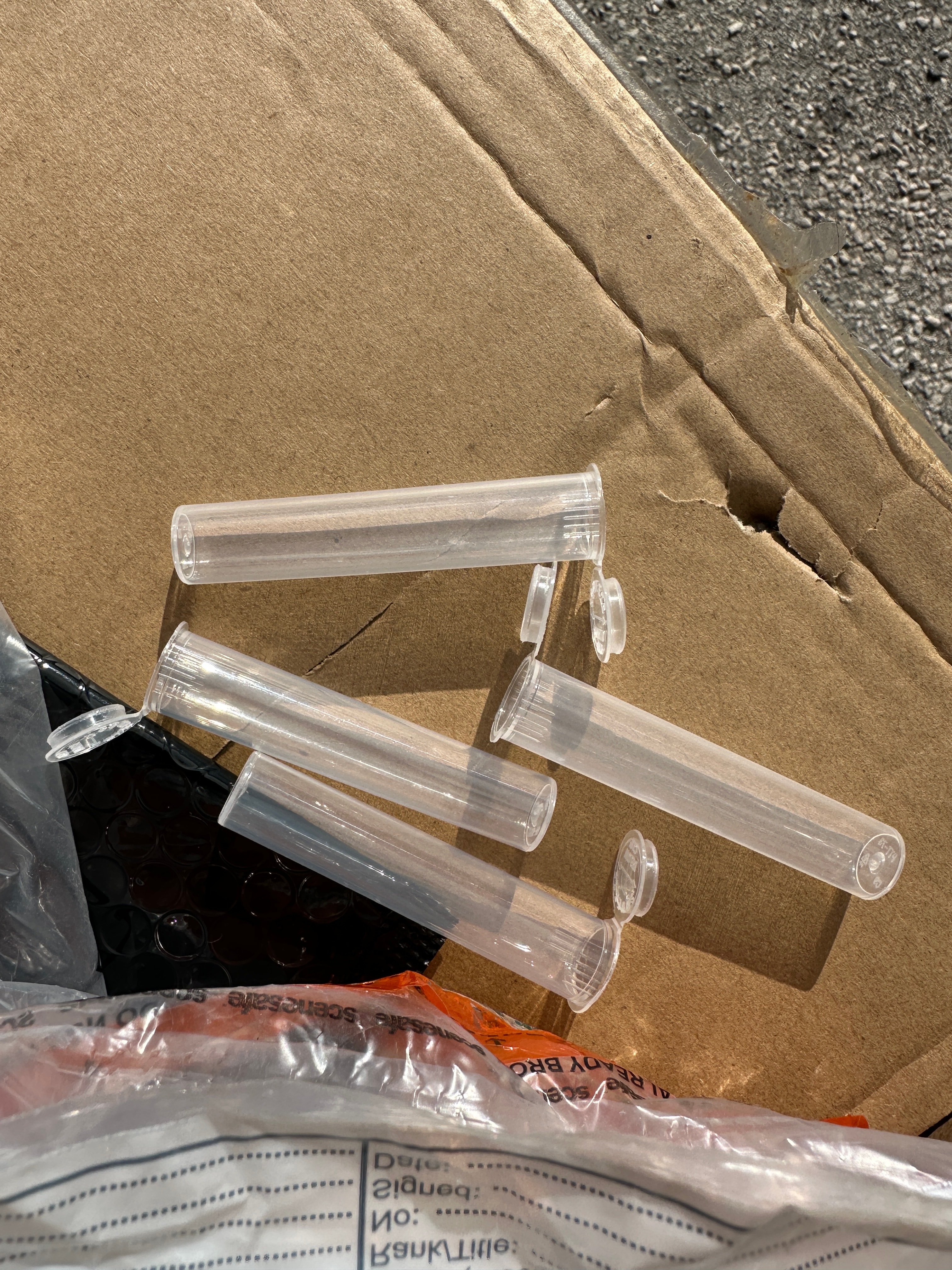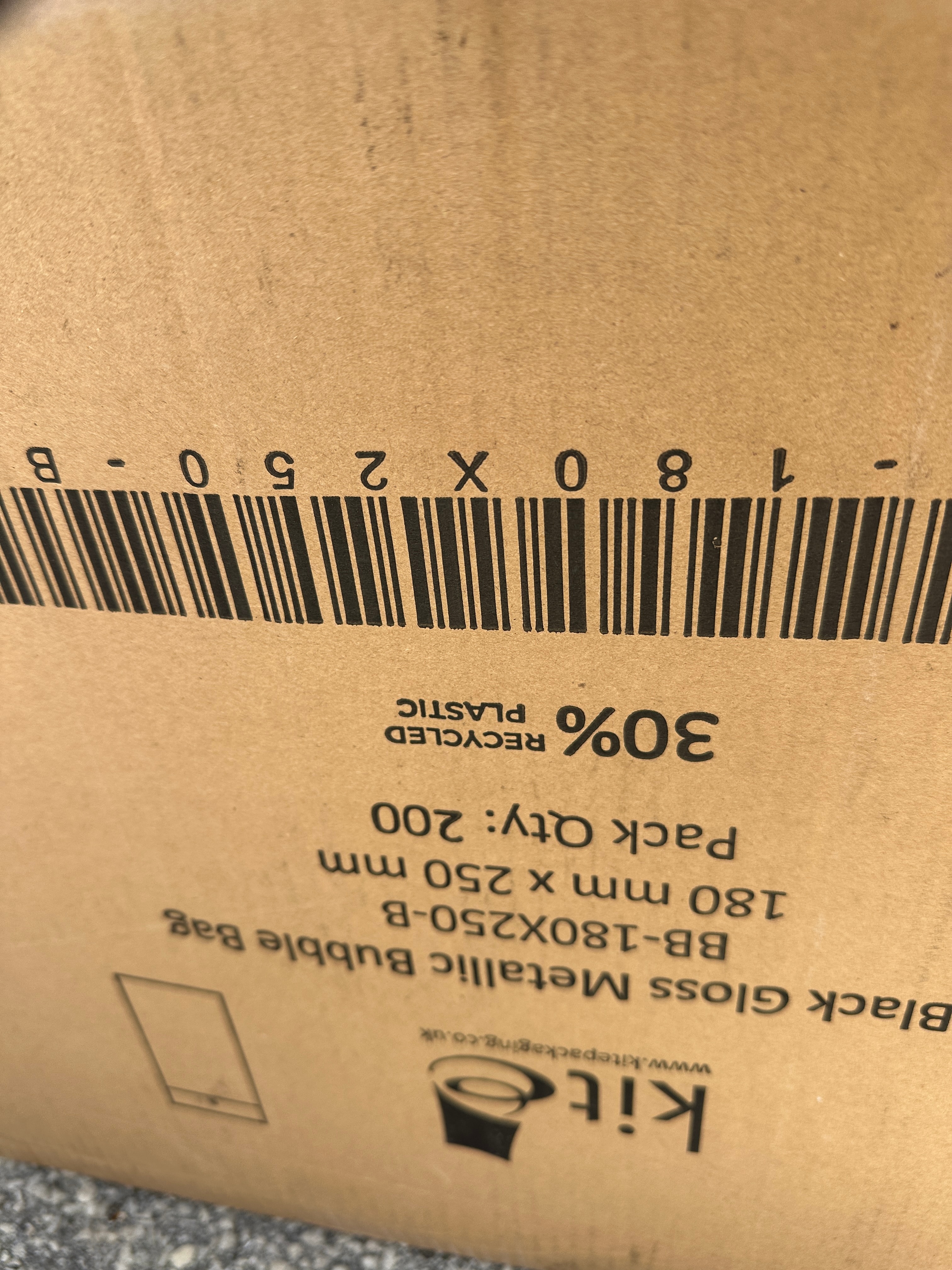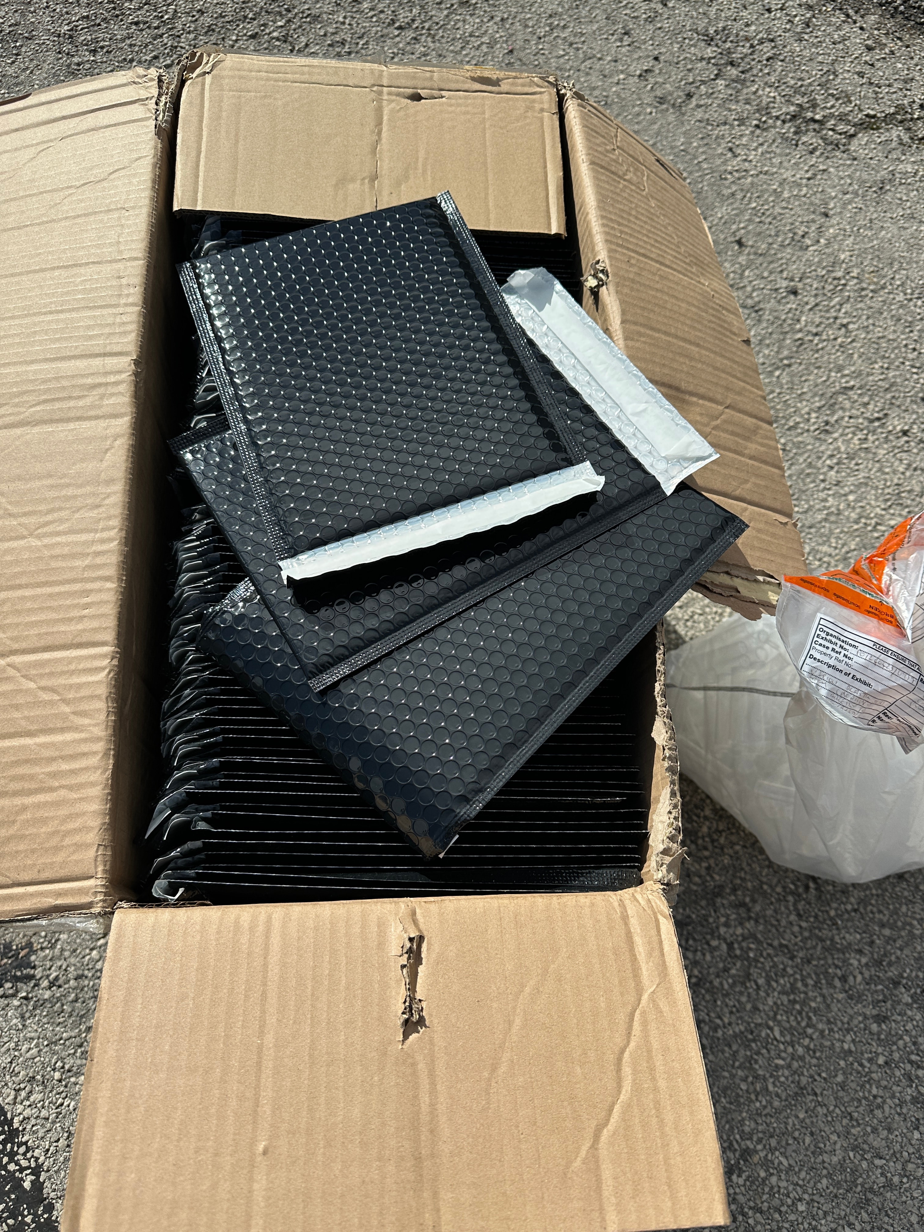 The lot comprises a bulk quantity of new, black gloss metallic bubble mailers, branded "Kit" (model BB-180X250-B), made from 30% recycled plastic. The mailers are contained within an open cardboard box stating a pack quantity of 200. Also included is a substantial bulk quantity of small, clear, cylindrical plastic tubes, each featuring an attached hinged cap. Both the mailers and tubes are consistent with contemporary bulk supply and packaging.