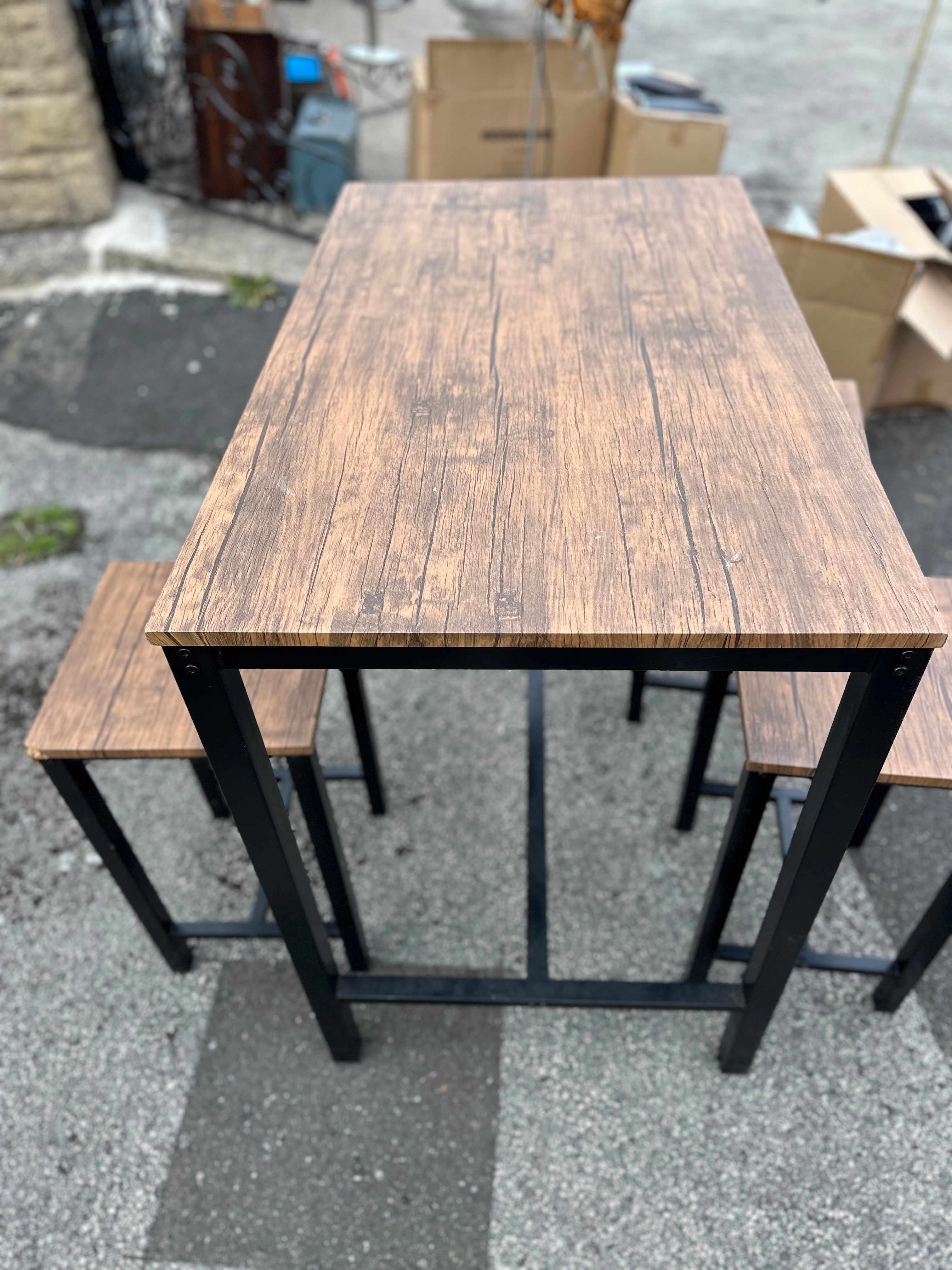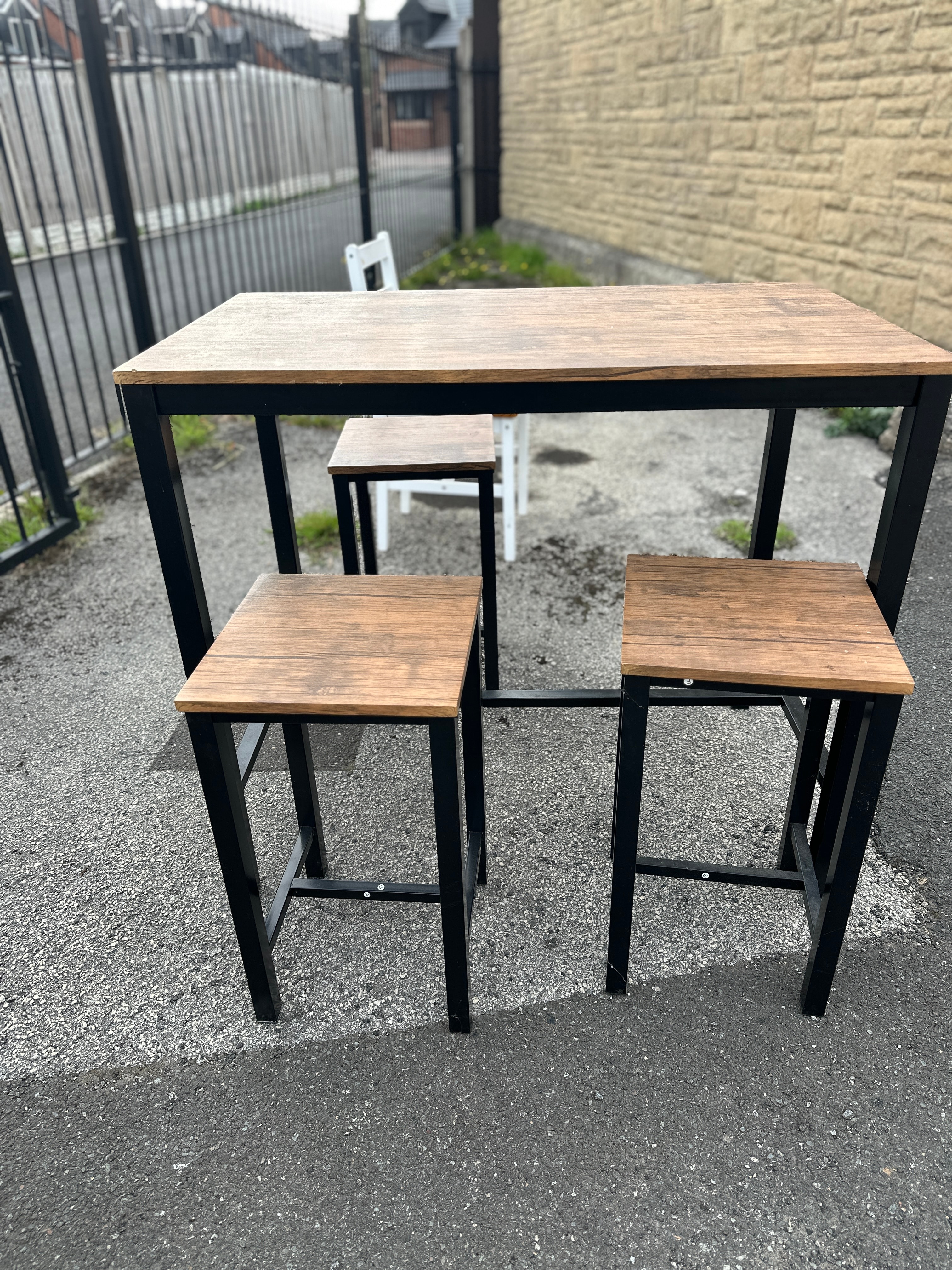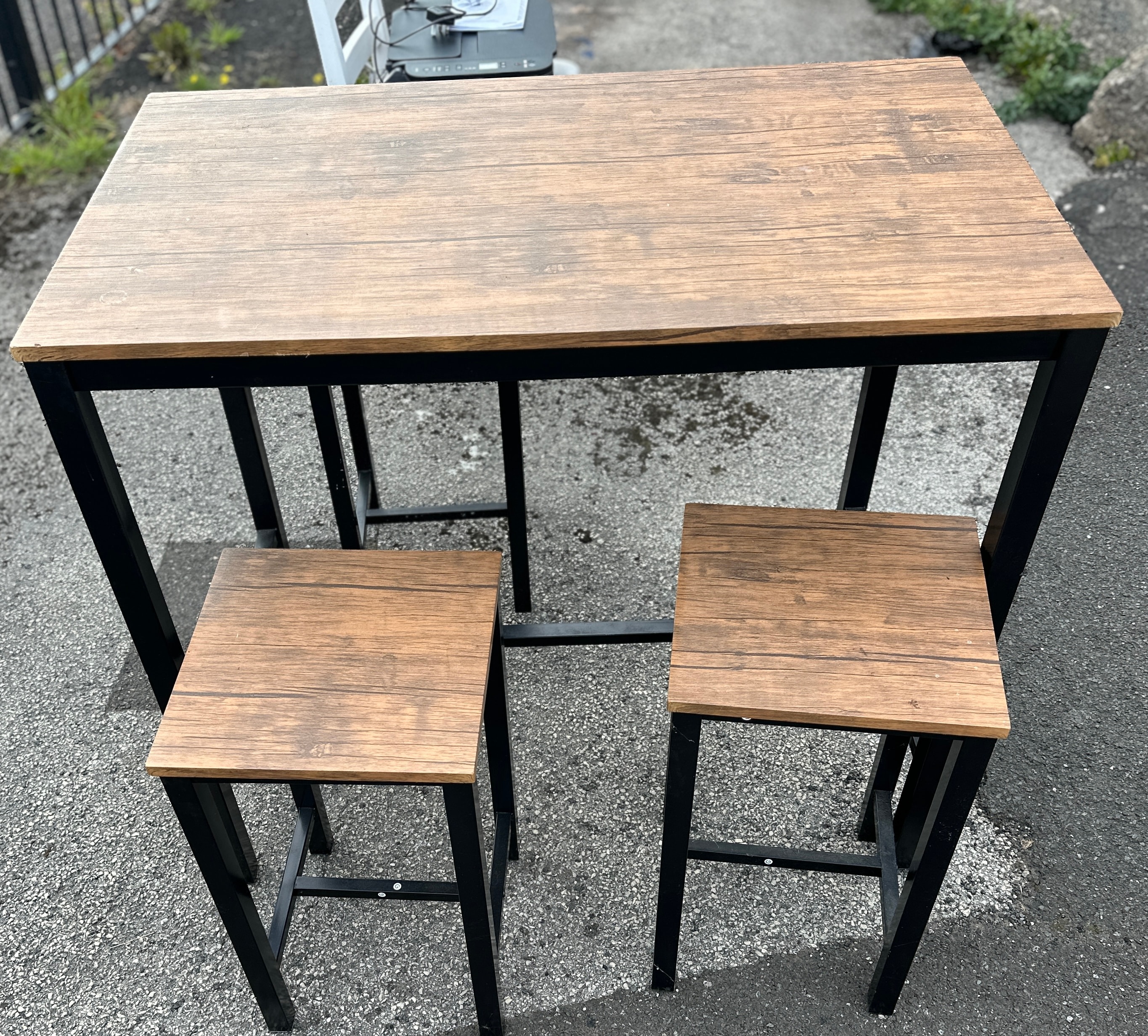 This modern compact dining set comprises a rectangular high-top table and two matching backless stools. The design features a contemporary industrial style, with black square-section metal frames supporting rustic brown wood-effect MDF tops. No visible manufacturer’s markings are apparent.