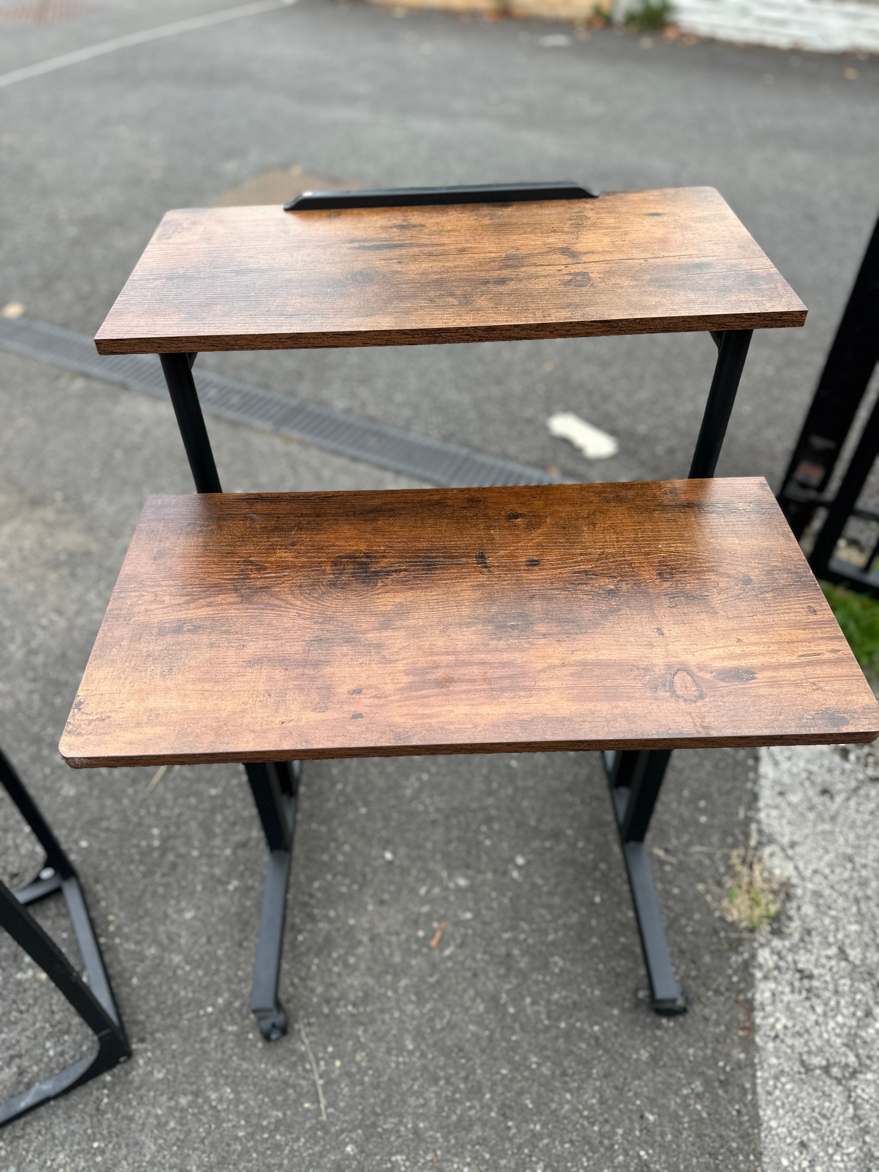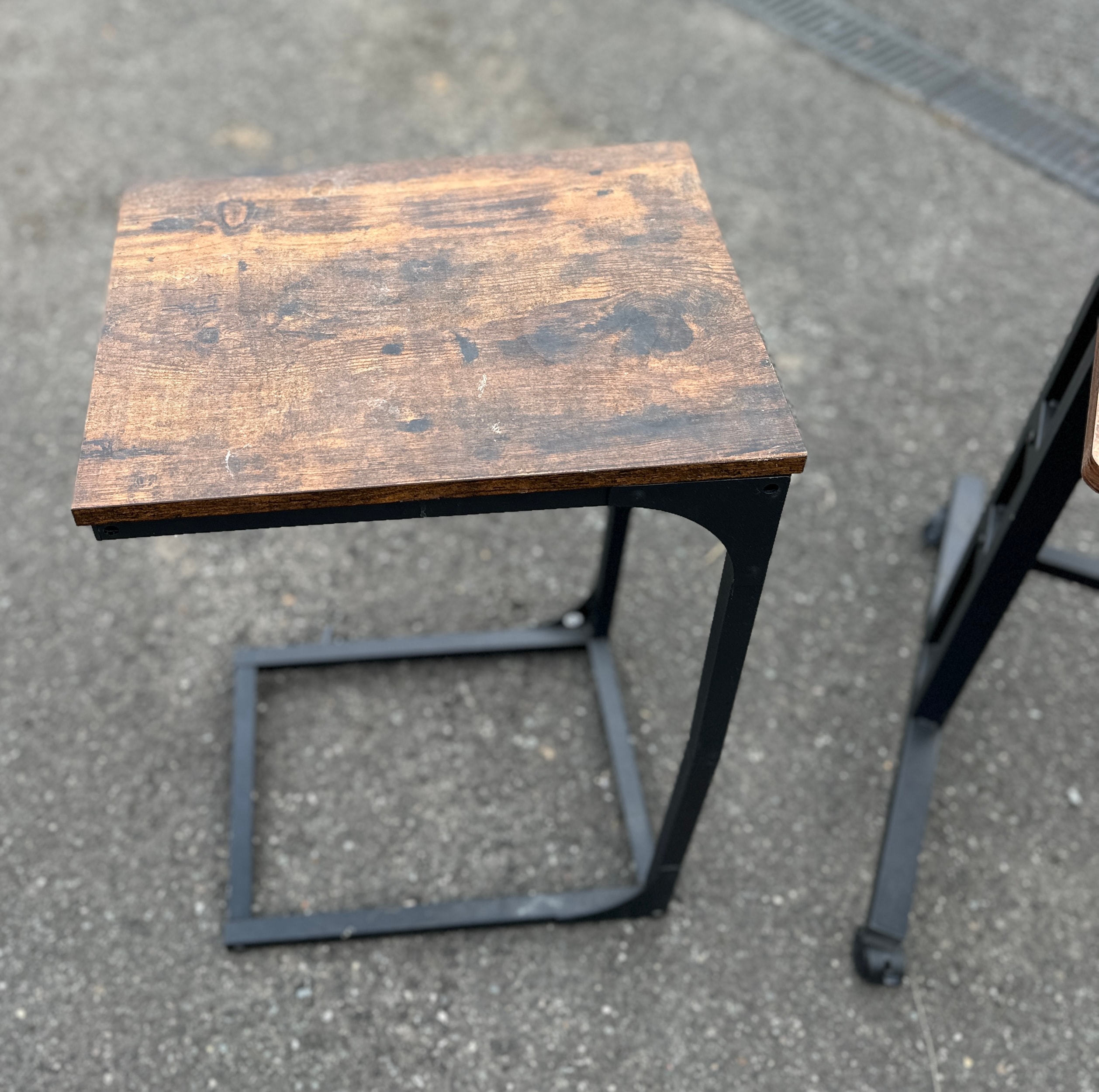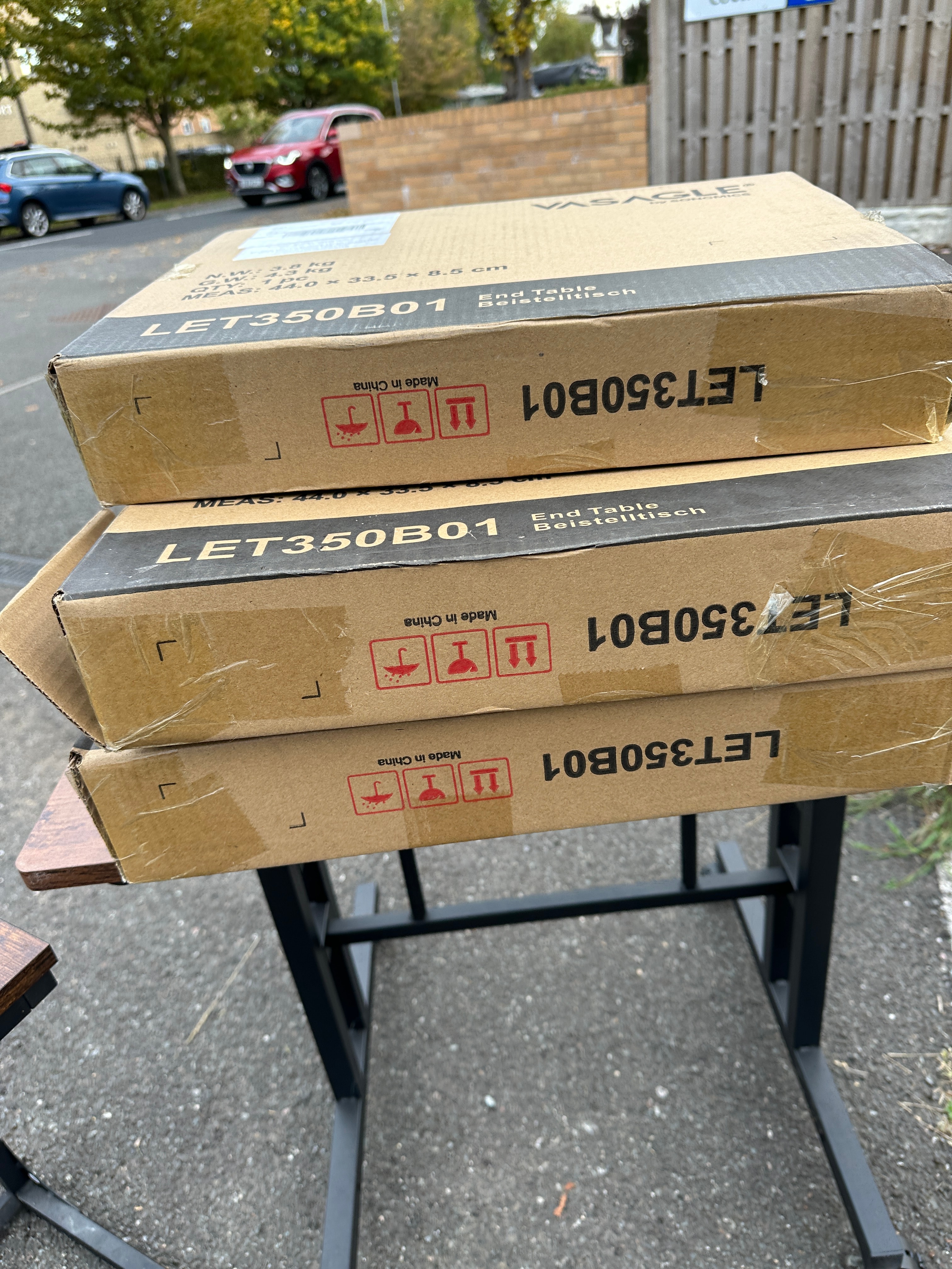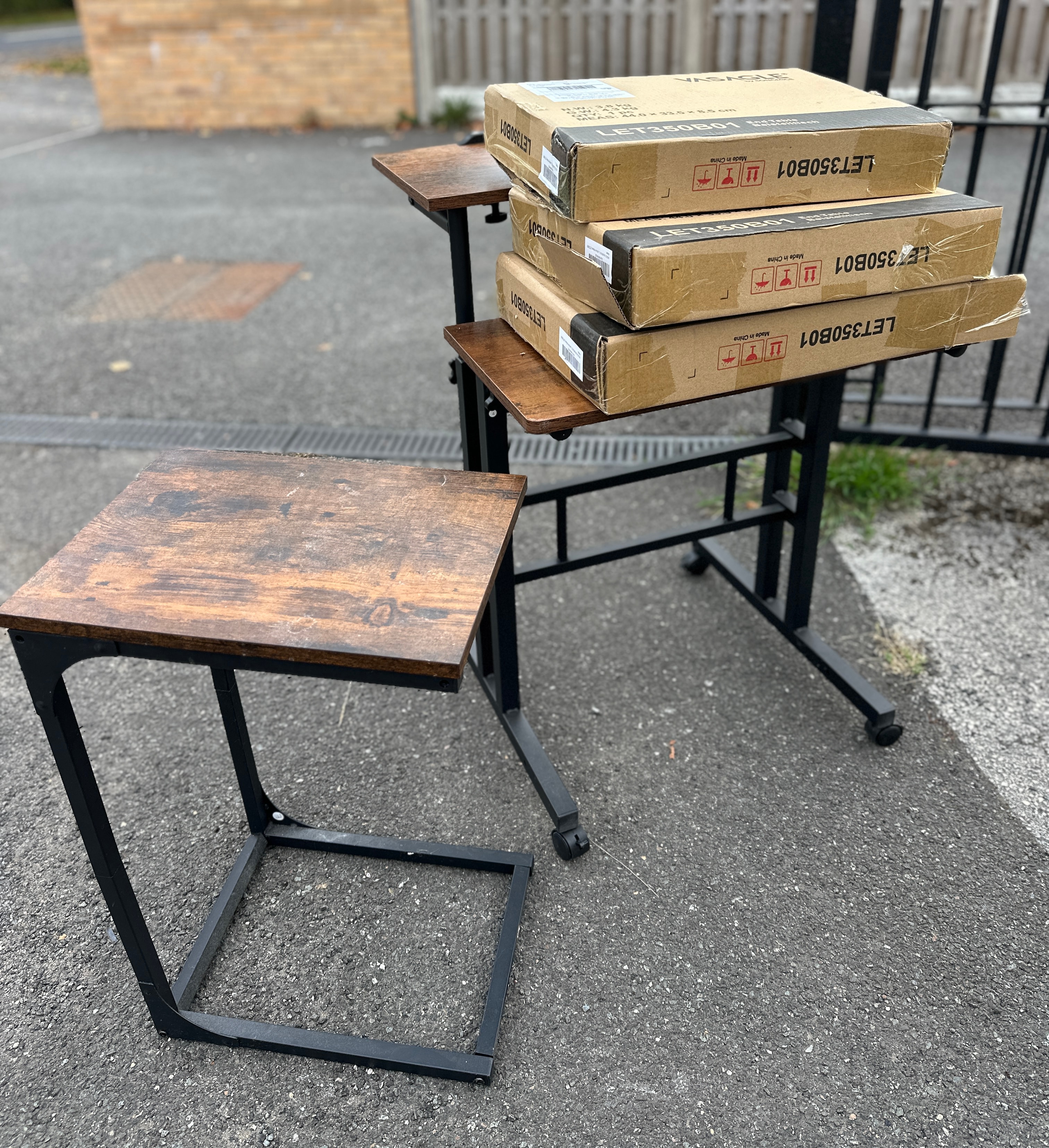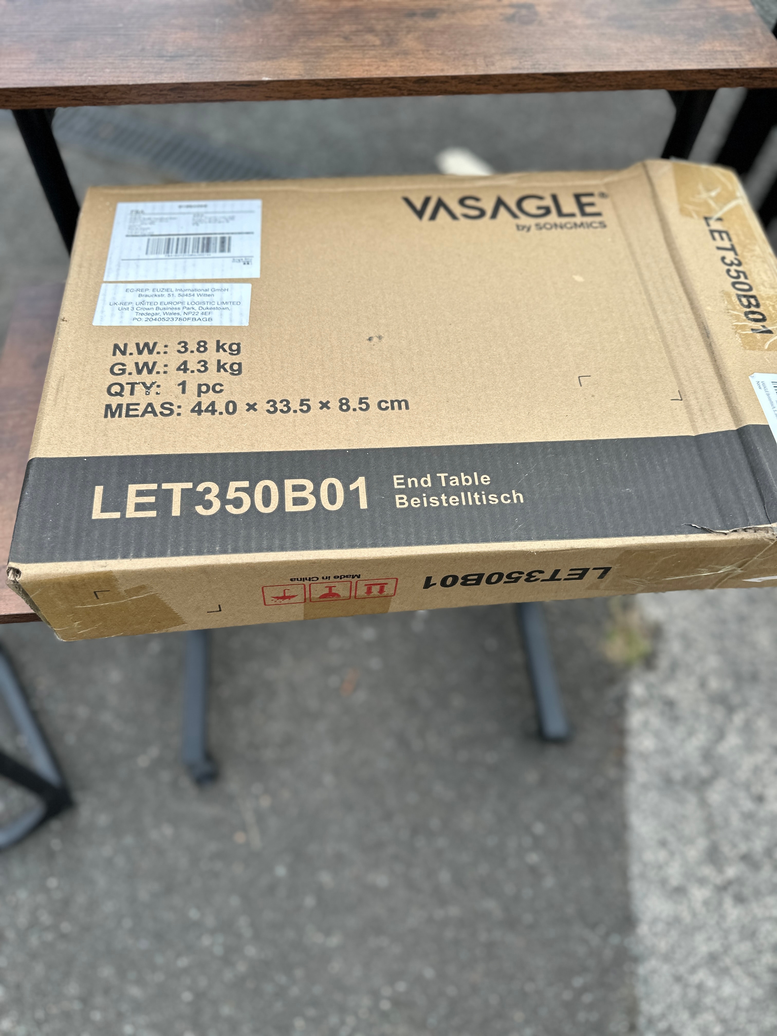 A group of contemporary industrial-style furniture by VASAGLE by SONGMICS. The lot comprises one two-tiered rolling cart, identified through web intelligence as an adjustable standing desk or mobile laptop cart, featuring a dark, distressed wood-grain laminated engineered wood top supported by a black powder-coated metal frame with black plastic casters. Also included is one single-tiered C-table with a dark, distressed wood-grain laminated engineered wood top and a black powder-coated metal frame. Accompanying these are three new-in-box unassembled units, contained in their original manufacturer’s cardboard packaging, clearly marked "VASAGLE by SONGMICS, " with the model number "LET350B01," identifying them as an "End Table" or "Beistelltisch." Box labels also indicate "Made in China."