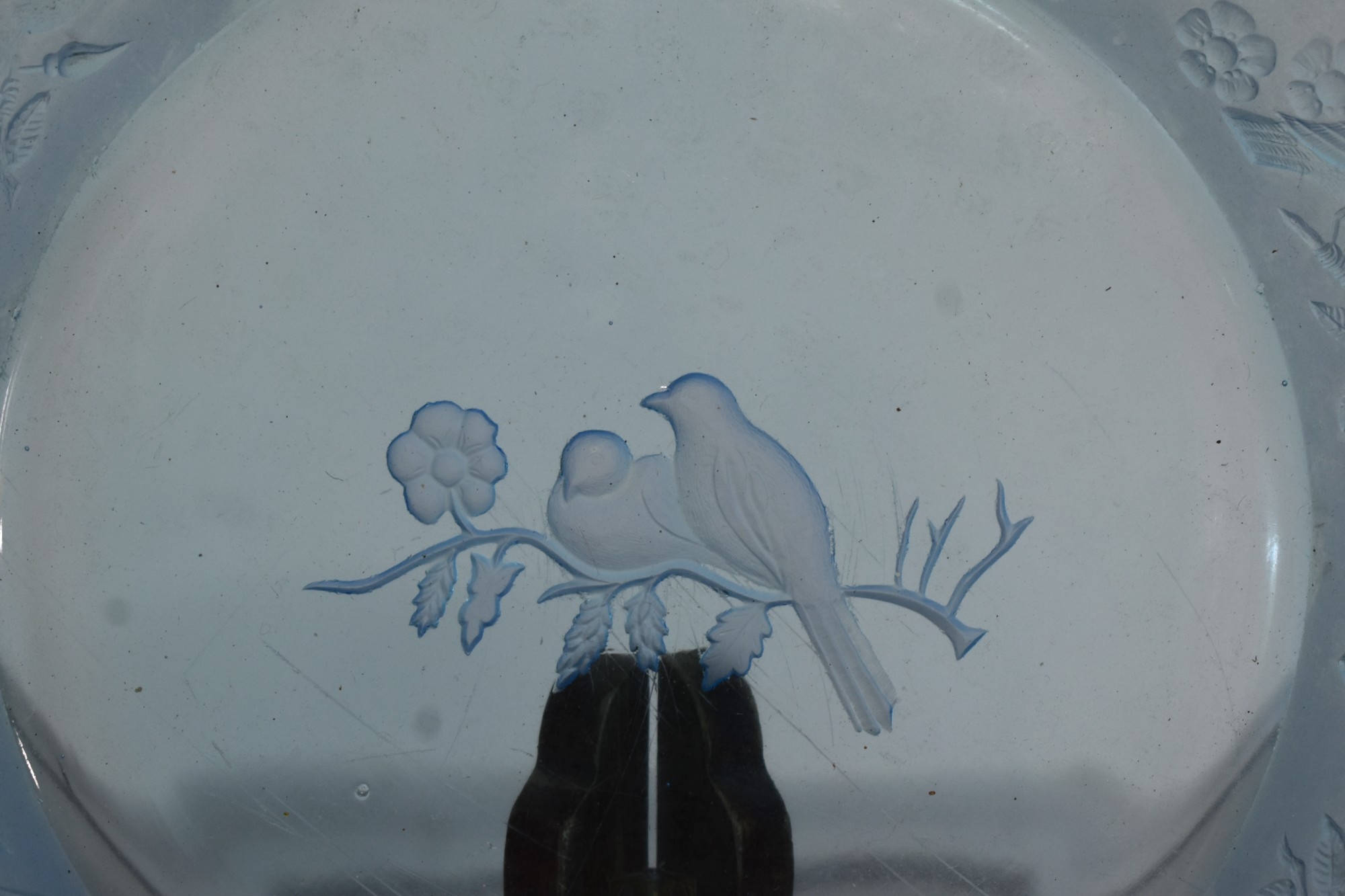 An Early to Mid-20th Century Light Blue Pressed Glass Plate with Bird and Floral Motif