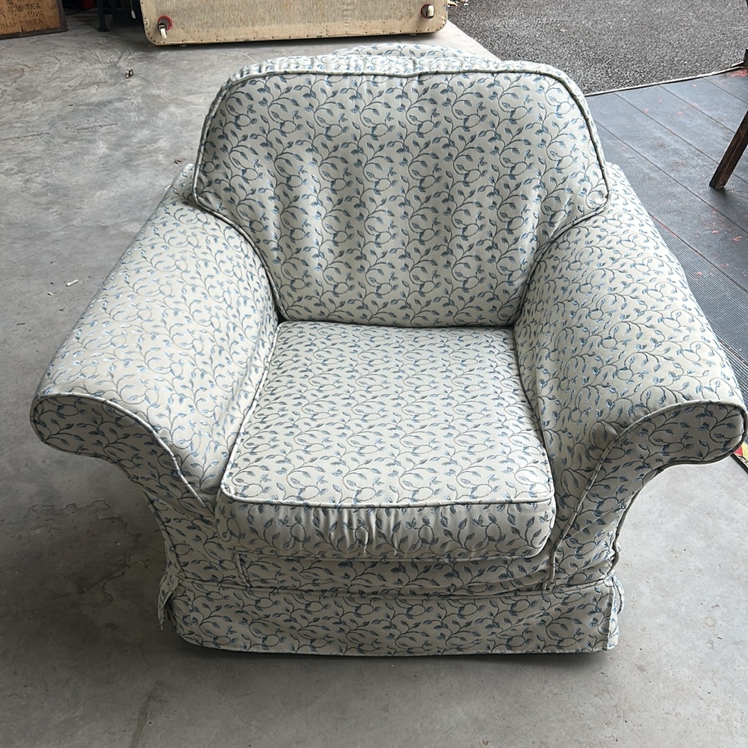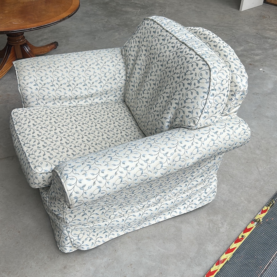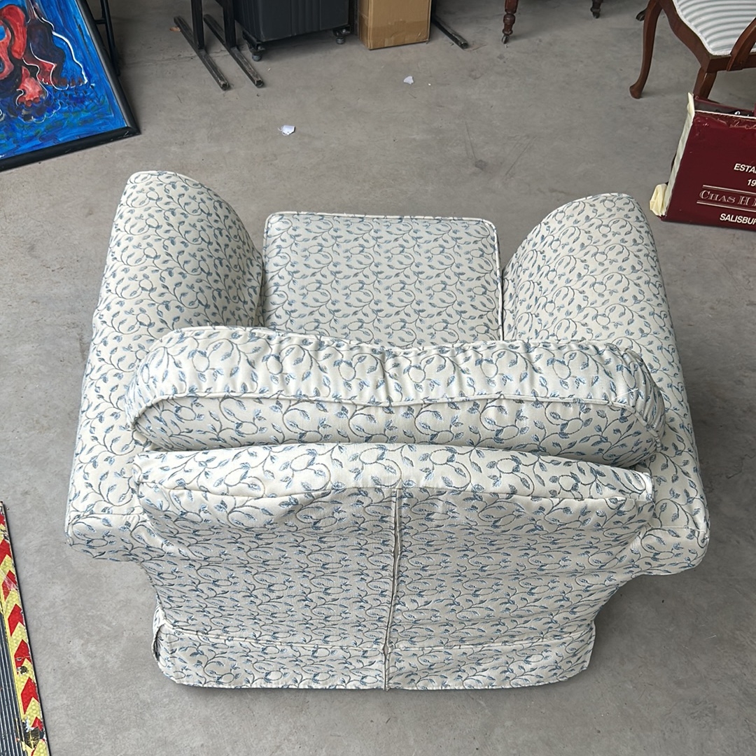 An Upholstered Armchair with Rolled Arms and Skirted Base
