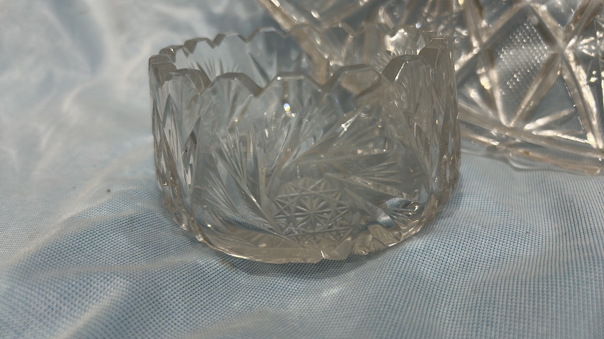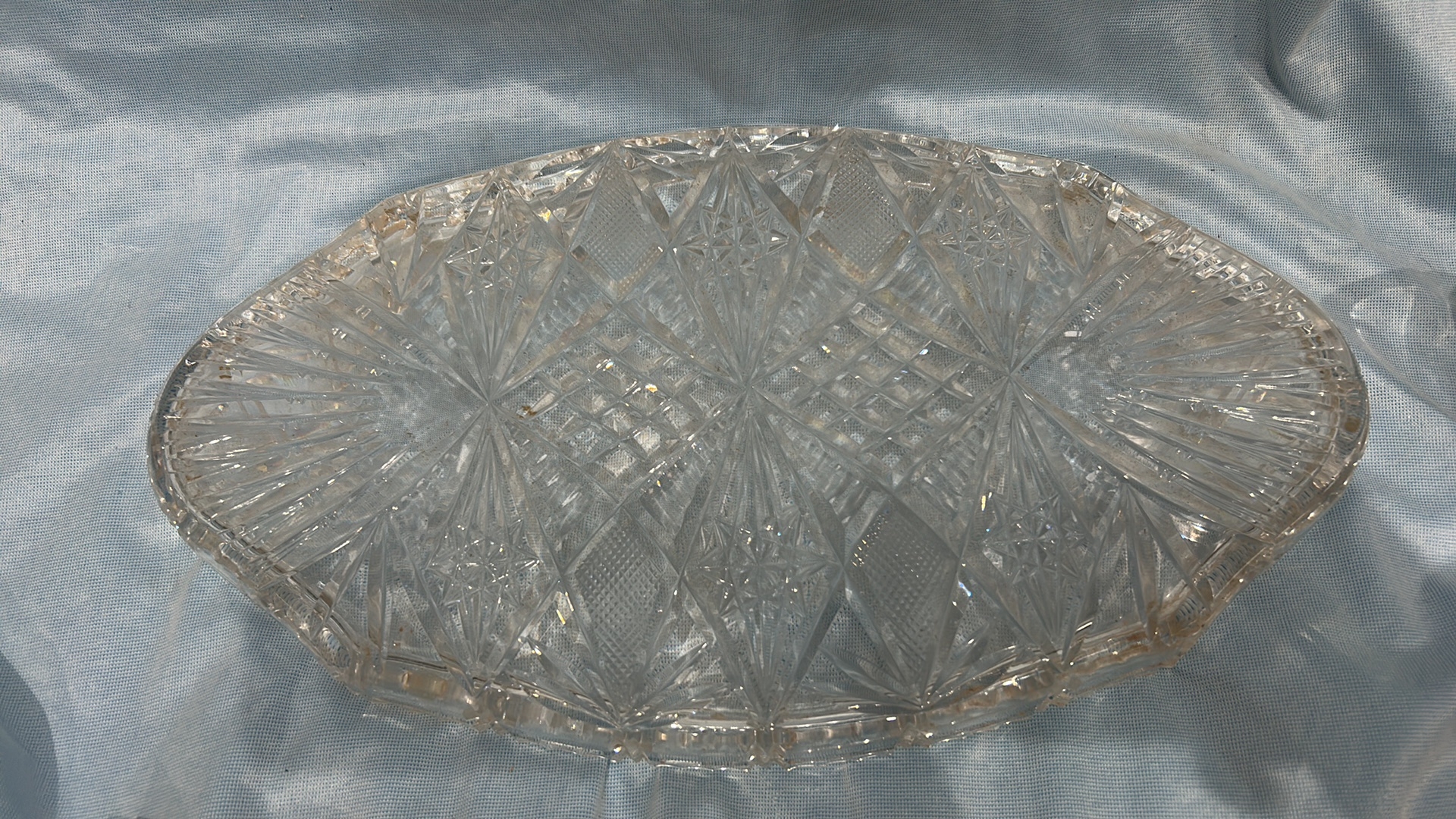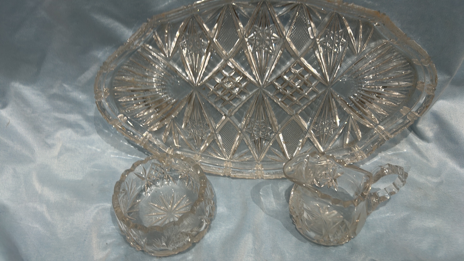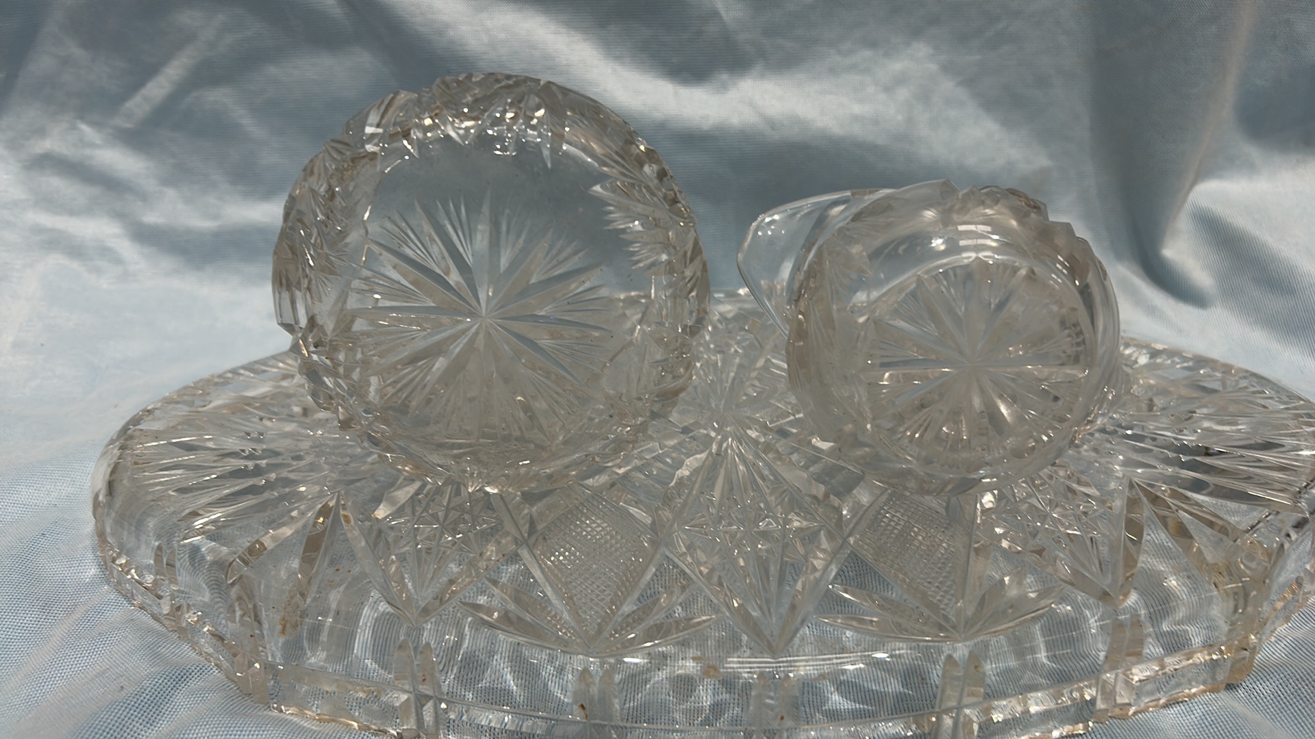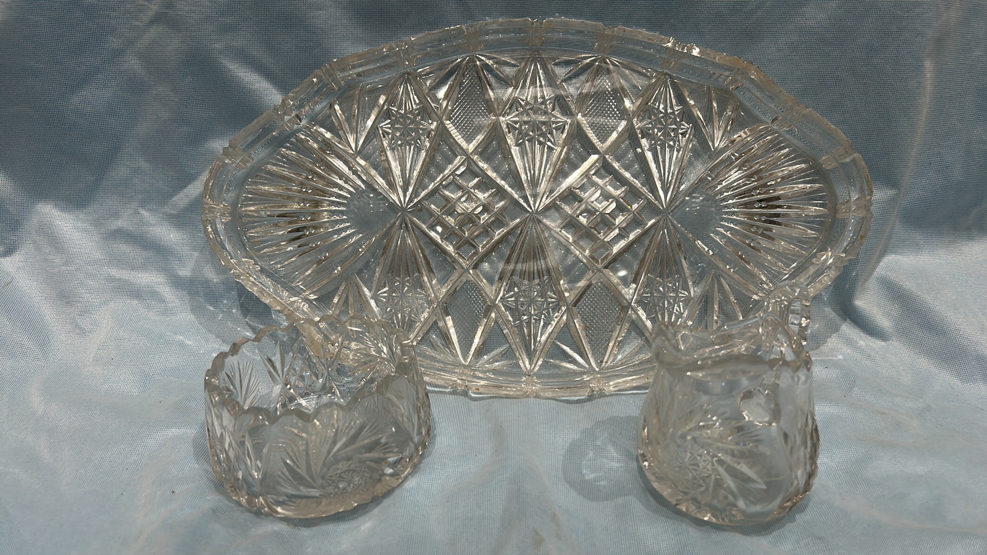 A Trio of American Brilliant Period Cut Glass Serving Tray, Creamer, and Sugar Bowl