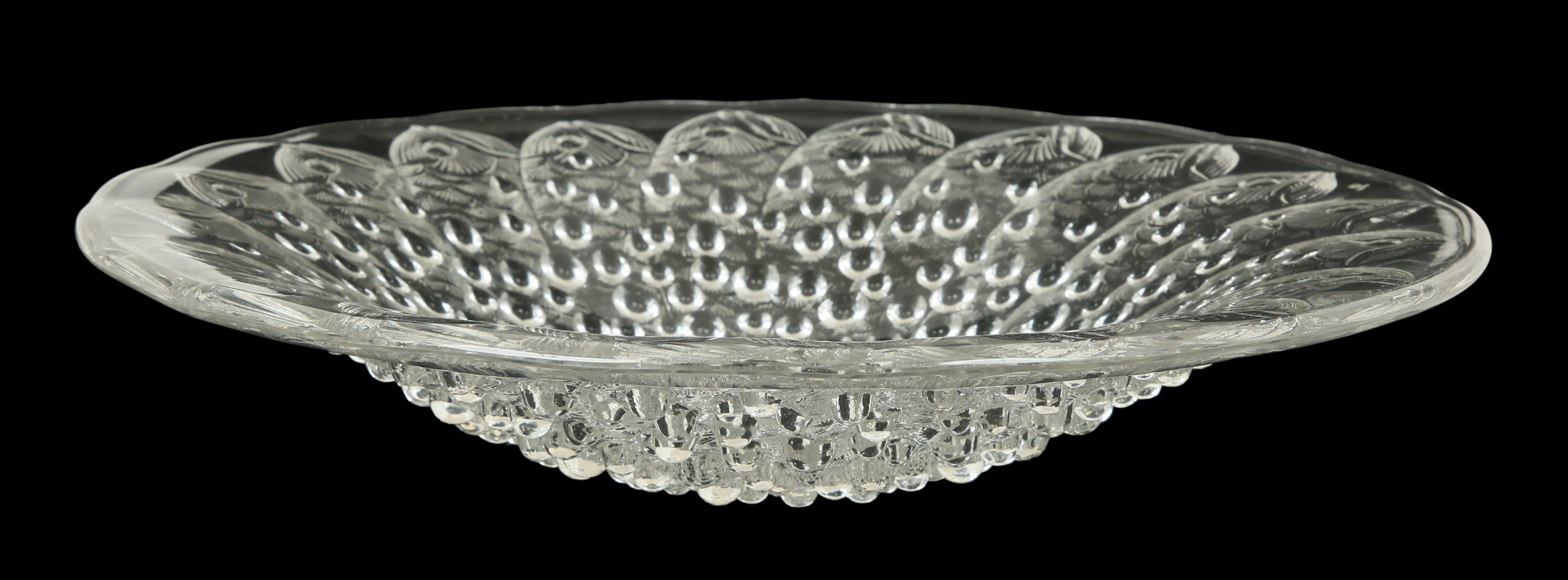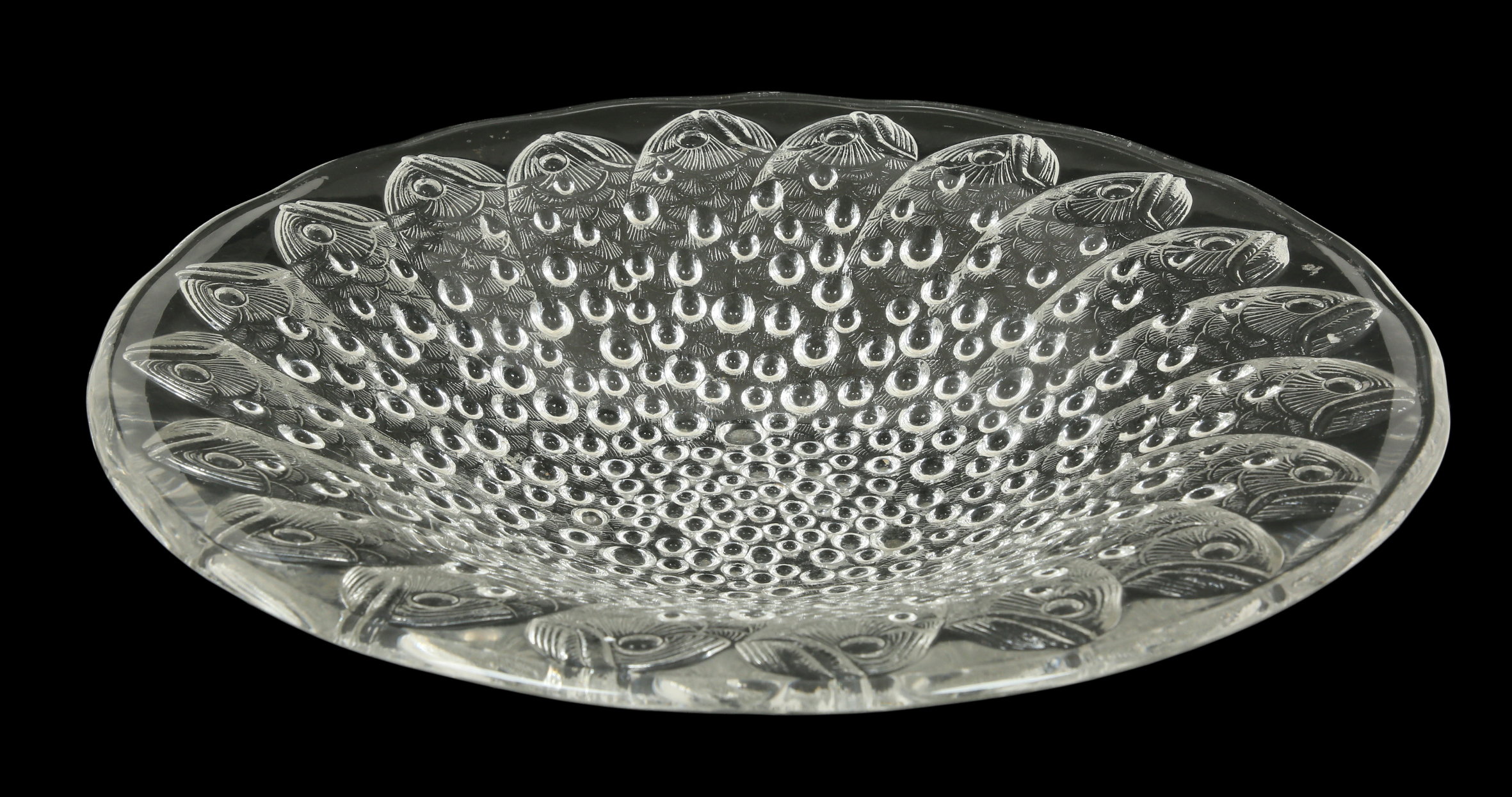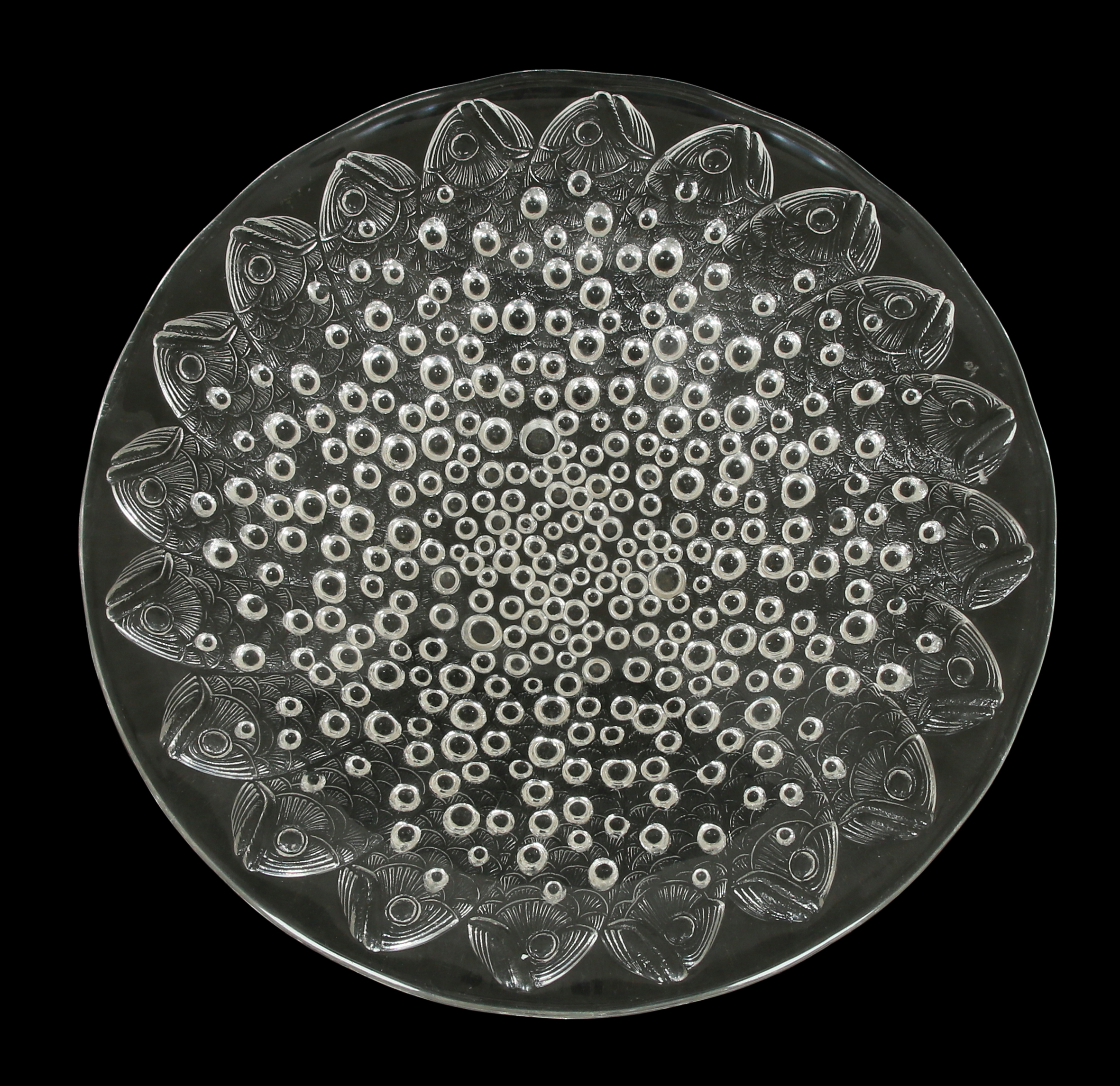 מעוטרת בדגים ובועיות. חתומה. על פי המקור של רנה לליק בשנת 1932 ונמל הדיג המפורסם בברטאן.