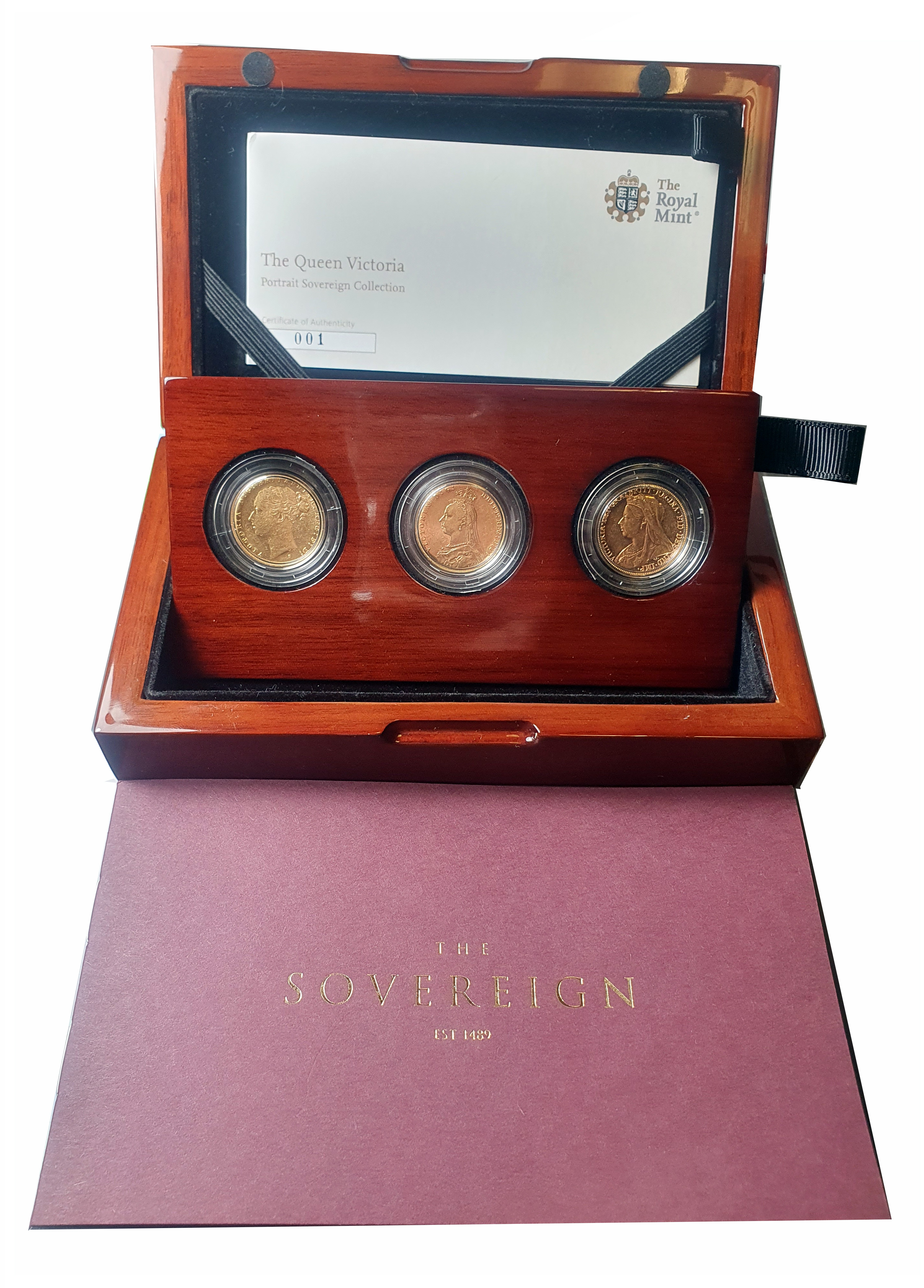 g Royal Mint gold 3-coin Sovereign Set ‘Victoria Portrait Collection’, Victoria (1837-1901), gold Sovereigns, 1887, 1891, 1897-M, portraits of Victoria by William Wyon, Sir Joseph Edgar Boehm, Thomas Brock, rev. St. George and dragon right, date in exergue, B.P. to upper right of exergue for designer Benedetto Pistrucci, edges milled, 7.98g each (S.3855B, S.3866C, S.3875). All three Sovereigns about Very Fine, accompanied by Royal Mint box of issue, Certificate of Authenticity.
