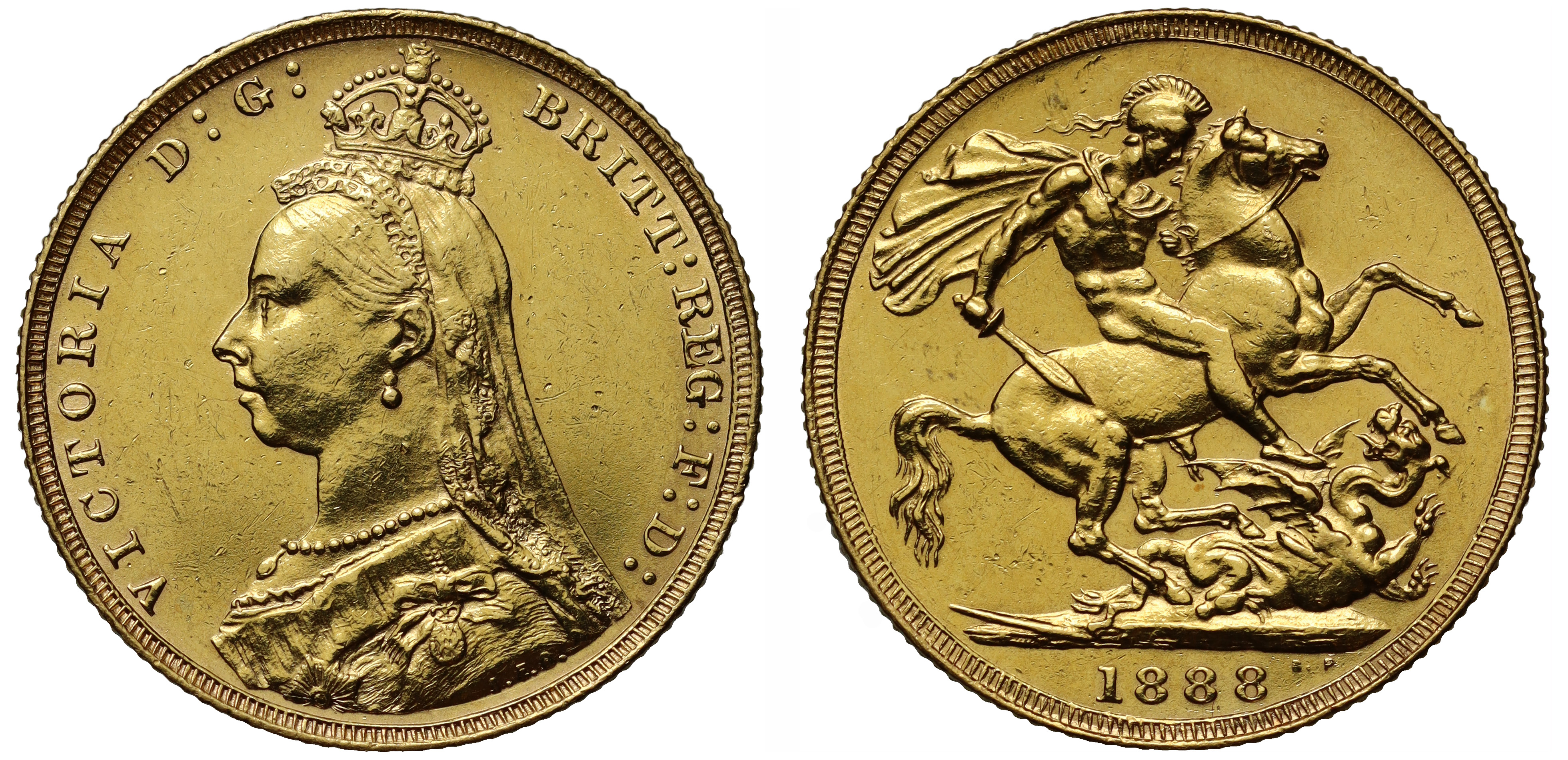 g Victoria (1837-1901), gold Sovereign, 1888, Golden Jubilee style bust facing left, small crown and veil on head, pearl earring and 13 pearl necklace, J.E.B. initials raised on truncation with right angled J, initials of engraver J Edgar Boehm, second abbreviated Latin legend, G: closer to crown, toothed border surrounding, VICTORIA D:G: BRITT: REG: F:D: rev. struck en medaille, St. George and dragon right, horse with short tail, broken lance to left on ground-line, tiny WWP under lance, initials of William Wellesley Pole, Master of mint when design introduced, date in exergue, initials B.P to upper right, for engraver Benedetto Pistrucci, 7.98g (DISH L9; Marsh 126A; Bull EGC 1326; S.3866B). Brightly cleaned with surface marks, very fine.