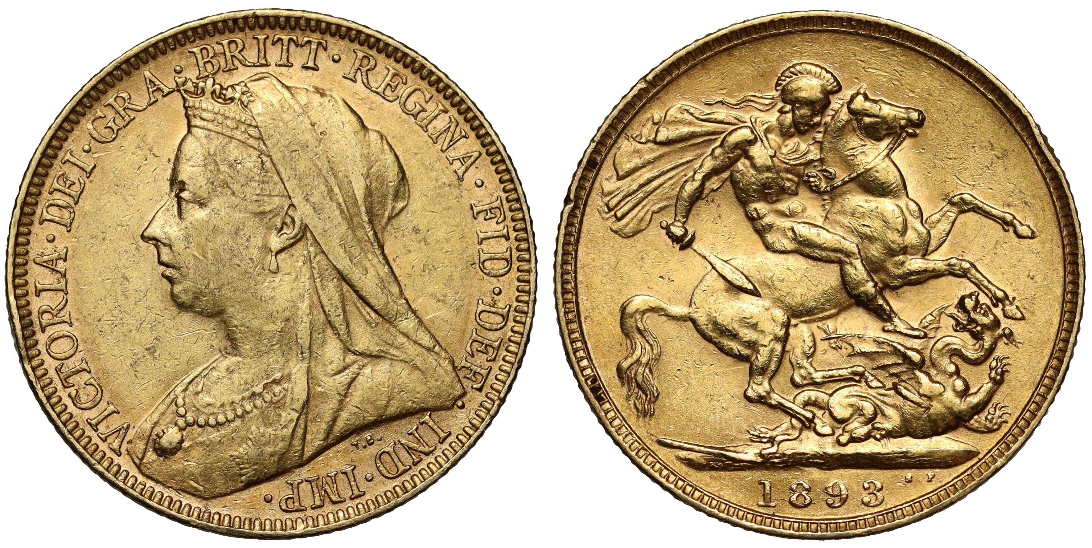 g Victoria (1837-1901), gold Sovereign, 1893, older crowned and veiled bust left, T.B. below for engraver Thomas Brock, Latin legend and toothed border surrounding, VICTORIA. DEI. GRA. BRITT. REGINA. FID. DEF. IND. IMP., rev. St. George and dragon right, broken lance to left on ground-line, tiny WWP under lance, initials of William Wellesley Pole, Master of the Mint, date in exergue, initials B.P to upper right for designer Benedetto Pistrucci, 8.00g (Bentley 337; Hill 145; Bull EGC 1380; MCE 553; S.3874). Toned, with handling marks, some wear and hairline scratches, reverse with rim bruise, good fine.