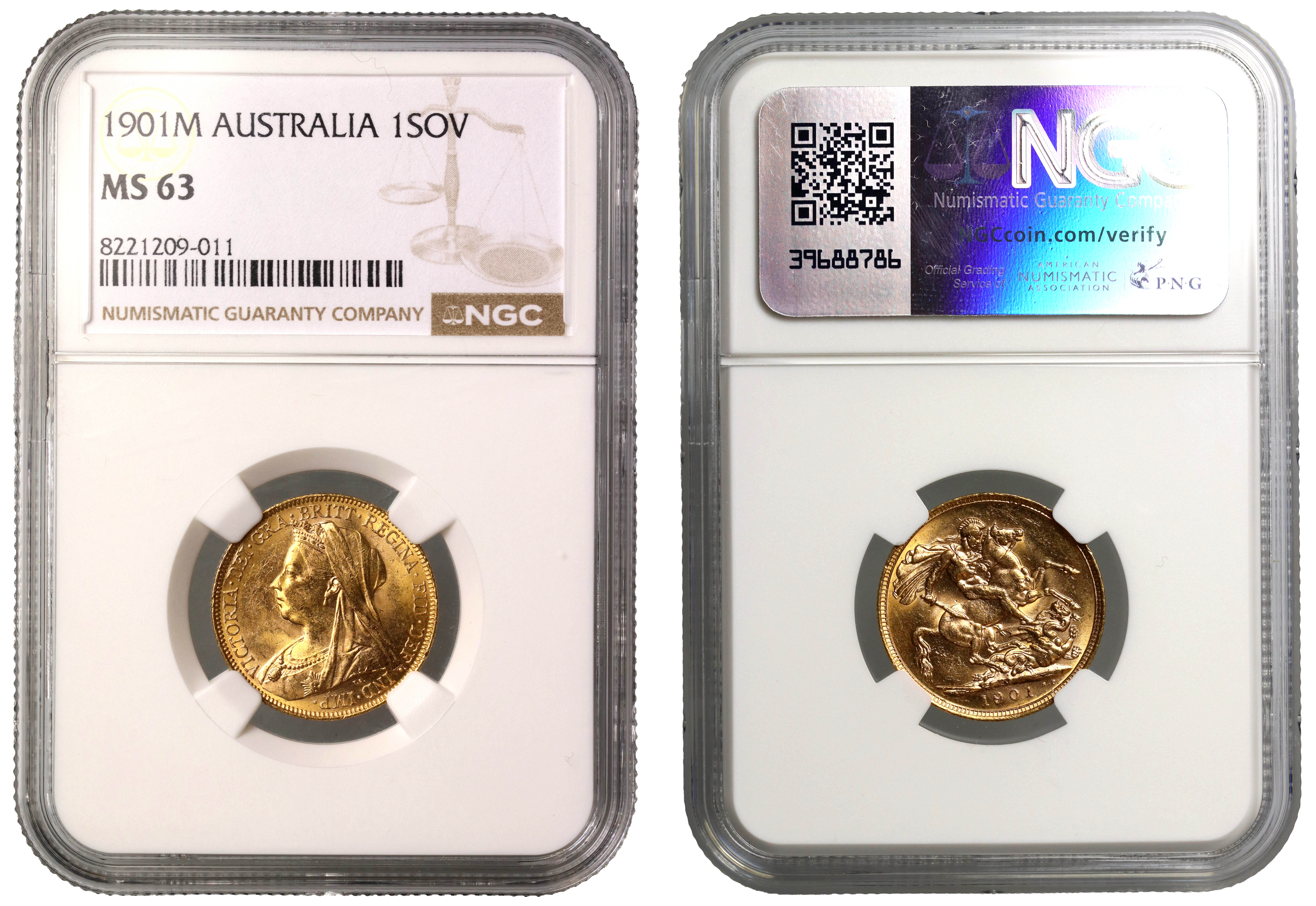 g Victoria (1837-1901), gold Sovereign, 1901-M, Melbourne Mint, Australia, older crowned and veiled bust left, T.B. below for designer Thomas Brock, Latin legend and toothed border surrounding, VICTORIA. DEI. GRA. BRITT. REGINA. FID. DEF. IND. IMP., rev. struck en medaille, St George and dragon right, horse with longer tail, broken lance to left on ground-line, tiny WWP under lance, initials of William Wellesley Pole, Master of Mint when design introduced, M mint mark at centre of ground-line, date in exergue, initials B.P to upper right, for engraver Benedetto Pistrucci, edge milled (Marsh 161; S.3875). Slabbed and graded by NGC as MS63.