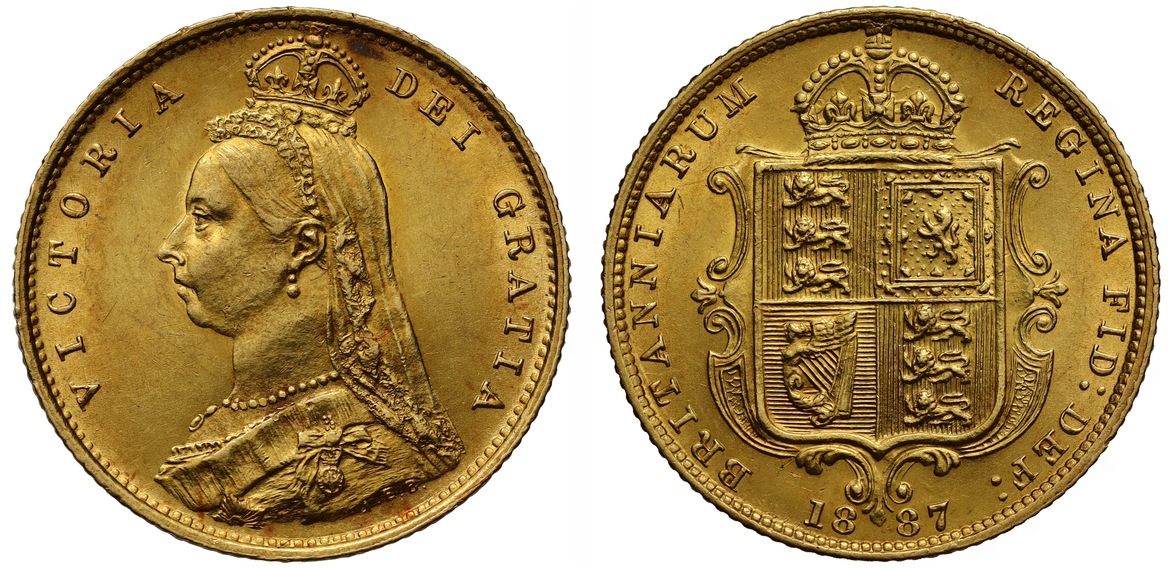 g Victoria (1837-1901), gold Half-Sovereign, 1887, Golden Jubilee style bust facing left, designed by J Edgar Boehm, small crown and veil on head, pearl earring with pearl necklace, angled imperfect J type J.E.B. truncation variety, Latin legend and toothed border surrounding, VICTORIA DEI GRATIA, rev. struck en medaille, crowned quartered high shield of arms, date below either side of bottom of frame, legend commences lower left with toothed border surrounding, BRITANNIARUM REGINA FID: DEF: edge milled, 3.99g (DISH L508; Bull EGC 1359; Hill 478F; S.3869). Toned spot over head, other light surface marks, extremely fine.