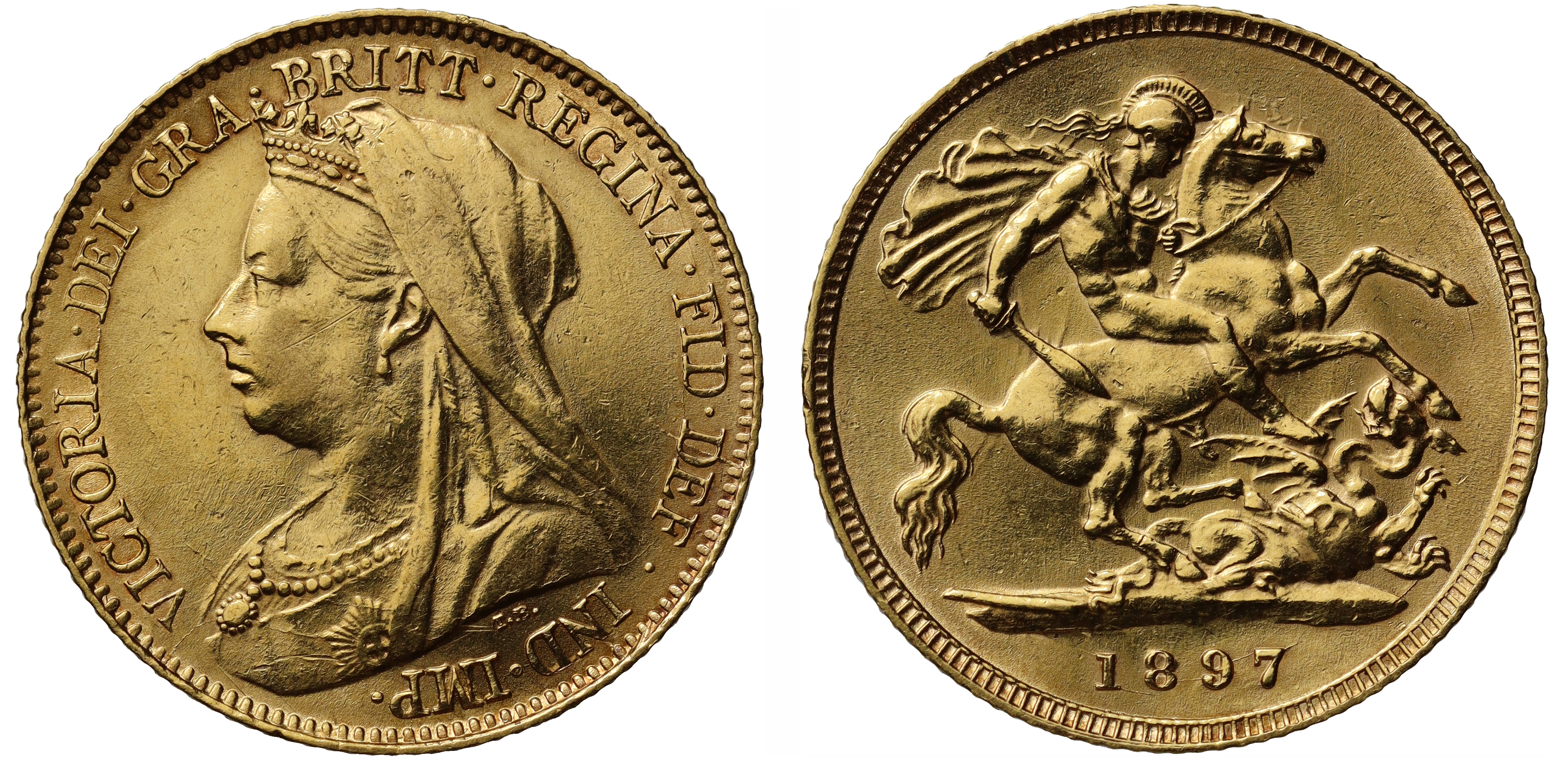 g Victoria (1837-1901), gold Half-Sovereign,1897, crowned, veiled bust left, T.B. initials below truncation for engraver Thomas Brock, Latin legend and toothed border surrounding,VICTORIA· DEI· GRA· BRITT· REGINA· FID· DEF· IND· IMP·, rev. St George and dragon right, date in exergue, 4.00g (Hill 492; Bull EGC 1394; S.3878). Polished with some residual colour, otherwise good very fine.