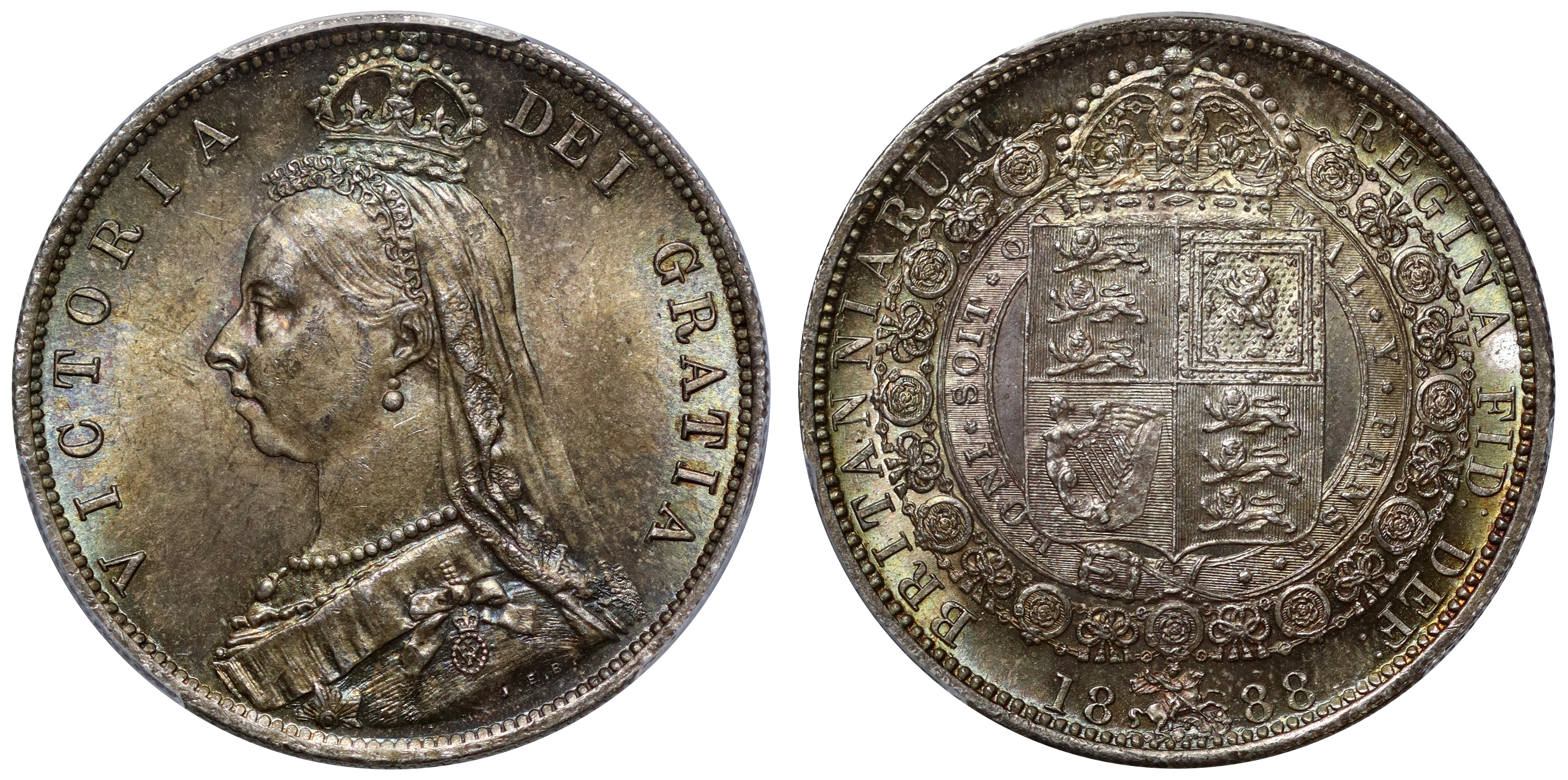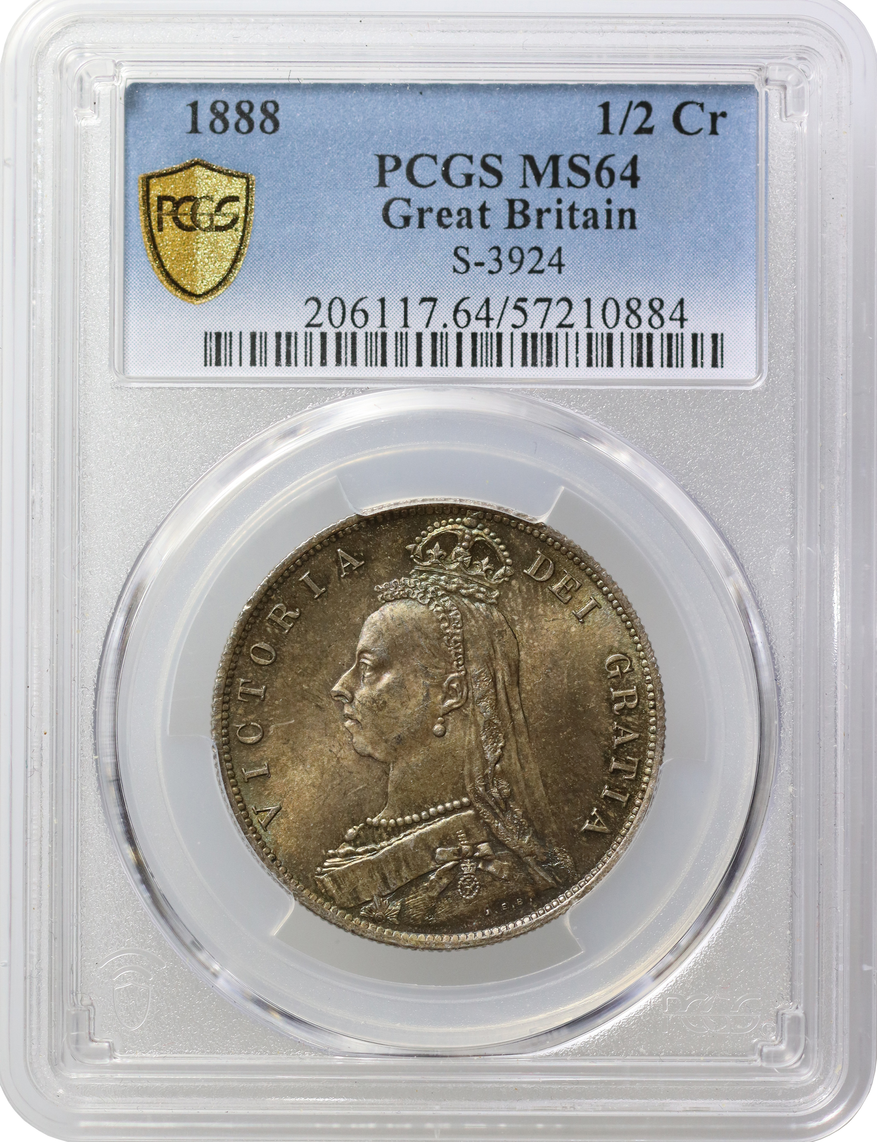 Victoria (1837-1901), silver Halfcrown, 1888, crowned and veiled Jubilee type bust left, J.E.B. on truncation, Latin legend and toothed border surrounding both sides, VICTORIA DEI GRATIA, rev. crowned quartered shield of arms in garter and collar, motto HONI. SOIT. QUI MAL. Y. PENSE., date either side of St George and dragon at bottom, BRITANNIARUM REGINA FID: DEF: (S.3924). Slabbed and graded by PCGS as MS64.