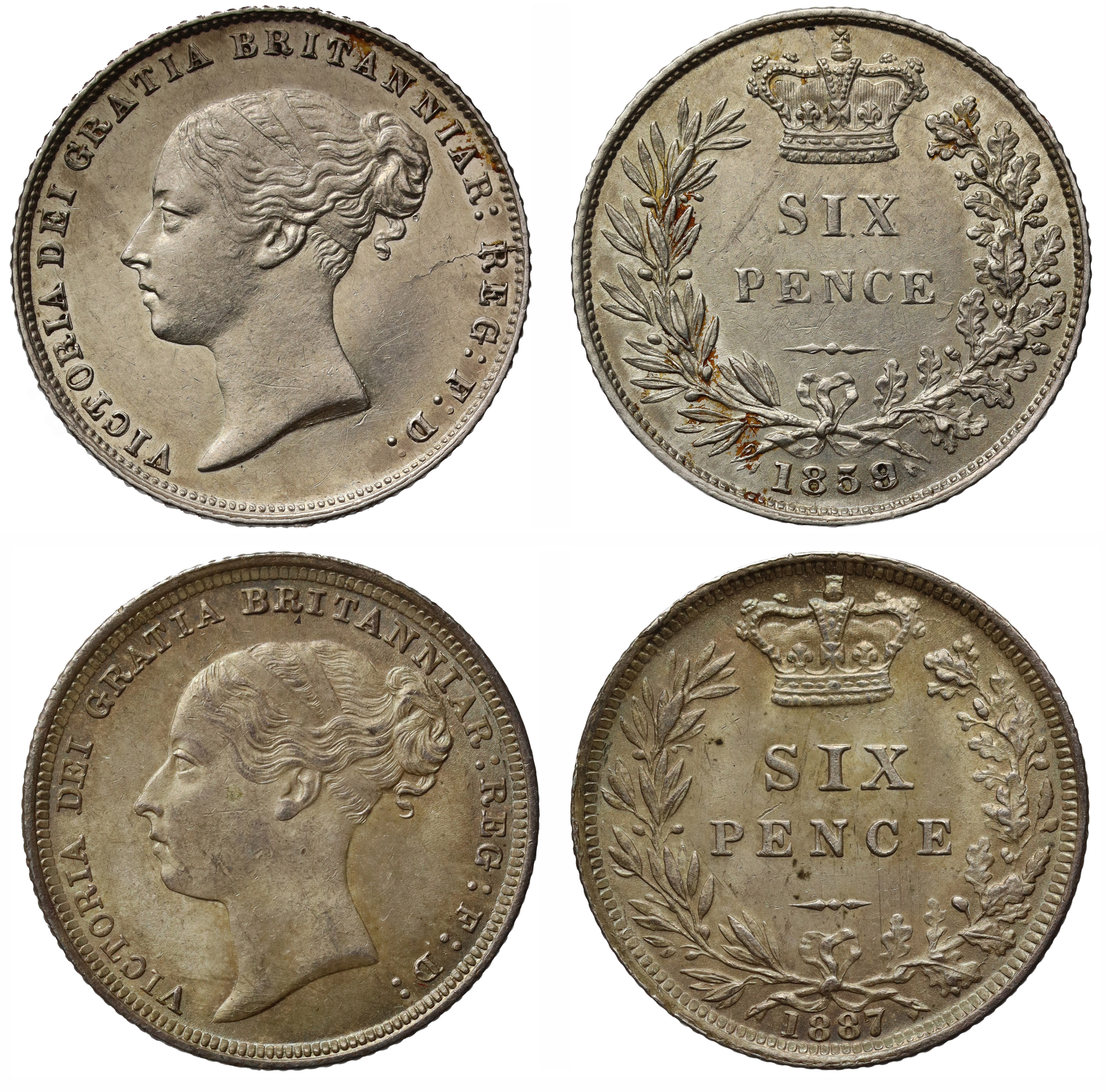Victoria (1837-1901), silver Sixpence, 1859, the 9 of date struck over 8, first young head left, legend VICTORIA DEI GRATIA BRITANNIAR: REG: F: D:, toothed border around rim both sides, rev. inverted die axis, SIX / PENCE in two lines at centre of crowned laurel and oak wreath, date below, edge milled, 2.81g (Bull 3204; Davies 1060; ESC 1708A; S.3908). Some light deposit in some letters and devices, lightly toned with underlying proof-like fields, some light surface marks, otherwise extremely fine and rare. Victoria (1837-1901), silver Sixpence, 1887, third young head left, legend VICTORIA DEI GRATIA BRITANNIAR: REG: F: D: toothed border around rim both sides, rev. inverted die axis, SIX / PENCE in two lines at centre of crowned laurel and oak wreath, date below, edge milled, 2.83g (Bull 3262; Davies 1106; ESC 1750; S.3912). Toned, a few tiny spots, otherwise a pleasing extremely fine.