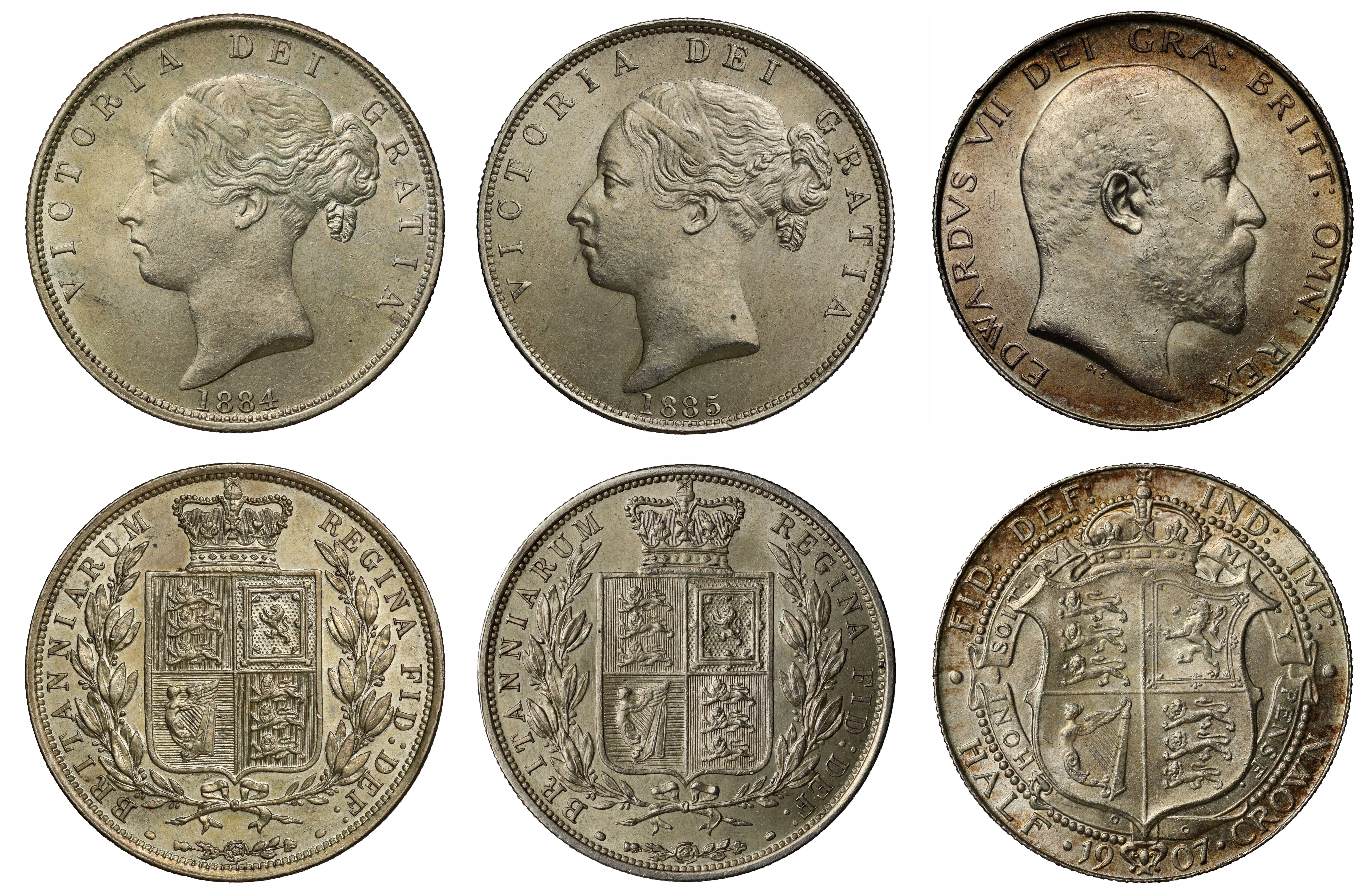 Victoria (1837-1901), silver Halfcrowns (2), 1884, no serif, 1885, young head left, legend VICTORIA DEI GRATIA. rev. crowned quartered shield of arms, within laurel and oak wreath, legend surrounding BRITANNIARUM REGINA: FID: DEF:, 14.20g and 14.13g respectively (Bull 2764, 2765; ESC 712, 713; Davies 594, 595; S.3889). Generally toned about extremely fine or better; Edward VII (1901-10), silver Halfcrown, 1907, bare head right, DES below truncation for engraver George William De Saulles, Latin legend and toothed border surrounding, EDWARDVS VII DEI: GRA: BRITT: OMN: REX, rev. crowned quartered shield of arms, garter motto in French surrounding, HONI. SOIT. QUI. MAL. Y. PENSE., beaded border surrounding, Latin abbreviated legend in upper half, FID: DEF: IND: IMP:, denomination and date in lower half, 14.07g (Bull 3573; ESC 752; Davies 1515; S.3980). Toned extremely fine. (3)
