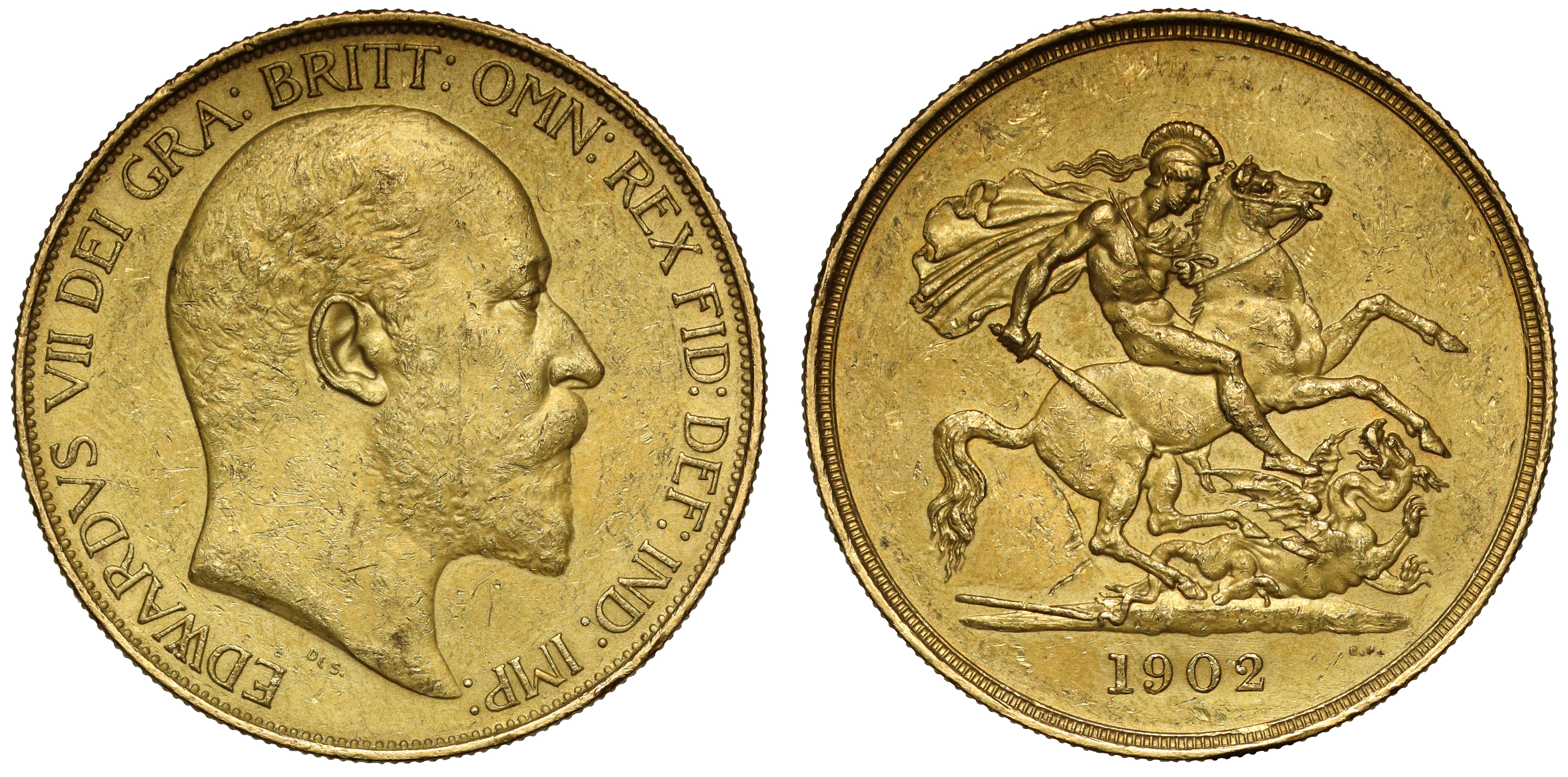 g Edward VII (1901-10), impaired matt proof gold Five Pounds, 1902, Coronation year, bare head right, De S. below truncation for engraver George W De Saulles, Latin legend and toothed border surrounding, EDWARDVS VII DEI GRA: BRITT: OMN: REX FID: DEF: IND: IMP:, rev. St George slaying the dragon with sword, broken lance to lower left, tiny B.P. in exergue for engraver Benedetto Pistrucci, edge milled, 39.92g (Hill T41; S.3966). Heavily scuffed and surface marked both sides, otherwise very fine.