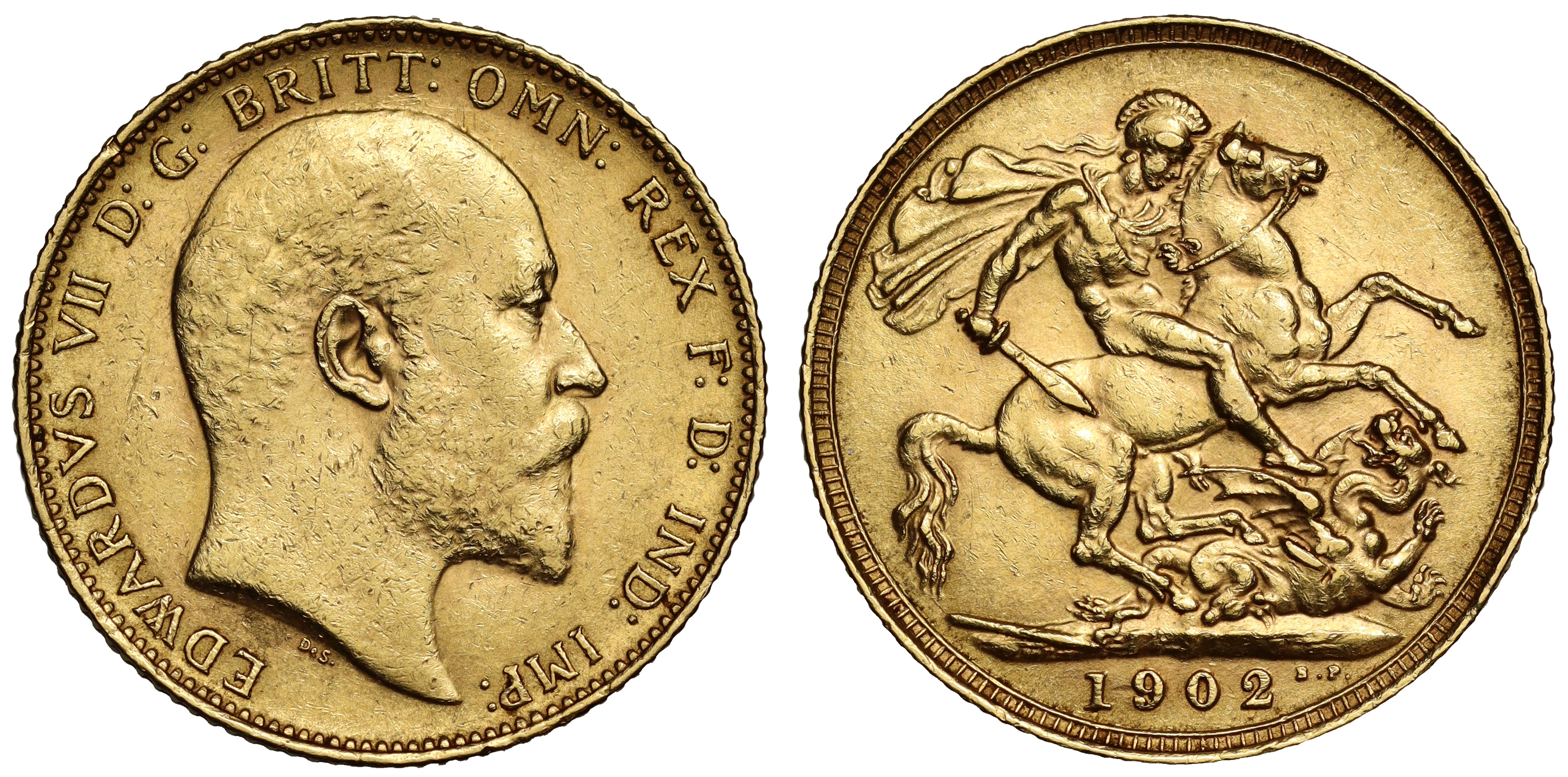 g Edward VII (1901-10), gold Sovereign, 1902, Coronation year, bare head right, De S. below truncation for engraver George W De Saulles, Latin legend and toothed border surrounding, EDWARDVS VII D: G: BRITT: OMN: REX F:D: IND: IMP:, rev. St George slaying the dragon with sword, date in exergue, B.P. initials to upper right of exergue for designer Benedetto Pistrucci, 7.98g (Bentley 346; Hill 174; Bull EGC 1405; MCE 621; S.3969). Once cleaned with some flecking and uneven tone, very fine.