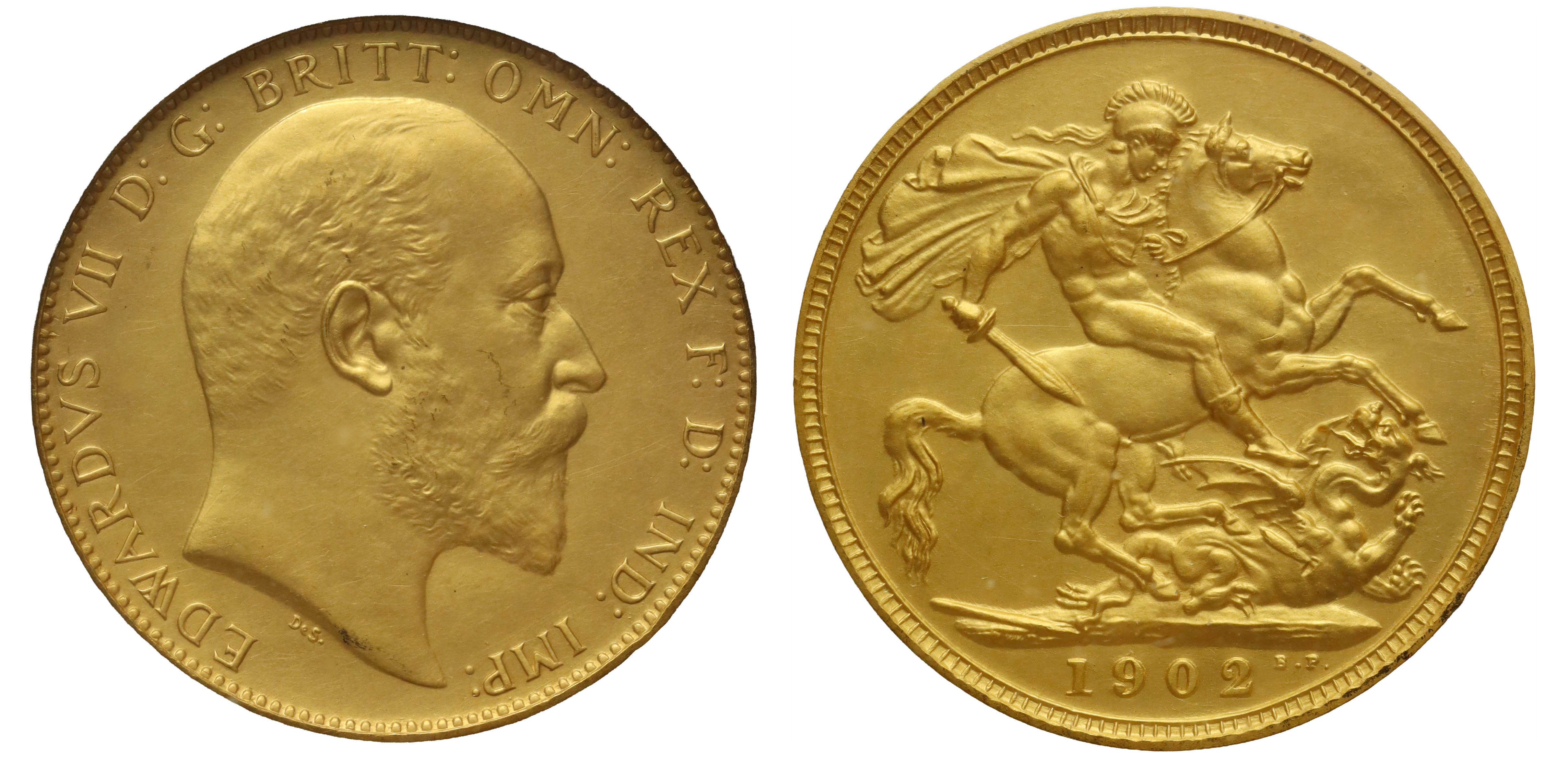 g Edward VII (1901-10), gold matt proof Sovereign, 1902, Coronation year, bare head right, De S. below truncation for engraver George W De Saulles, Latin legend and toothed border surrounding, EDWARDVS VII D: G: BRITT: OMN: REX F: D: IND: IMP:, rev. St George slaying the dragon with sword, broken lance to lower left, tiny B.P. in exergue for engraver Benedetto Pistrucci, edge milled (Hill 174A; Bull EGC 1406; WR 408; S 3969). Toned good extremely fine, all housed in Royal Mint Collector Services capsule, card with certificate.