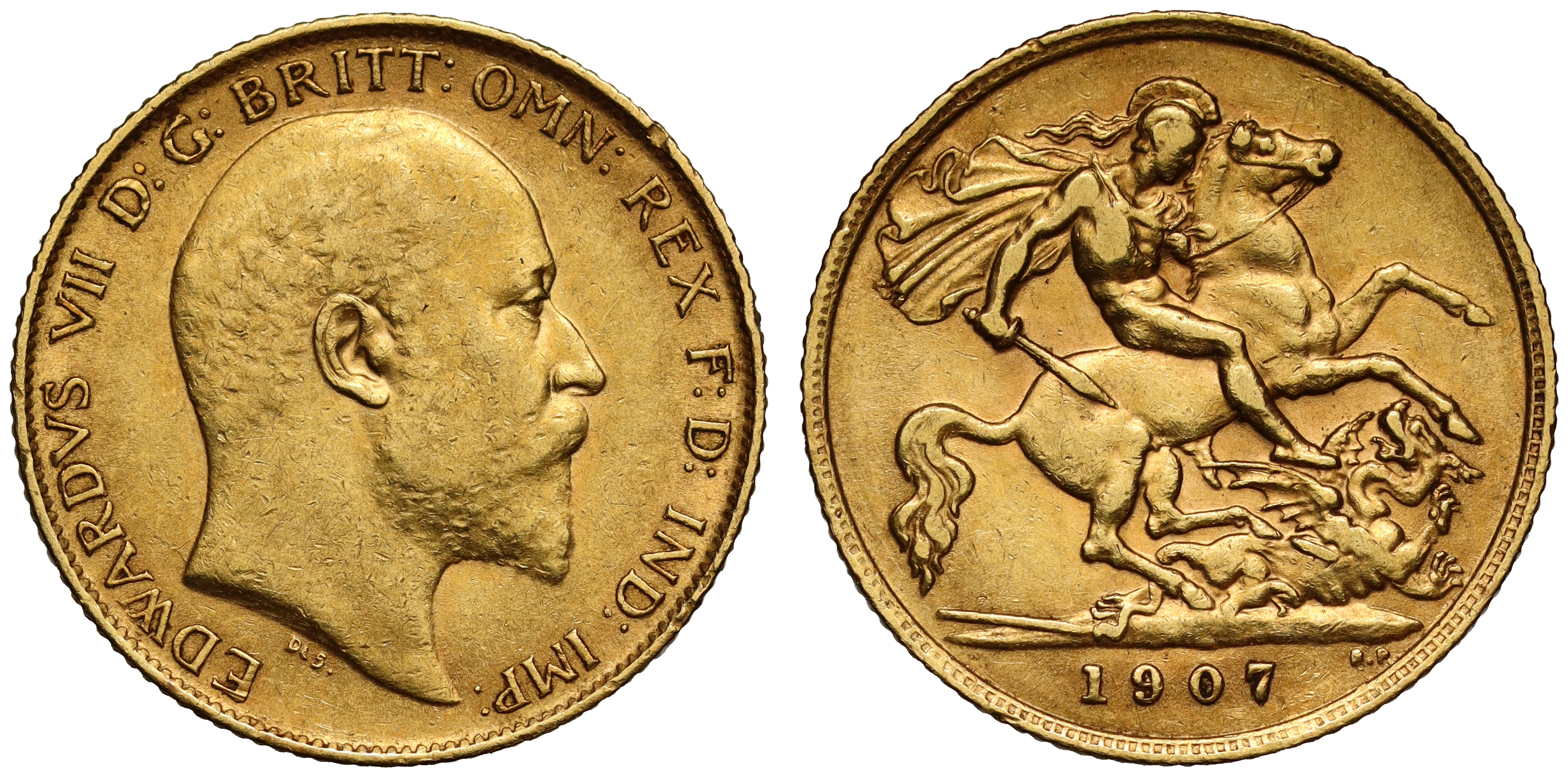 g Edward VII (1901-10), gold Half-Sovereign, 1907, bare head right, De S. below truncation for engraver George W De Saulles, Latin legend and toothed border surrounding, EDWARDVS VII D: G: BRITT: OMN: REX F: D: IND: IMP:, rev. St George slaying the dragon with sword, broken lance to lower left, date in exergue with B.P. designer initials for designer Benedetto Pistrucci, 3.97g (Hill 510; Bull EGC 1426; M.C.E. 636; S 3974B). Toned with some wear to high points, very fine.
