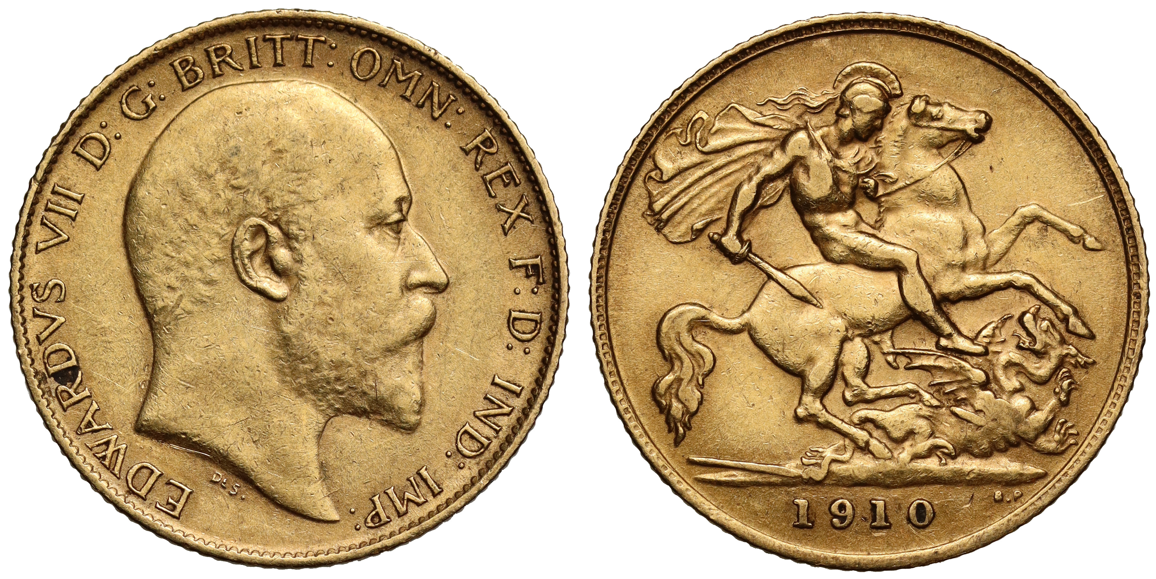 g Edward VII (1901-10), gold Half-Sovereign, 1910, bare head right, De S. below for engraver George W De Saulles, legend surrounding, EDWARDVS VII D: G: BRITT: OMN: REX F: D: IND: IMP:, rev. St George slaying the dragon right, date in exergue, B.P. to upper right of exergue for designer Benedetto Pistrucci, 3.97g (Hill 513; Bull EGC 1429; MCE 639; S.3974B). Toned with some residual dirt both sides and wear, almost very fine.