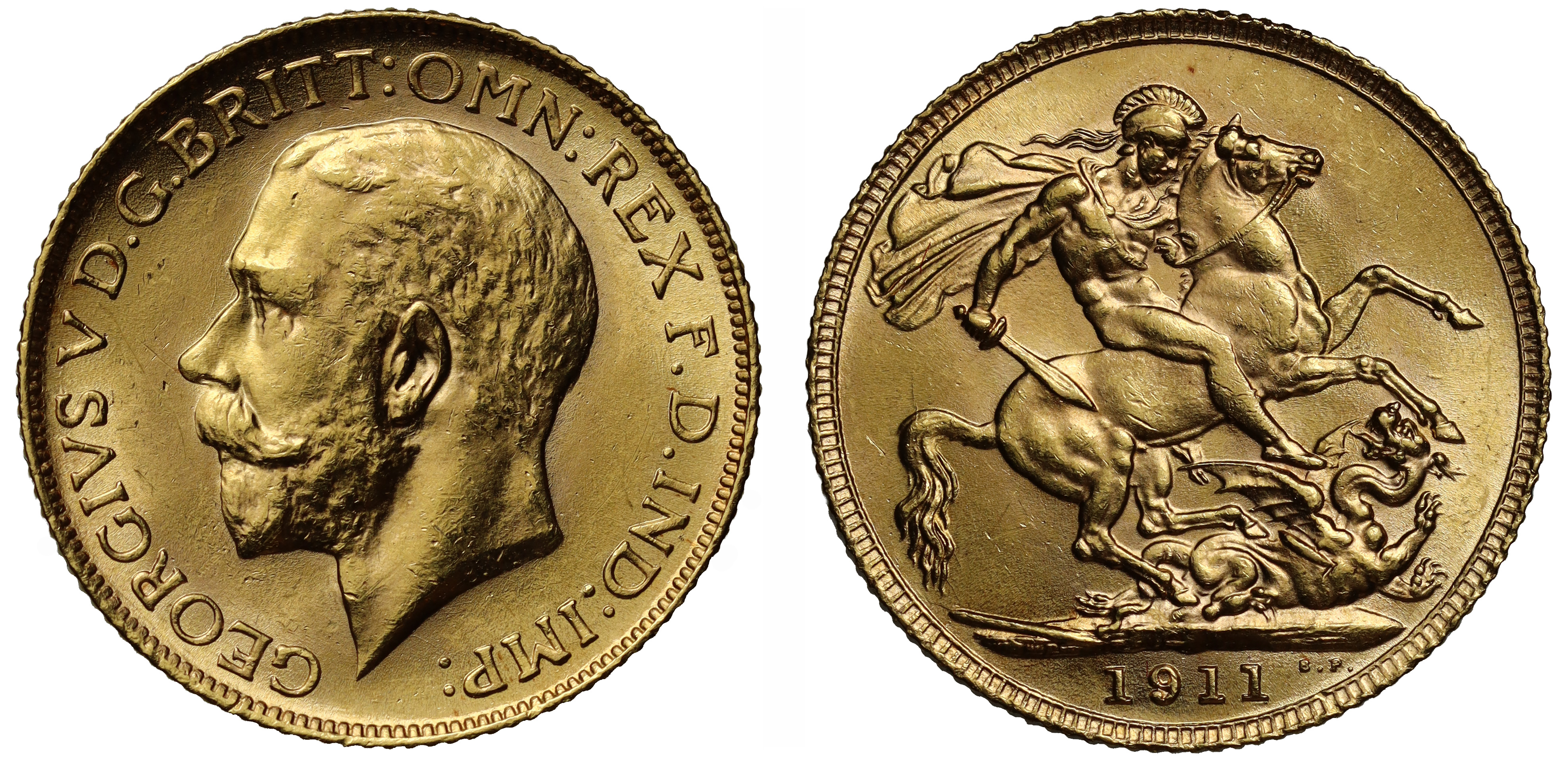 g George V (1910-36), gold Sovereign, 1911, Coronation year, bare head left, B.M. on truncation for engraver Bertram Mackennal, Latin legend and toothed border surrounding, GEORGIVS V D. G. BRITT: OMN: REX F. D. IND: IMP:, rev. St. George slaying the dragon right, WWP under broken lance for Master of the Mint William Wellesley Pole, date in exergue, B.P. to upper right of exergue for designer Benedetto Pistrucci, 8.00g (Bentley 357; Hill 213; Bull EGC 1432; S.3996). Some hairline scratches in field and nicks on head, otherwise extremely fine.