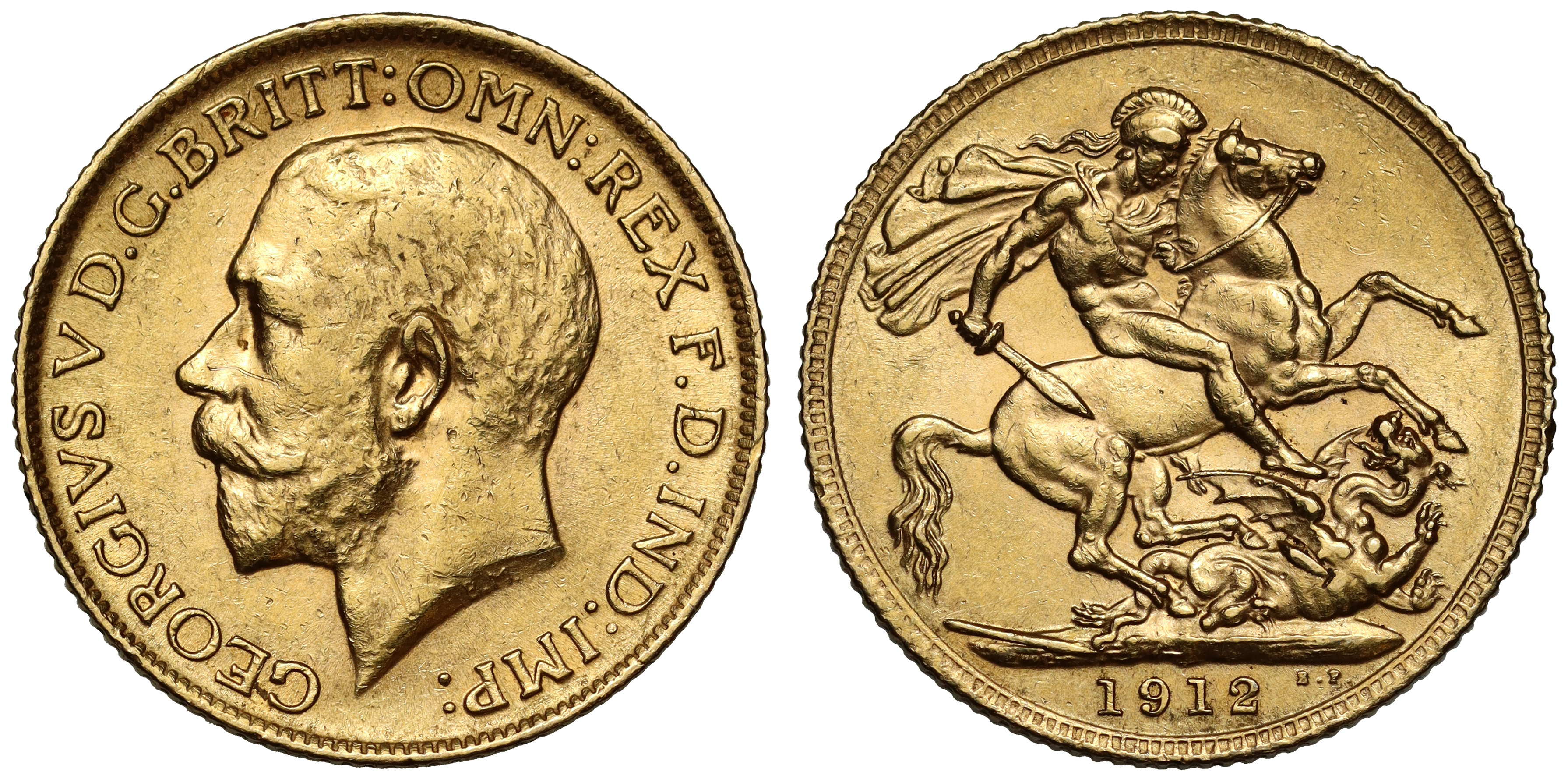 g George V (1910-36), gold Sovereign, 1912, bare head left, B.M. on truncation for engraver Bertram Mackennal, GEORGIVS V D.G. BRITT: OMN: REX F.D. IND: IMP:, rev. St George slaying the dragon right, date in exergue, B.P. to upper right of exergue for designer Benedetto Pistrucci, 7.98g (Hill 214; Bull EGC 1435; MCS 640; S.3996). Toned some light marks, good very fine.
