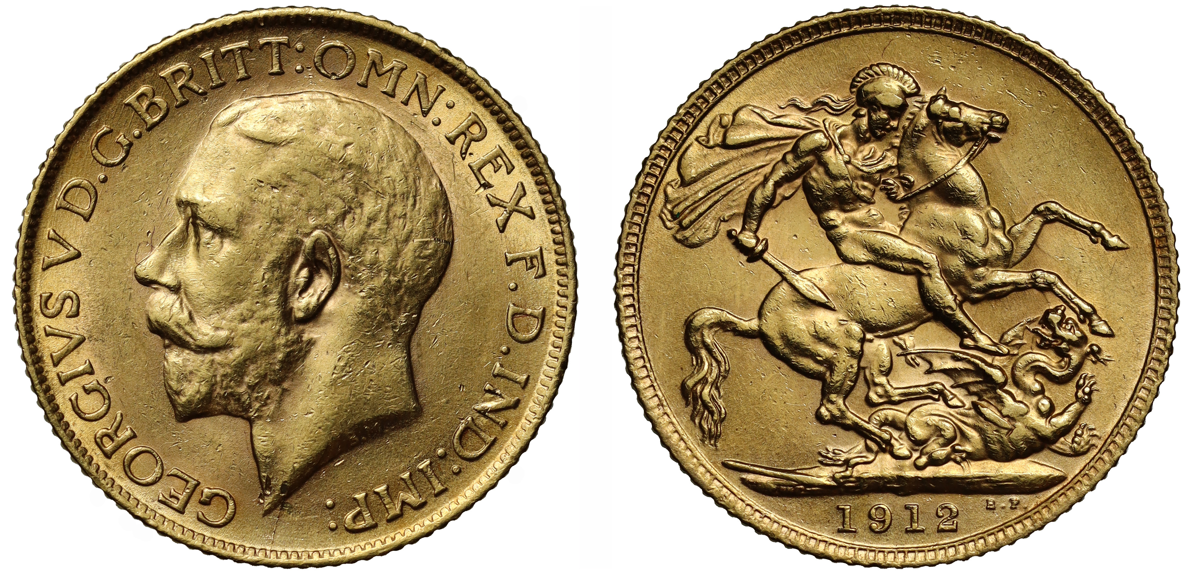 g George V (1910-36), gold Sovereign, 1912, bare head left, B.M. on truncation for engraver Bertram Mackennal, GEORGIVS V D.G. BRITT: OMN: REX F.D. IND: IMP:, rev. struck en médaille, St George slaying dragon right, WWP under lance, date in exergue, B.P. to upper right of exergue, 7.98g (Bentley 358; Hill 214; Bull EGC 1435; S.3996). Toned, some light marks, extremely fine.
