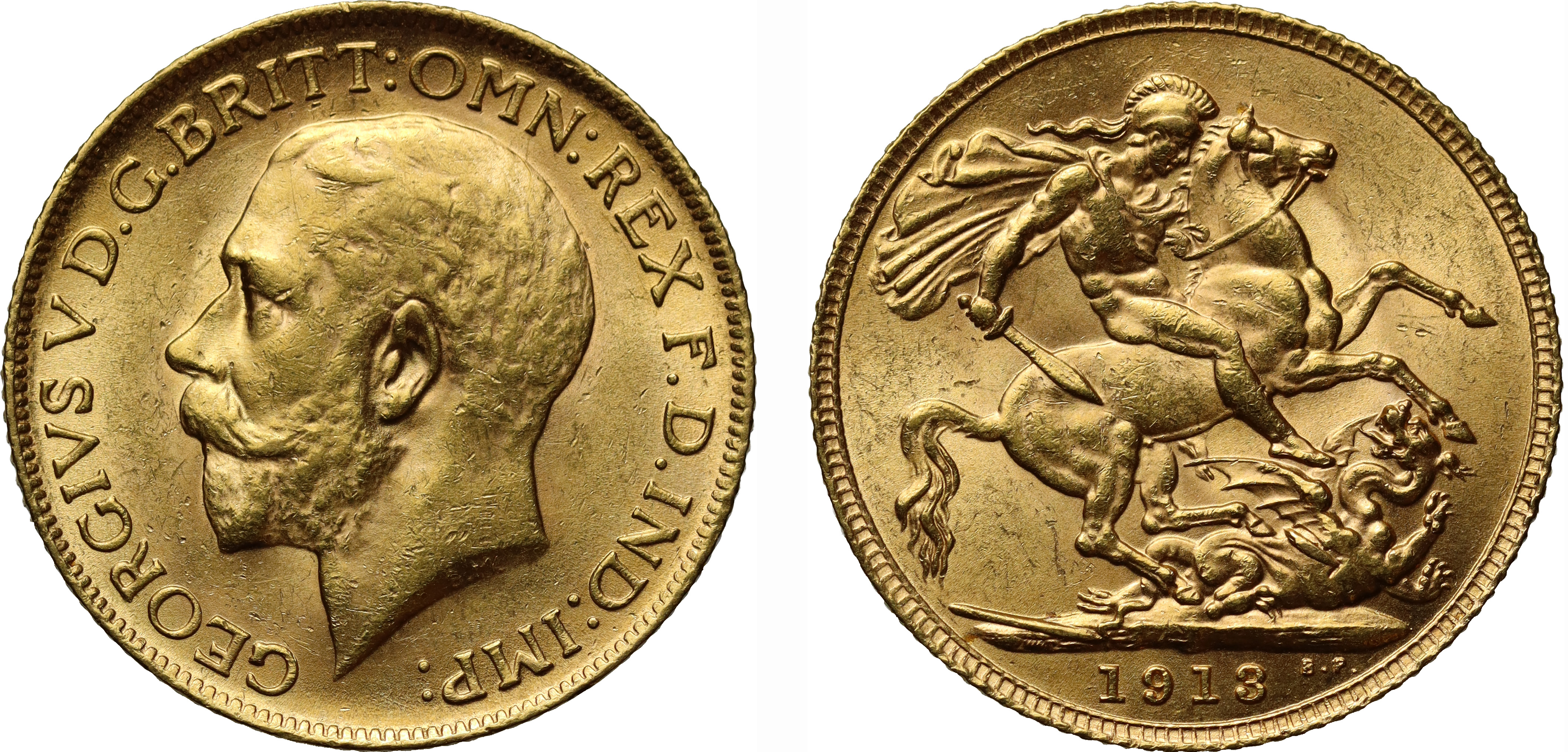 g George V (1910-36), gold Sovereign, 1913, bare head left, B.M. on truncation for engraver Bertram Mackennal, GEORGIVS V D.G. BRITT: OMN: REX F.D. IND: IMP:, rev. St George slaying the dragon right, date in exergue, B.P. to upper right of exergue for designer Benedetto Pistrucci, 7.98g (Hill 215; Bull EGC 1436; MCE 641; S.3996). Toned, extremely fine.