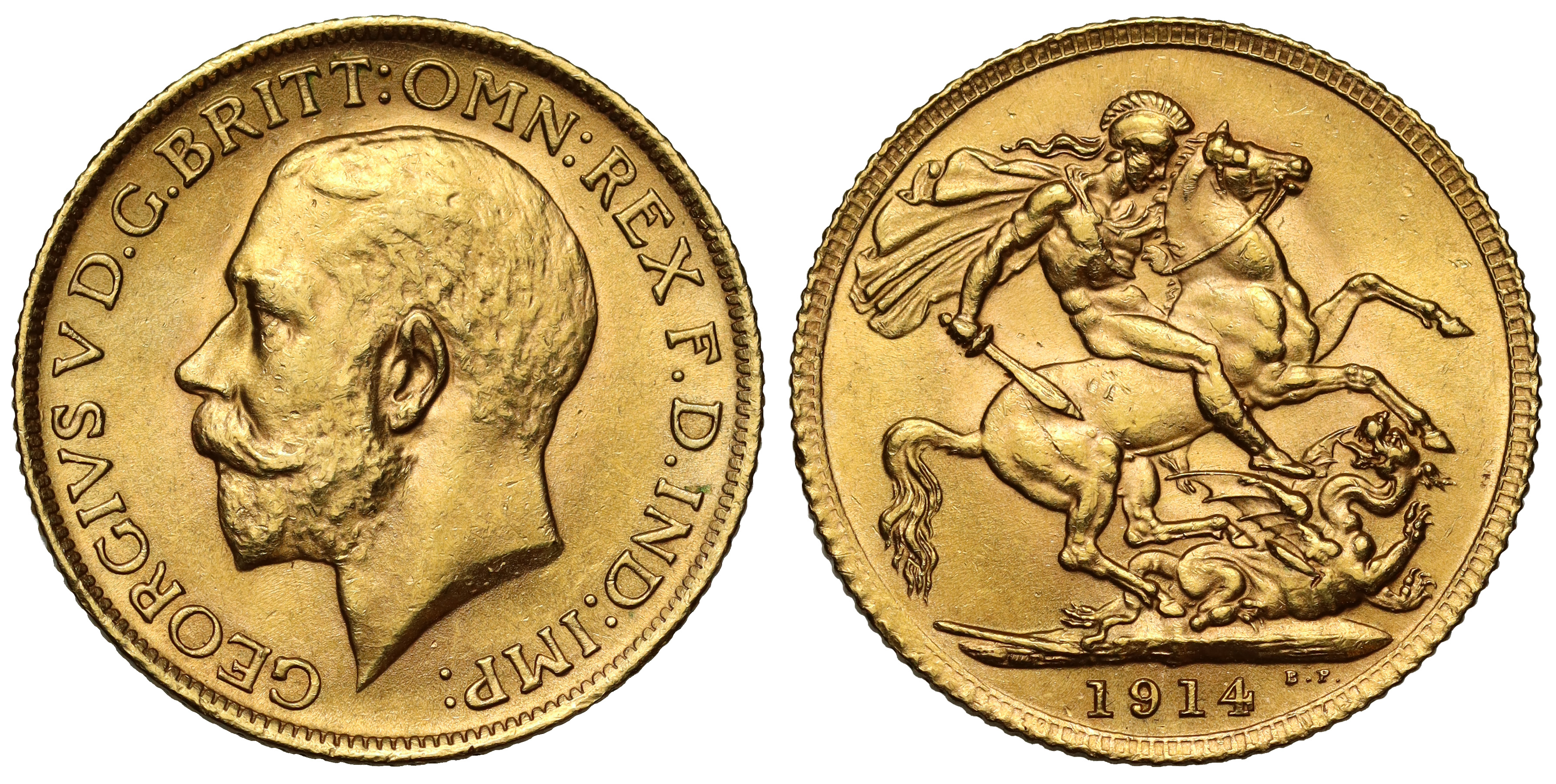 g George V (1910-36), gold Sovereign, 1914, bare head left, B.M. initials on truncation for engraver Bertram Mackennal, GEORGIVS V D.G. BRITT: OMN: REX F.D. IND: IMP:, rev. St George slaying the dragon right, date in exergue, B.P. initials to upper right of exergue for designer Benedetto Pistrucci, 7.98g (Bentley 360; Marsh 216; Bull EGC 1437; MCE 642; S.3996). Toned almost extremely fine.