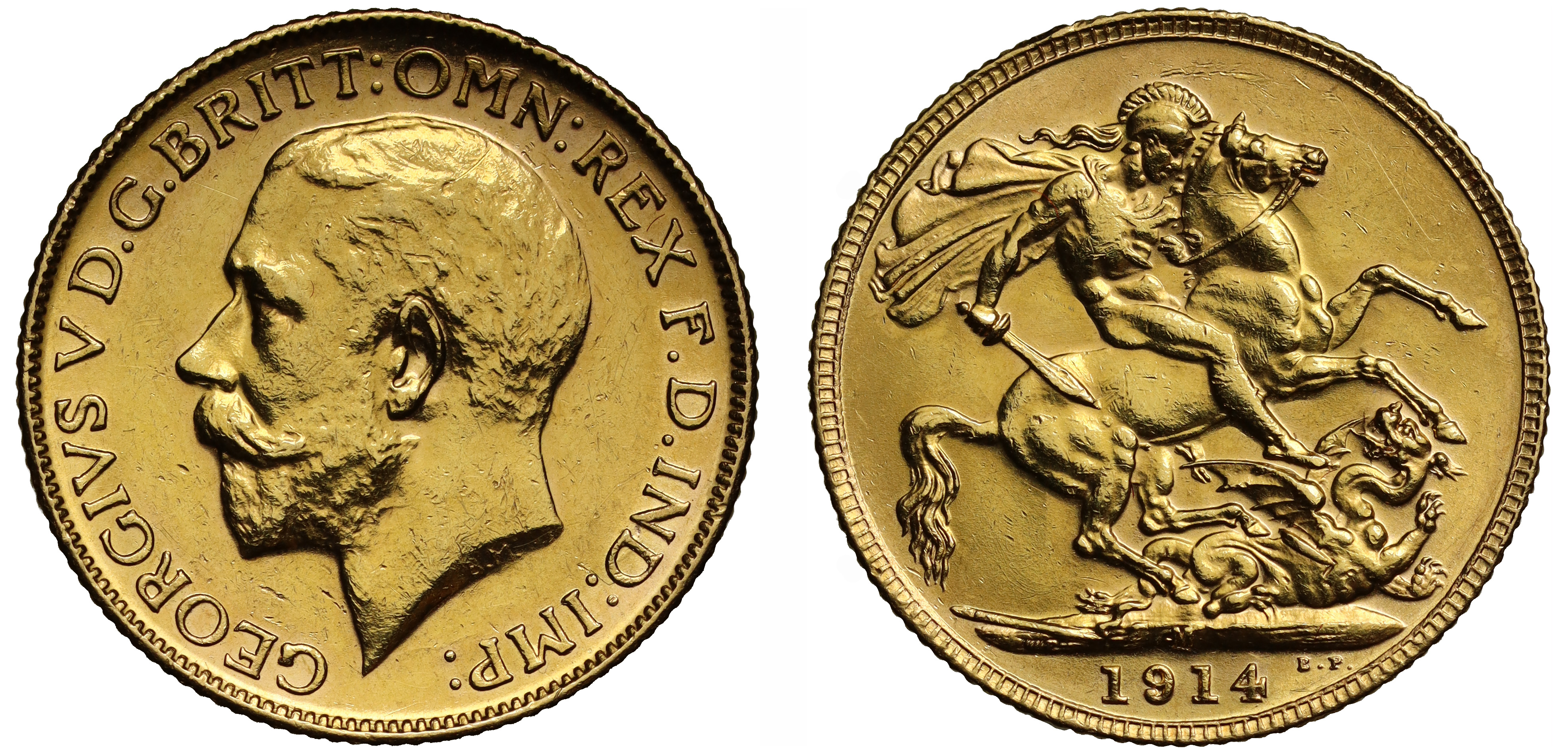 g George V (1910-36), gold Sovereign, 1914-M, Melbourne Mint, Australia, bare head left, B.M. on truncation for engraver Bertram Mackennal GEORGIVS V D.G. BRITT: OMN: REX F.D. IND: IMP:, rev. struck en médaille, St George slaying the dragon right, WWP under lance, Mint letter M at centre of ground-line, date in exergue, B.P. to upper right of exergue, 7.98g (Bentley 827; McDonald 247; Hill 232; Bull EGC 1835; S.3999). Polished, nicks and surface marks, good very fine.