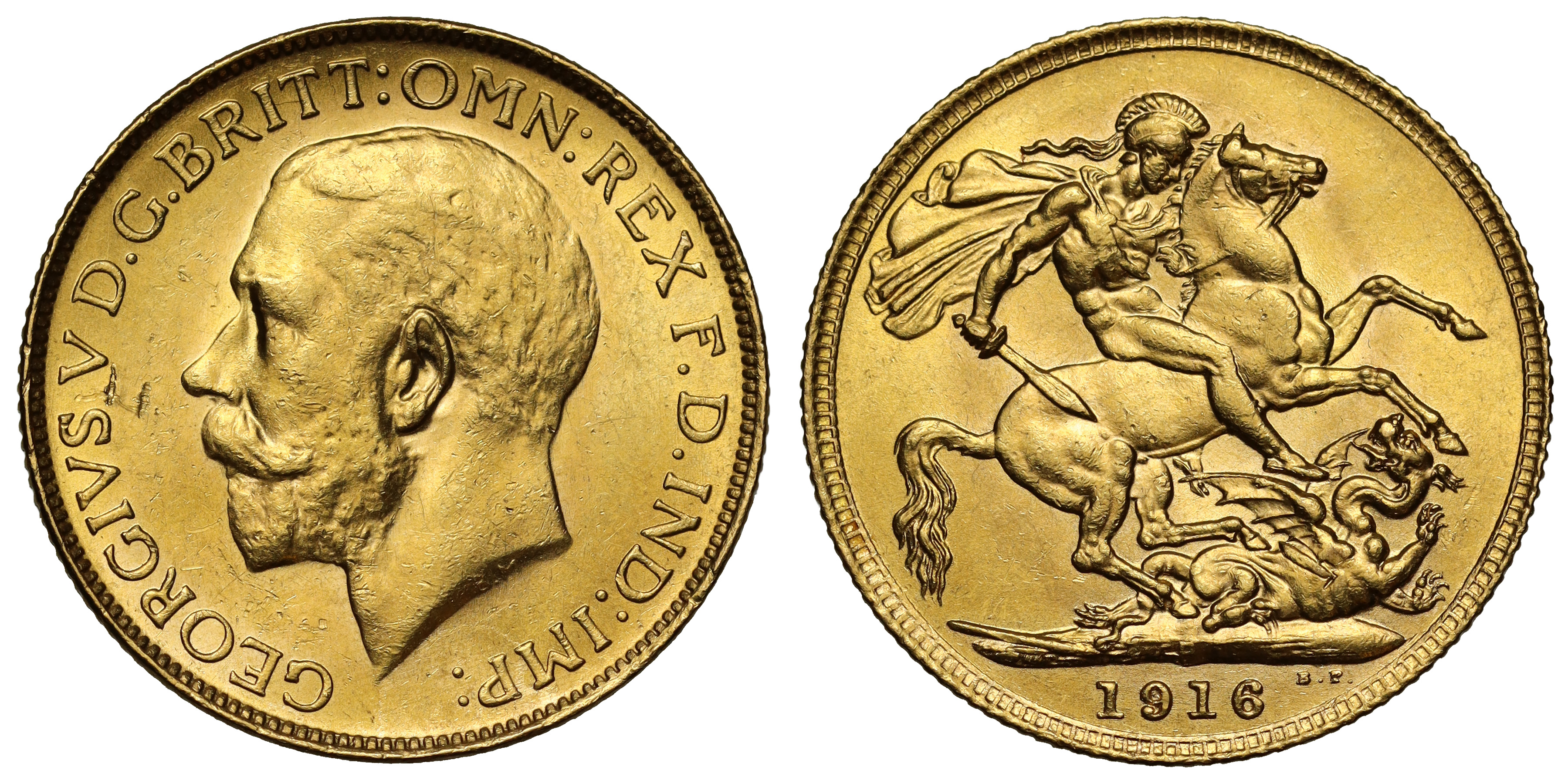 g George V (1910-36), gold Sovereign, 1916-P, Perth Mint, Australia, bare head left, B.M. on truncation, GEORGIVS V D.G. BRITT: OMN: REX F.D. IND: IMP:, rev. St George slaying the dragon right, WWP under lance, Mint letter P at centre of ground-line, date in exergue, B.P. to upper right of exergue for designer Benedetto Pistrucci, 7.98g (Bentley 862; Hill 255; Bull EGC 1883; S.4001). Once cleaned, digs in front of face, almost extremely fine.