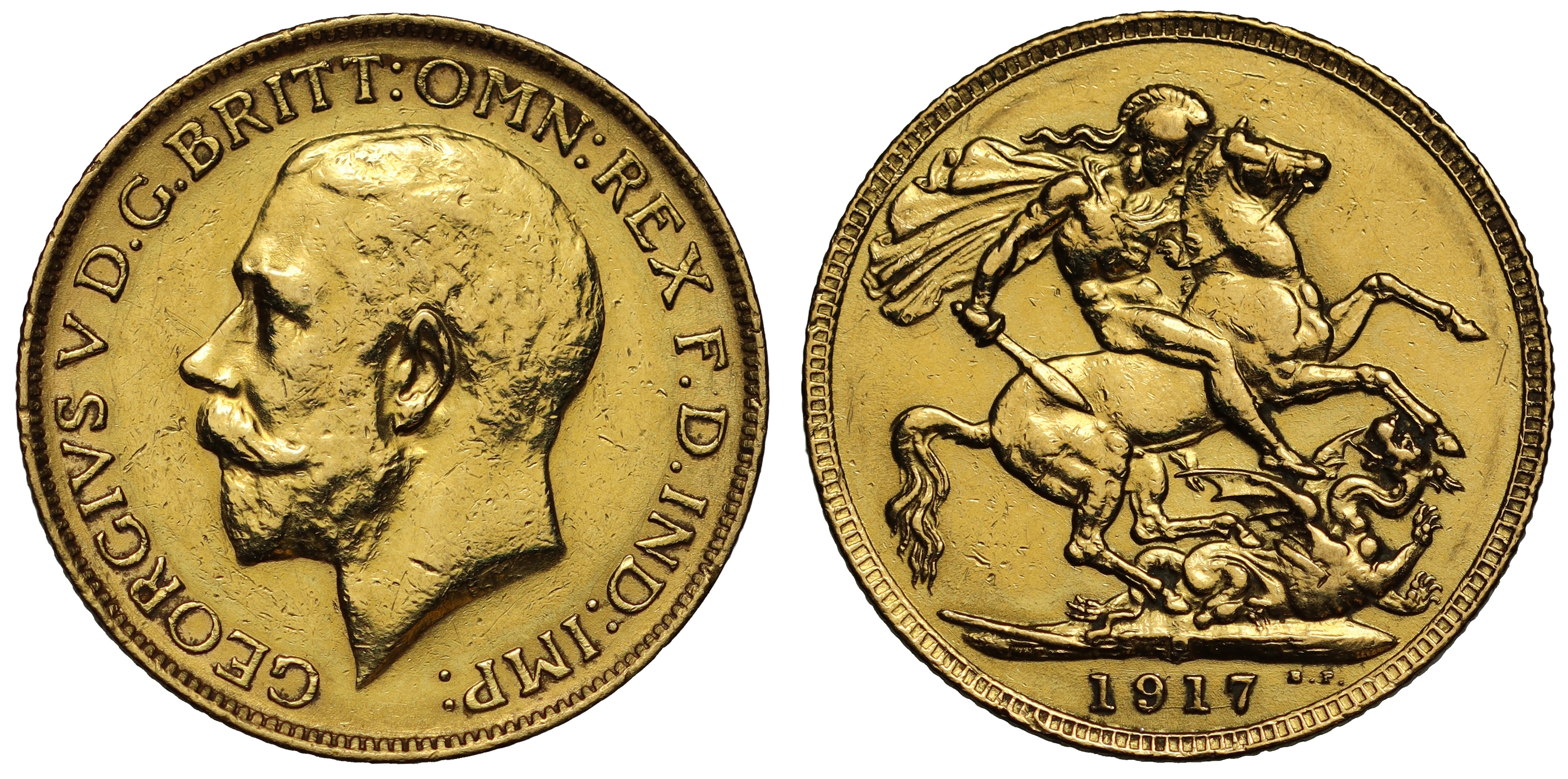 g George V (1910-36), gold Sovereign, 1917-P, Perth Mint, Australia, bare head left, B.M. on truncation, GEORGIVS V D.G. BRITT: OMN: REX F.D. IND: IMP:, rev. St George slaying the dragon right, WWP under lance, Mint letter P at centre of ground-line, date in exergue, B.P. to upper right of exergue for designer Benedetto Pistrucci, 7.98g (Bentley 863; Hill 256; Bull EGC 1884; S.4001). Brightly polished, very fine.