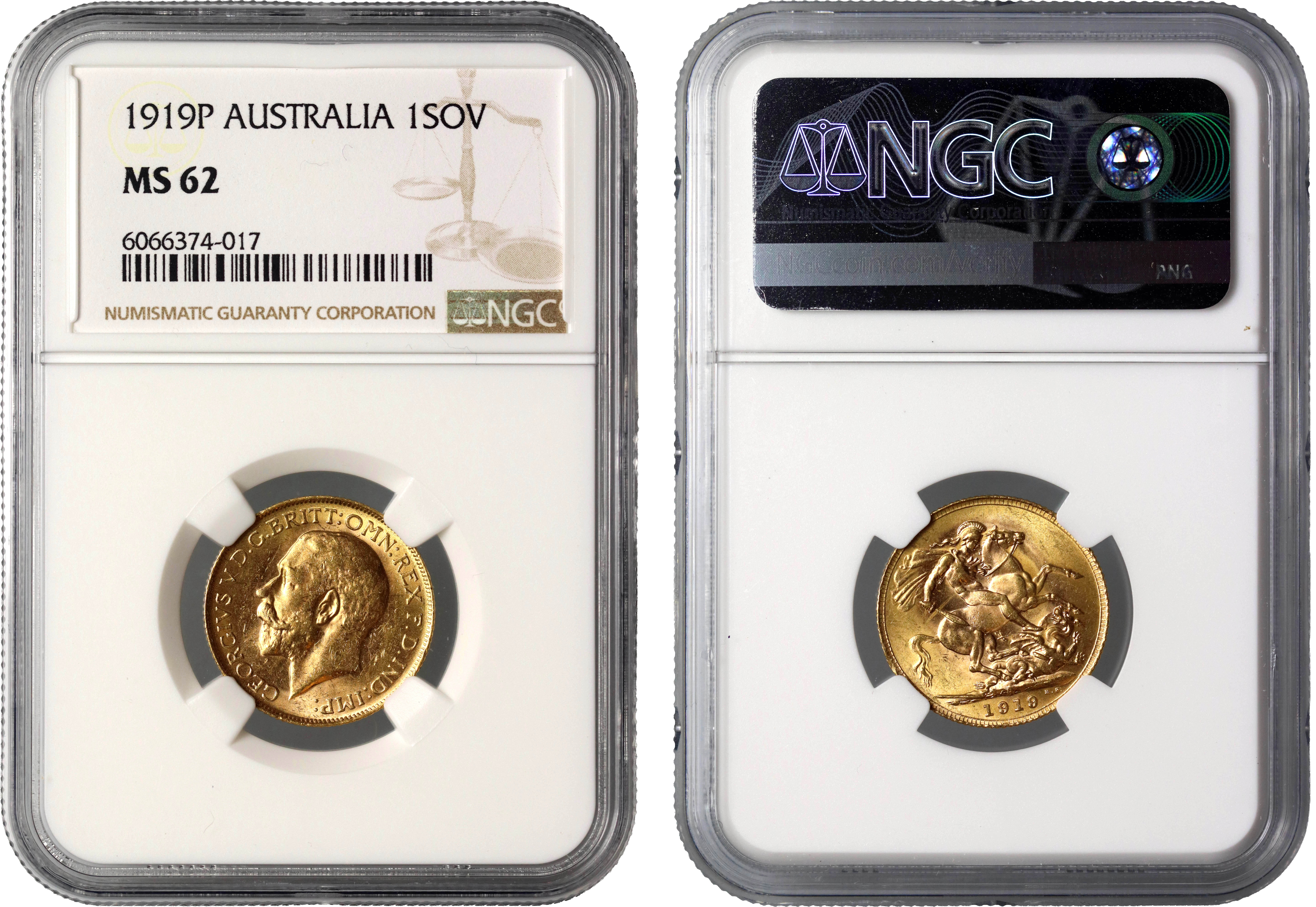 g George V (1910-36), gold Sovereign, 1919-P, Perth Mint, Australia, bare head left, B.M. on truncation, GEORGIVS V D.G. BRITT: OMN: REX F.D. IND: IMP:, rev., St George slaying the dragon right, WWP under lance, Mint letter P at centre of ground-line, date in exergue, B.P. to upper right of exergue (Hill 258; S.4001). Slabbed and graded by NGC as MS62.