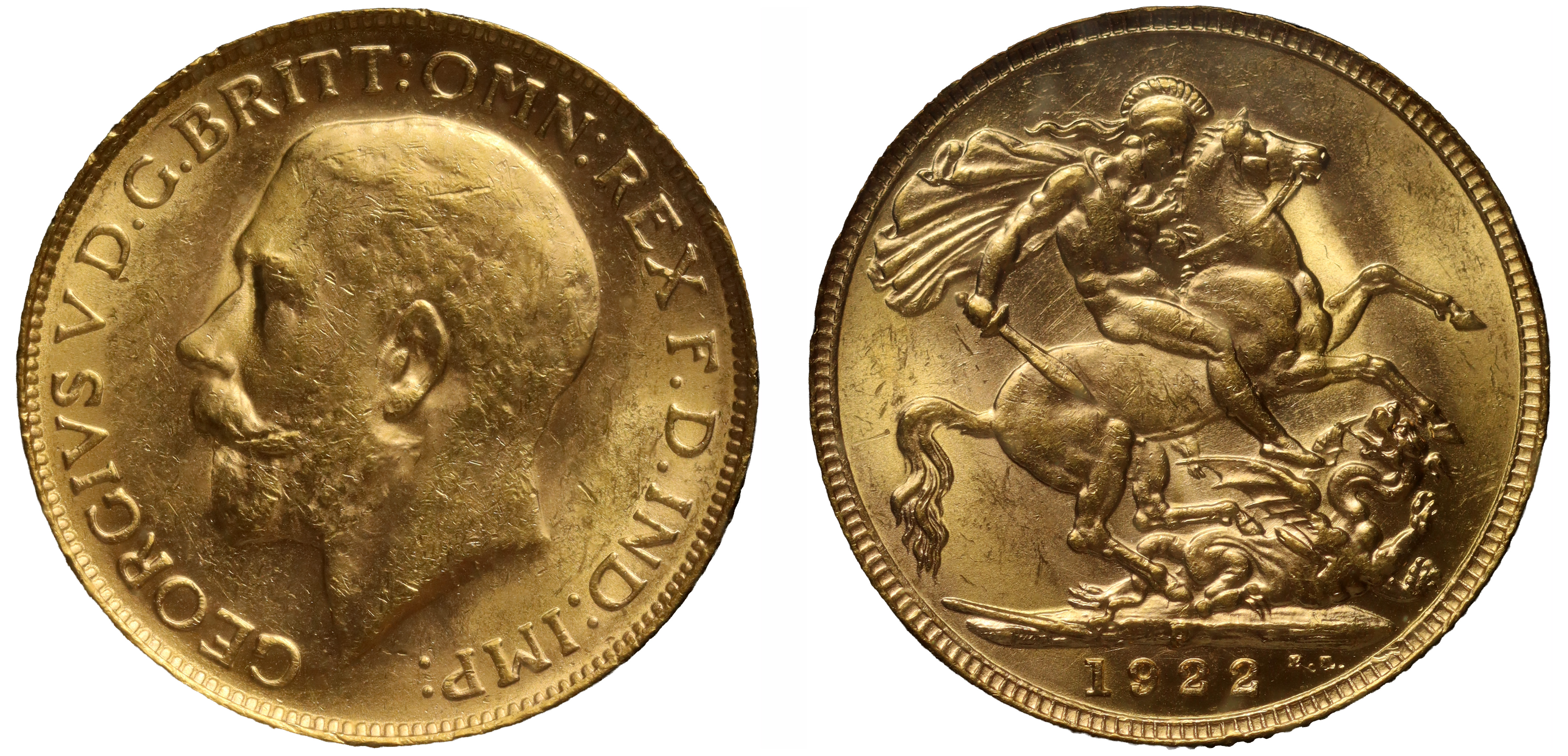 g George V (1910-36), gold Sovereign, 1922-P, Perth Mint, Australia, bare head left, B.M. on truncation, GEORGIVS V D.G. BRITT: OMN: REX F.D. IND: IMP:, rev. St. George slaying the dragon right, WWP under lance, Mint letter P at centre of ground-line, date in exergue, B.P. to upper right of exergue for designer Benedetto Pistrucci, edge milled, 7.98g (Bentley 868; Hill 261; Bull EGC 1889; S.4001). Toned, Extremely Fine, all housed in Royal Mint Collector Services capsule, card with certificate.